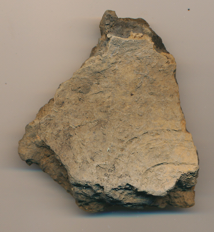 Kívül-belül piszkos téglaszínű, fekete törésű, kerámiazúzalékkal soványított, korong nélkül készített edény enyhén íves nyaktöredéke a váll indításával, melyen sekélyen behúzott hullámköteg indul.