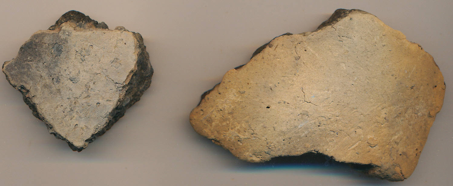 Sárga, eldolgozott külső-belső felület, fekete törésű, kevés kerámiazúzalékkal soványított anyagú, korong nélkül készített, közepesen vastag falú edény két kopott, enyhén íves oldaltöredéke.