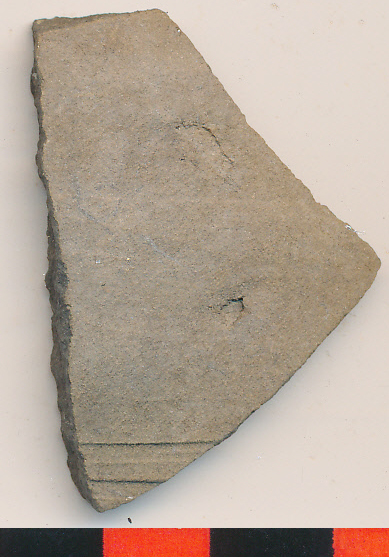 Külső felületén barnásszürke, szürke törésű, korongolt, enyhén homokos anyagú vékony oldaltöredék 2 sekélyen benyomott körbefutó vonallal.