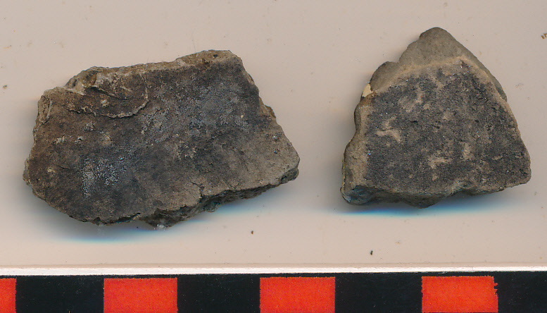 Fekete kormos külső felületű, szürke törésű, homokos anyagú, korongolt edény oldaltöredékei. Az egyiken karcolt hullámvonal indításával.