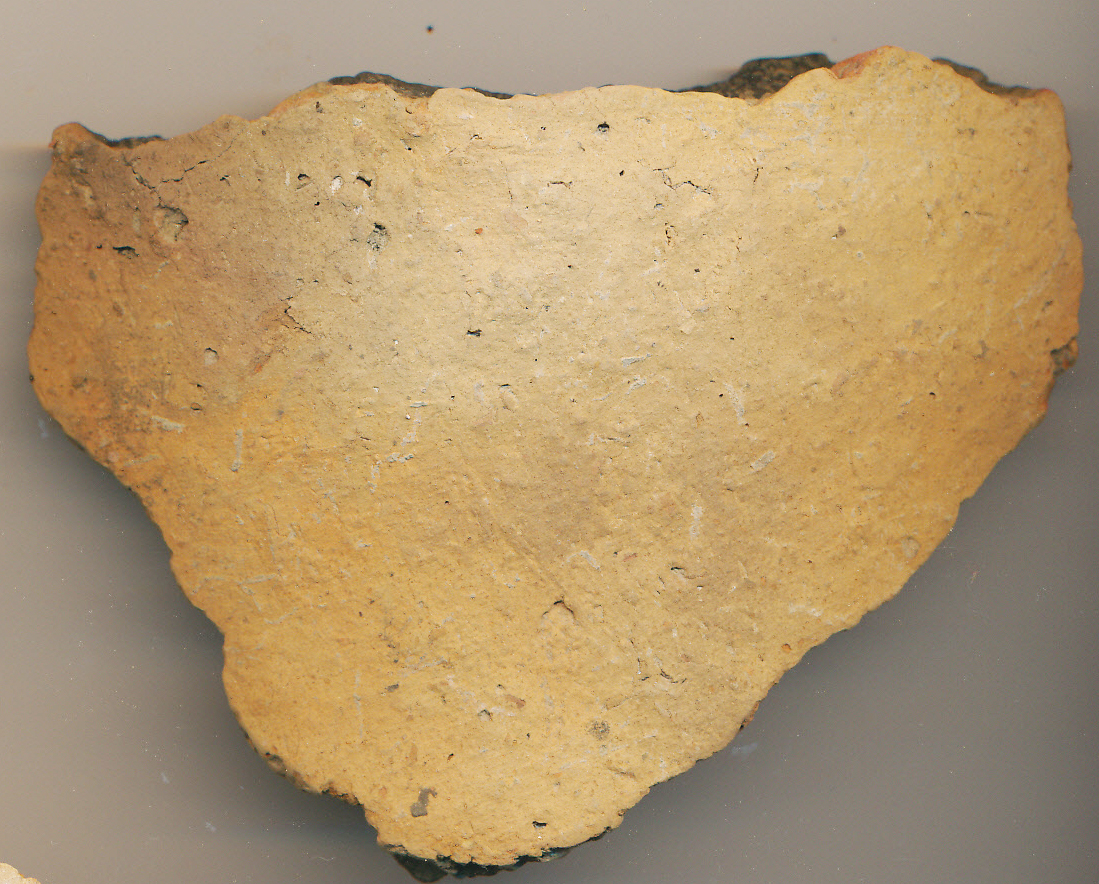 Kívül téglaszínű, belül világosszürke felületű, fekete törésű, kerámiazúzalékkal soványított, korong nélkül készített edény kicsit vastagabb, íves oldaltöredéke. Valószínűleg az előző edény töredéke.