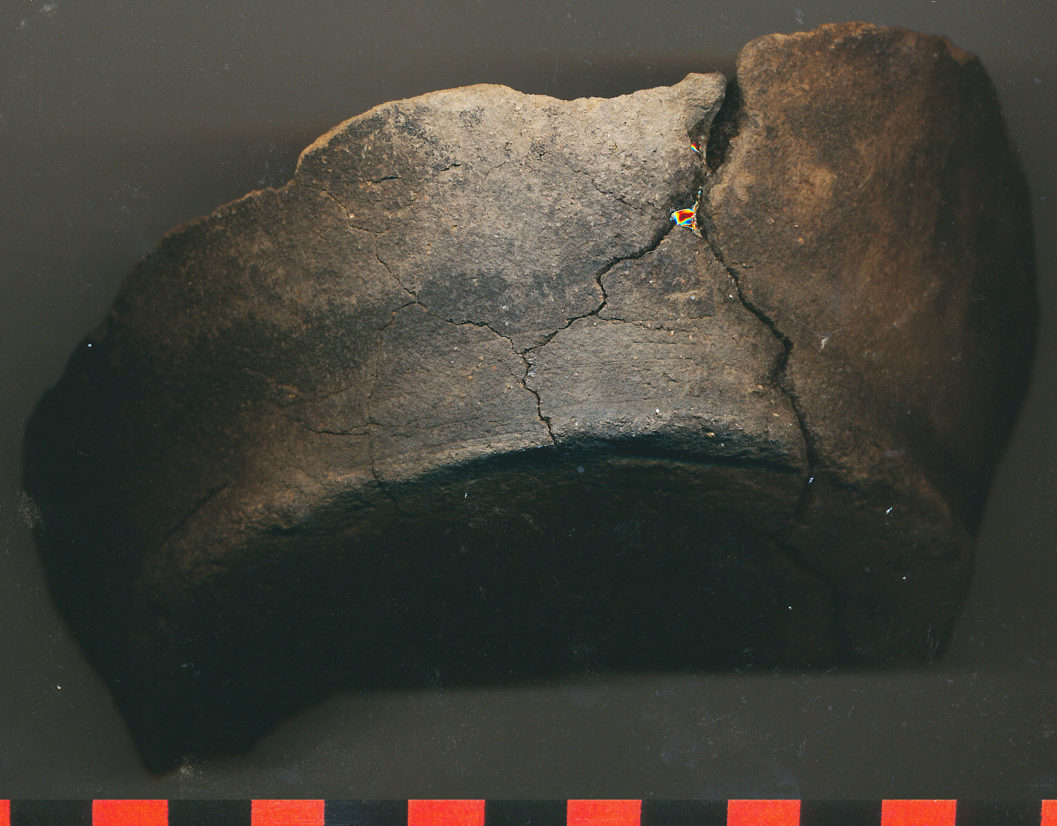 Fekete, drapp foltos, homokos anyagú, korongolt, vastag falú nagy fazék vágott alja a felmenő fallal 3 db-ból ragasztva.