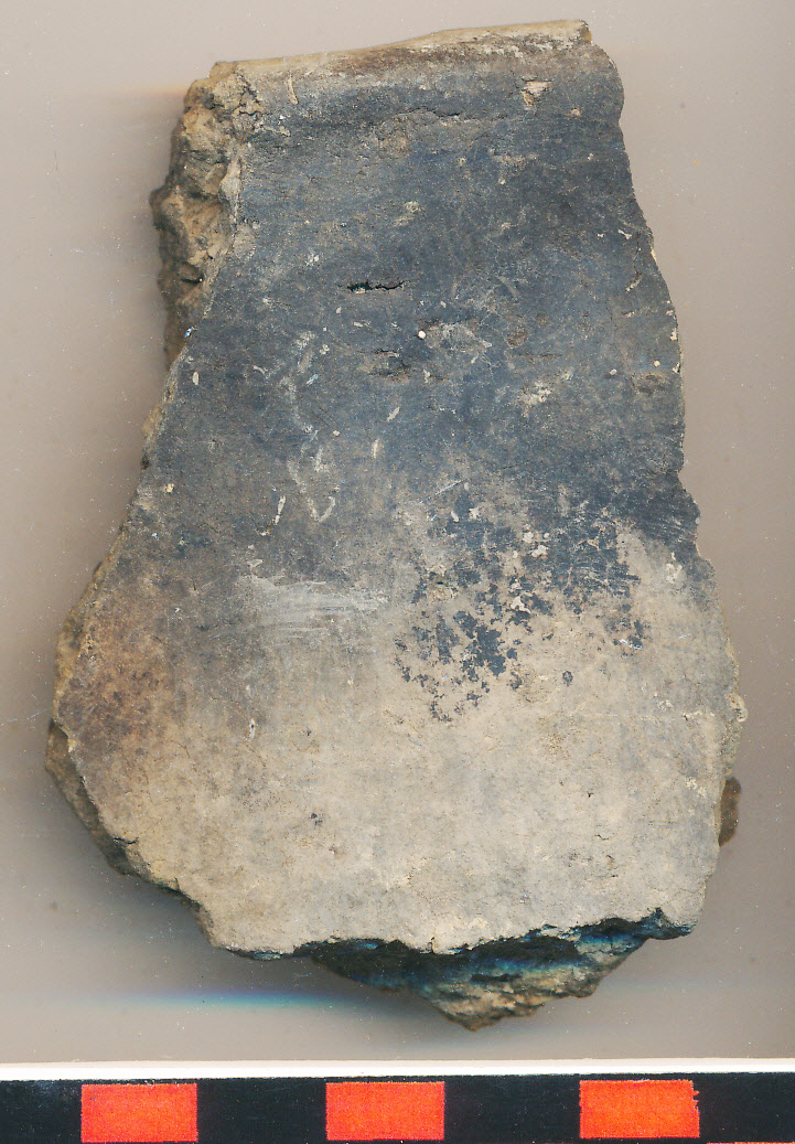 Kívül-belül eldolgozott szürkésdrapp, kívül fekete foltos, szürke törésű, kerámiazúzalékkal soványított nagyobb edény enyhén vékonyodó, legömbölyített peremének töredéke.