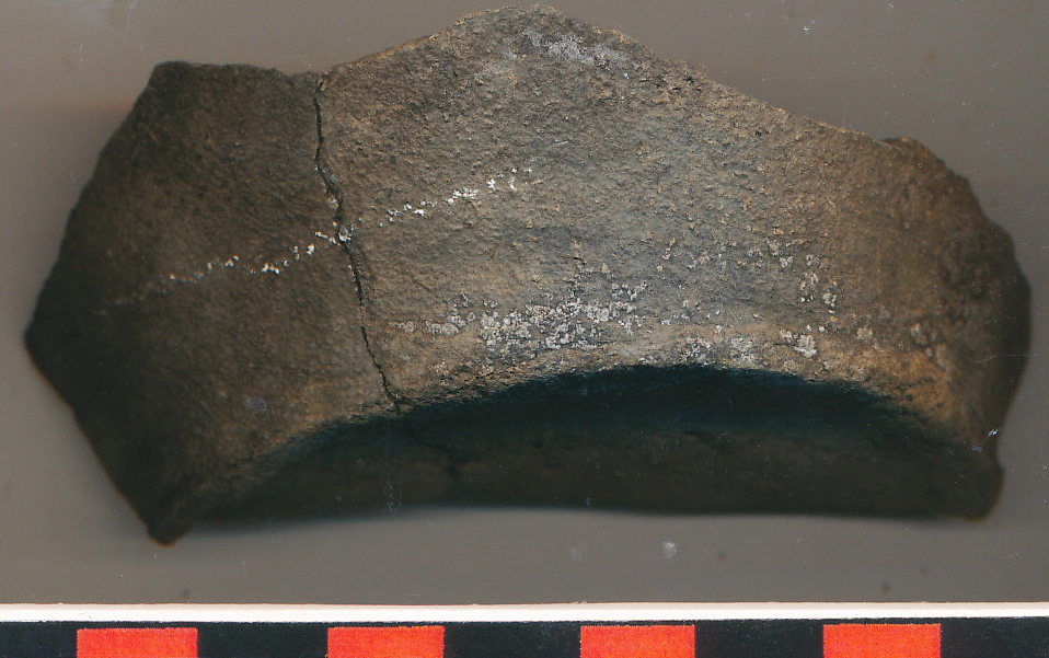 Sötétszürke, homokos anyagú, korongolt kisebb edény kis peremmel kiképzett, enyhén benyomott aljtöredéke a felmenő fal indításával, 2 db-ból ragasztva.