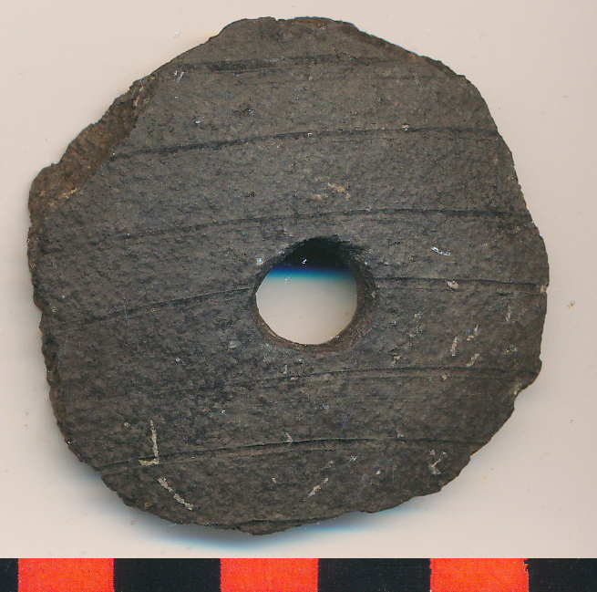 Fekete, homokos anyagú, korongolt, íves oldaltöredékből faragott orsókarika, rajta 6 körbefutó, karcolt vonallal.