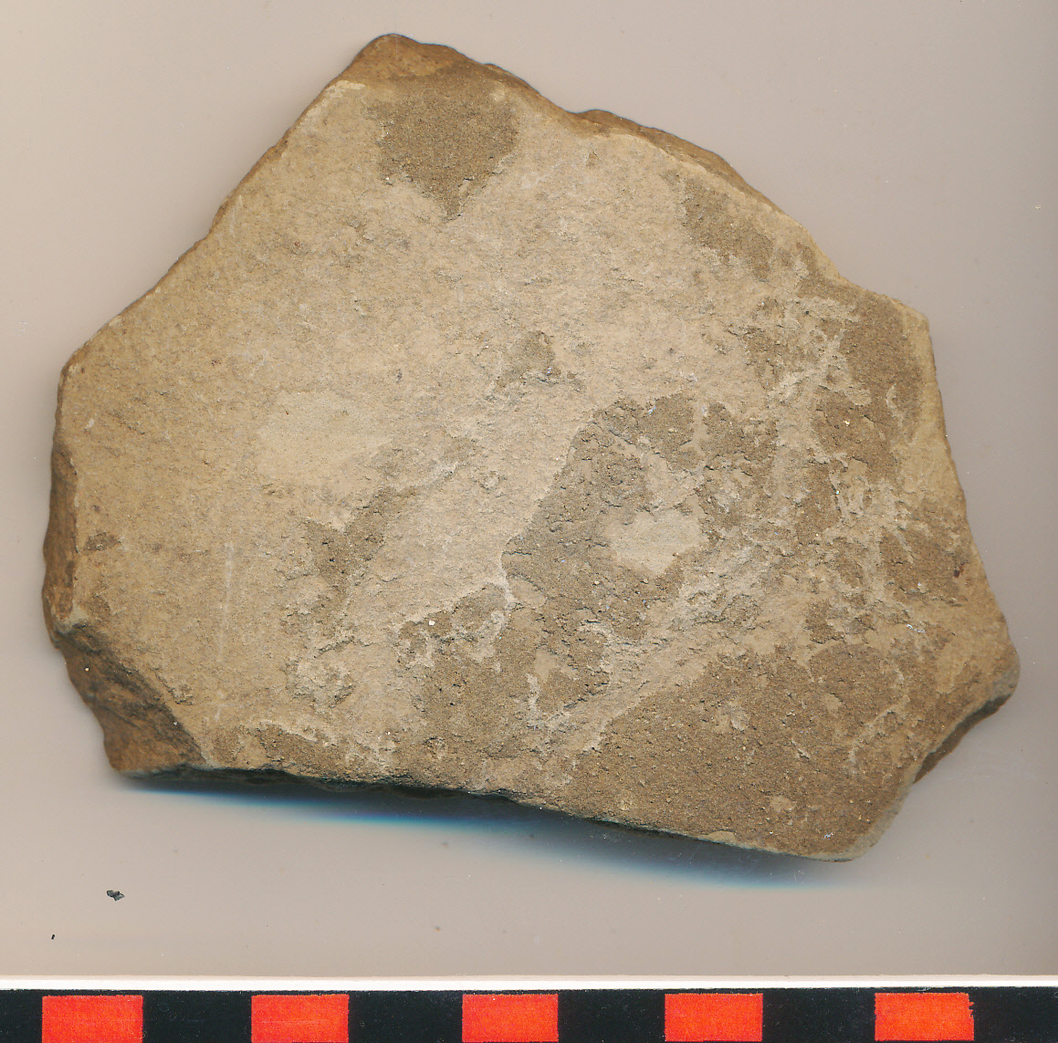 Piszkosszürke, korongolt, nehéz anyagú,nagyobb edény íves, erősen kopott oldaltöredéke.