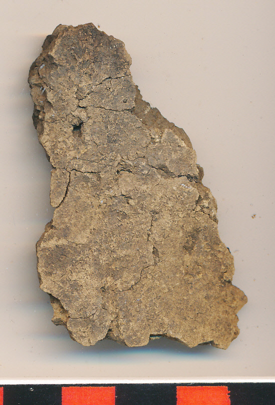 Sárgásbarna, eldolgozott külső felületű, fekete törésű, vékonyabb falú, durvább kivitelű oldaltöredék.