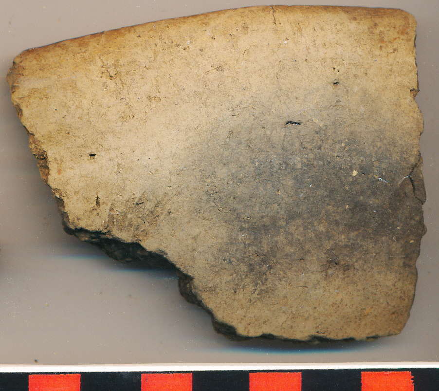 Fekete foltos, elsimított sárga külső-belső felületű, helyenként fekete törésű, kerámiazúzalékkal soványított, befelé kissé megvastagodó peremű, félgömbös, vastagabb falú tál töredéke.