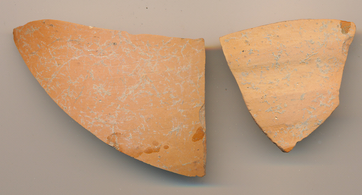 Világos téglaszínű, kívül-belül eldolgozott felületű, szürke törésű, korongolt, vékony falú edények 2 db íves oldaltöredéke.