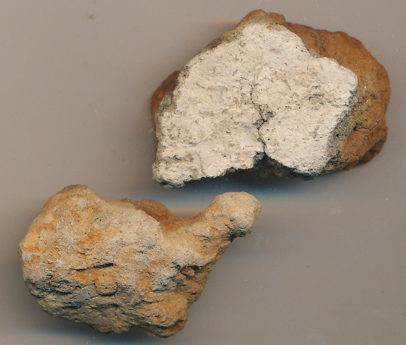 Téglsazínűre égett, szabálytalan alakú, omklékony tapasztástöredékek. Az egyiknek az egyik felülete sima, fehér felületűre, illetve ez alatt vékony rétegben szürkére égett.