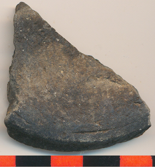 Fekete, homokos anyagú, korongolt, kisebb edény vágott alja a felmenő fal kis csonkjával.