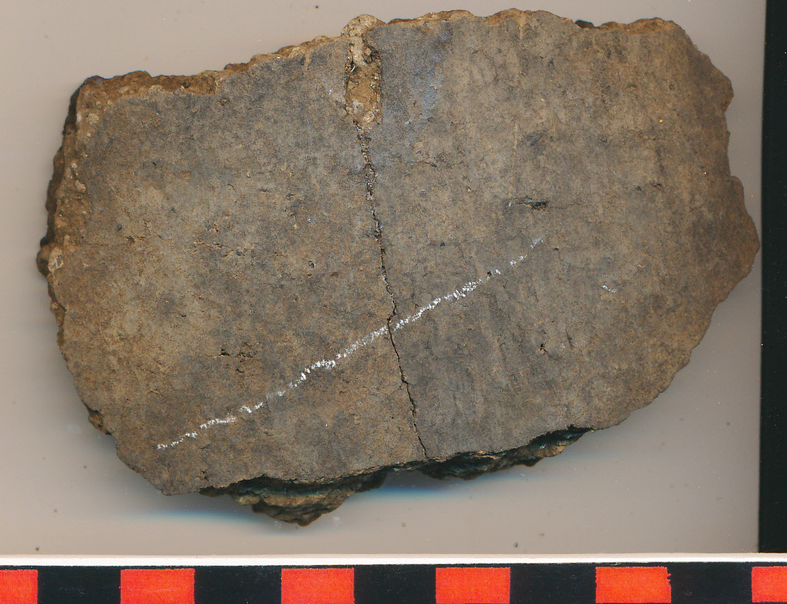 Szürkésfekete, kívül-belül eldolgozott felületű, nagyobb edény enyhén íves oldaltöredéke 2 db-ból ragasztva.