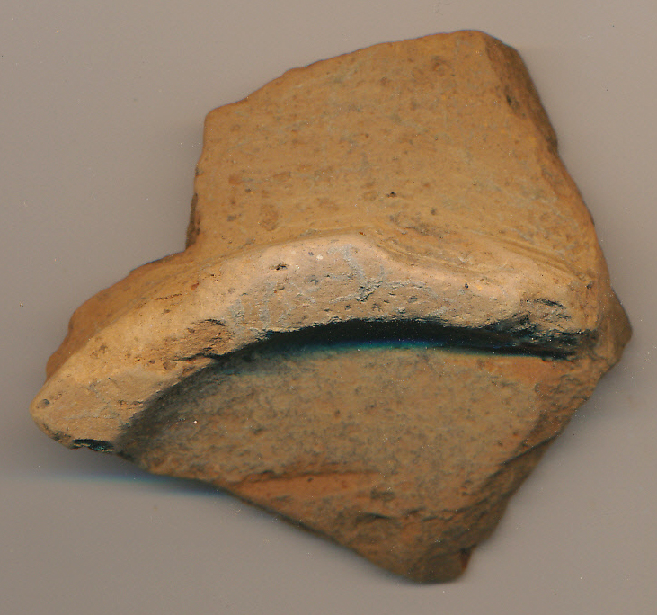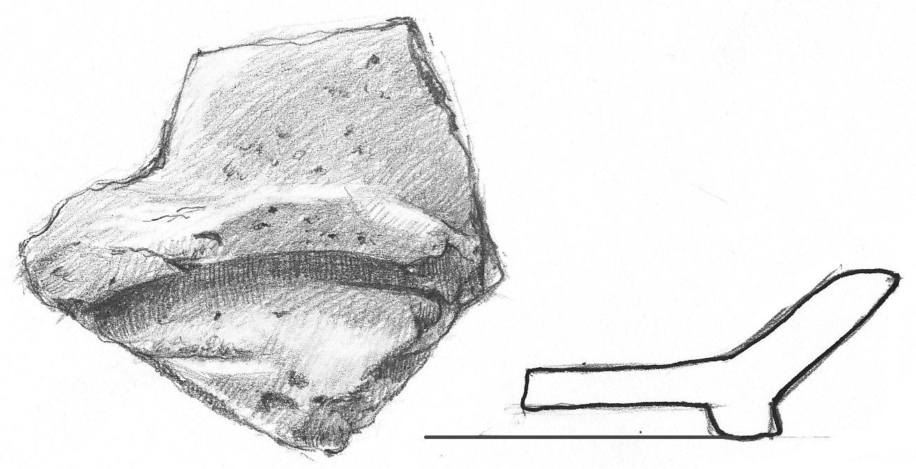 Piszkos téglaszínű, korongolt, talpgyűrűs edény kopott aljtöredéke a felmenő fal indításával.