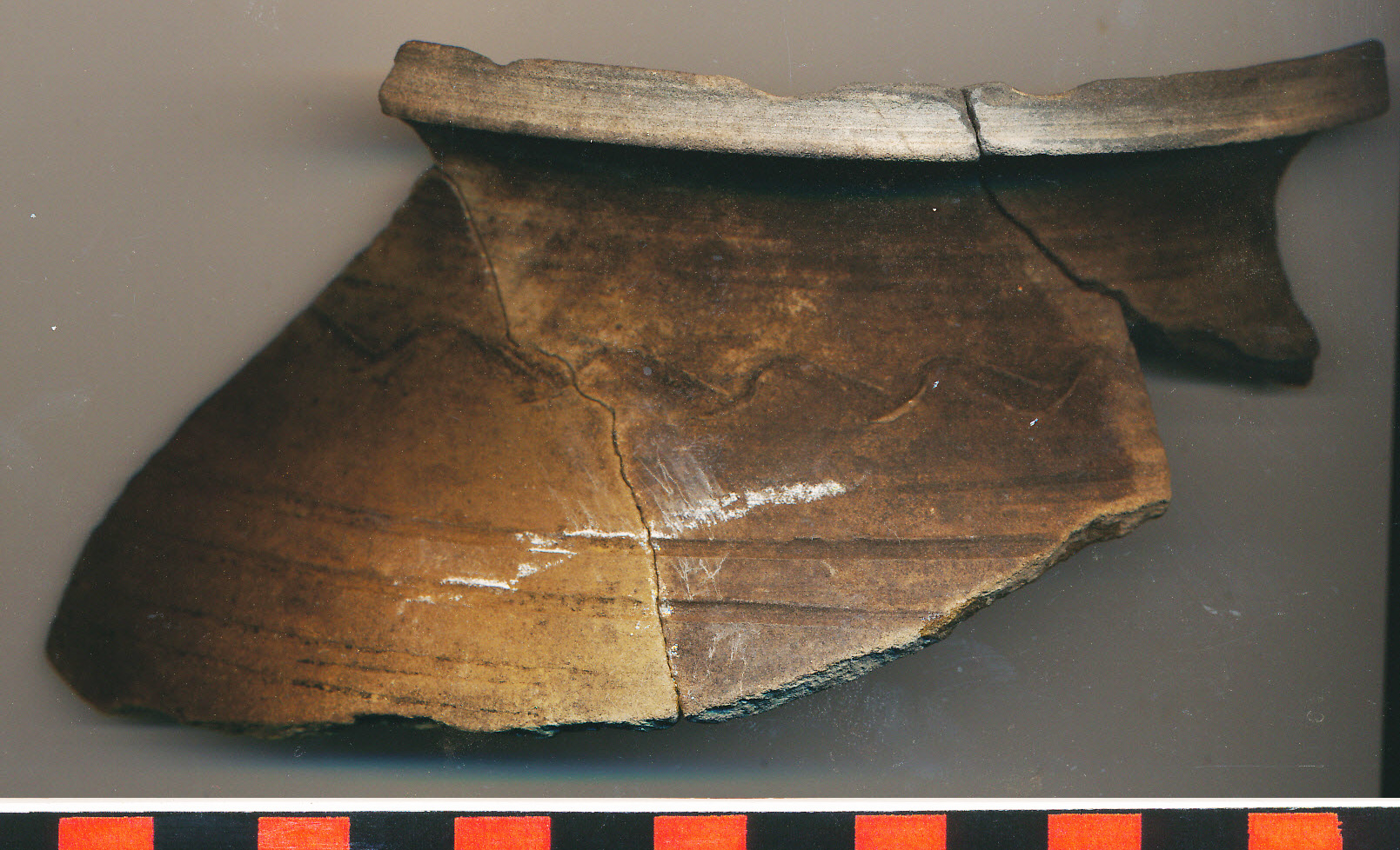 Kívül barna-fekete-szürke foltos, belsejében szürke felületű, fekete foltos, kissé homokos anyagú, korongolt, vékony falú nagyobb fazék kihajló, kissé ferdén vágott pereme, a vállon körbefutó karcolt hullámvonal alatt körbefutó bekarcolt vonalakkal. 3 db-ból ragasztott.