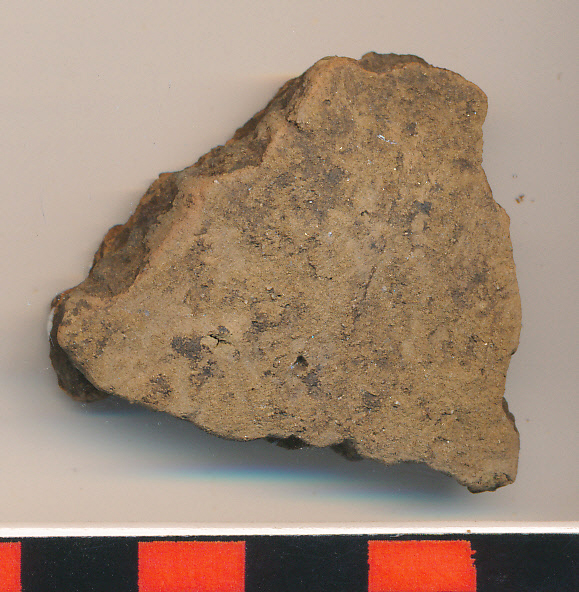 Kívül-belül világosbarna, fekete törésű, kopott oldaltöredék.