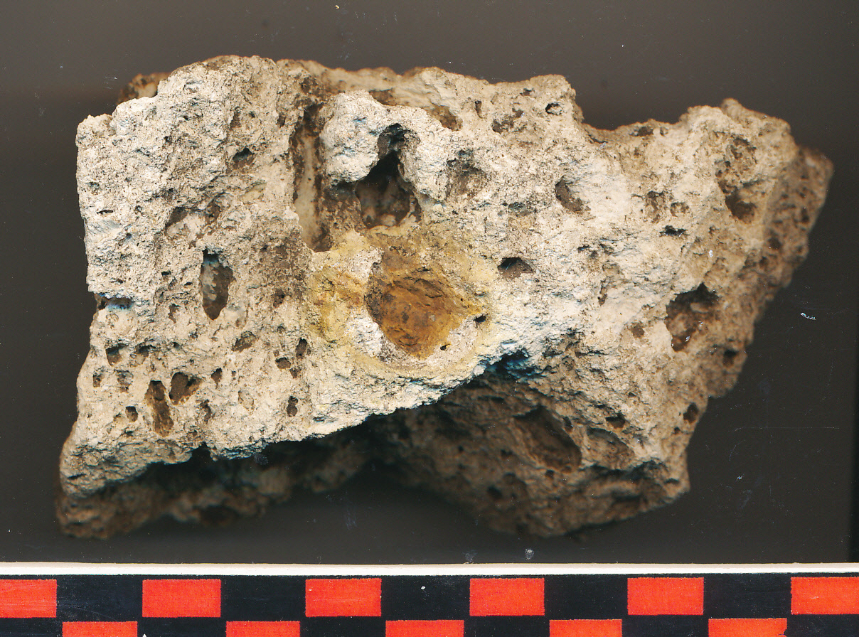 Fehér, lyukacsos, könnyebb, szabálytalan alakú kődarab, az egyik oldala simára csiszolódott.