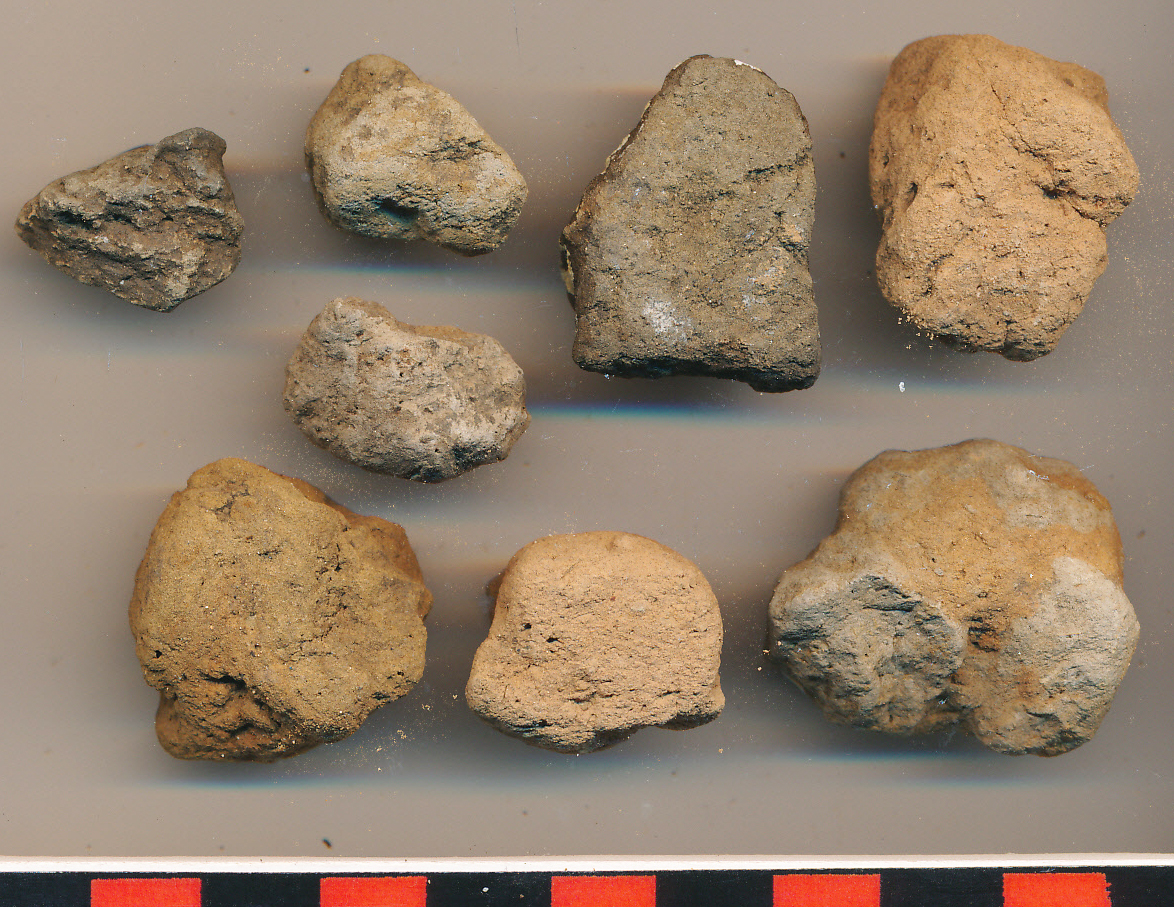 Téglaszínű, illetve szürke apró, szabálytalan alakú paticsrögök.