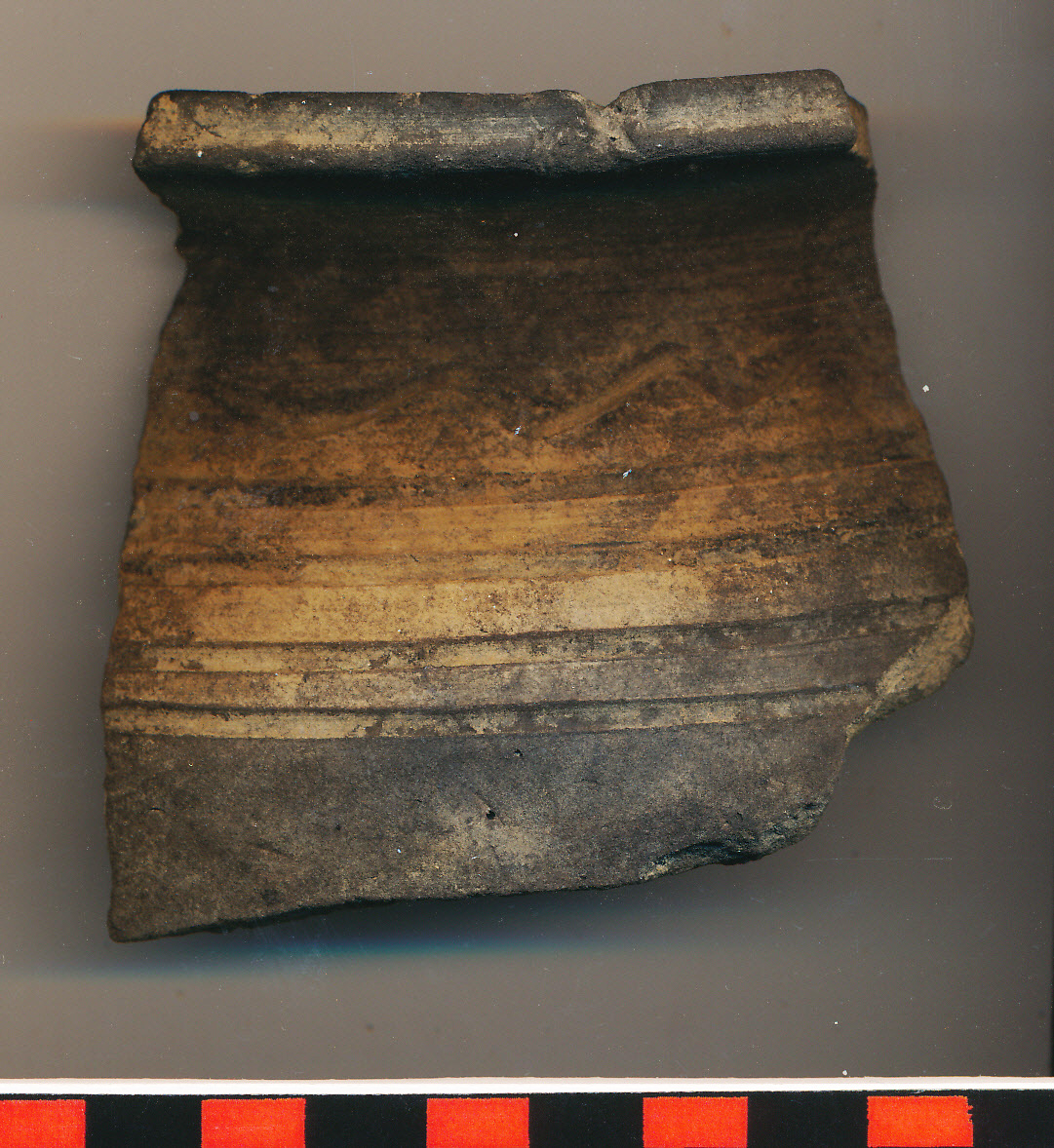 Kívül barna, fekete koromfoltos, a belsejében szürkésfekete, kissé homokos anyagú, korongolt, vékony falú nagyobb fazék kihajló, kissé ferdén vágott pereme, a vállon körbefutó karcolt hullámvonal alatt körbefutó bekarcolt vonalakkal. Valószínűleg az előző töredéke.