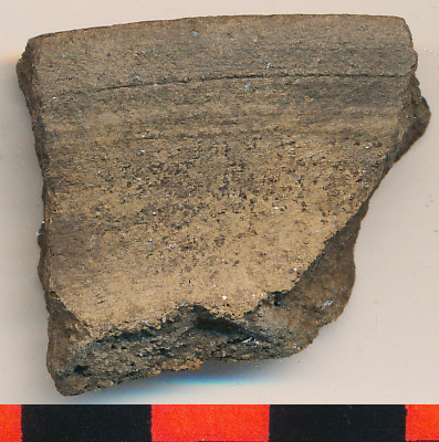 A betöltés felső rétegében: Világosbarna, fekete foltos, szürkésfekete törésű, egészen enyhén homokos anyagú, korongolt edény kihajló, elvékonyodó pereme.