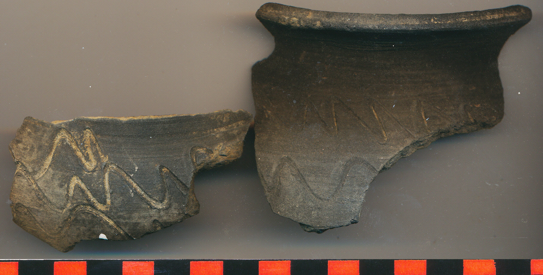 Fekete, kissé homokos anyagú, korongolt fazék kihajló, kissé ferdén vágott pereme, íves vállán körbefutó szabálytalan 2-3 karcolt hullámvonallal.