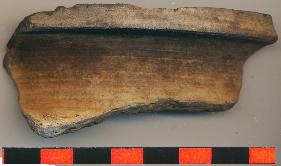 Piszkosfehér, szürkésfekete foltos külső, szürke belső felületű, a peremen belül körben 1 cm szélesen fekete kormos, kissé homokos anyagú, korongolt, vékony falú nagyobb fazék kihajló, kissé ferdén vágott pereme, a vállon karcolt hullámvonal indításával.