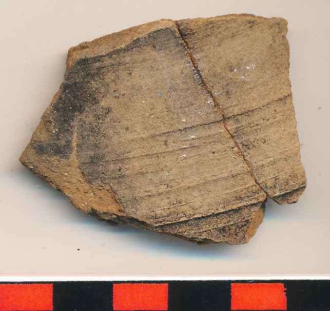 A betöltés felső rétegében: Fekete külső felületű, drapp törésű, homokos anyagú, korongolt edény 2 széles, szabálytalanul körbefutó behúzott sávval díszítve.