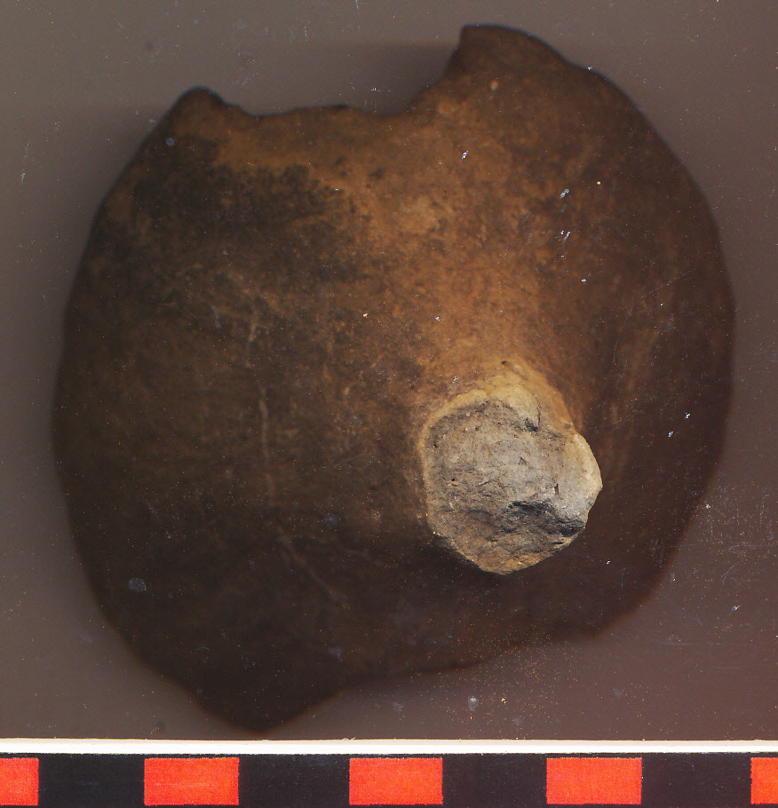 Gömbszelet alakú, kisebb, durvább kidolgozású fedő csonkakúpos, tömör fogóval a tetején, mely törött. Csorba.