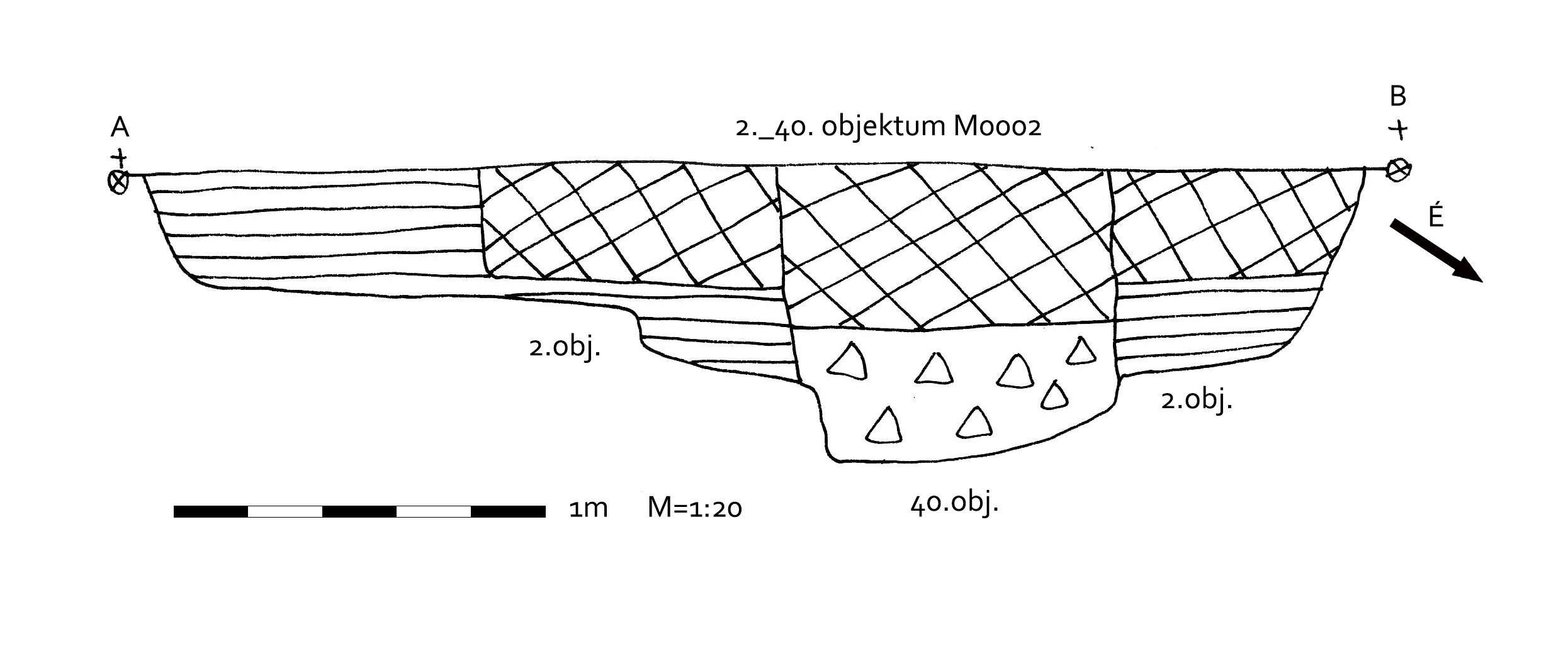 Az MNM NÖK 81693/2 árkában elkezdett objektum. Ennek látszott a felirata a céduláján sh..n.19. Az újra takarításnál kiderült, hogy a DNy-i oldala alighanem - a metszet alapján - erős túlbontós ( mintegy 80 centiméter steril rész látszik az É - D-i metszet D-i felén. Ott a fal függőlegesen indul, alja vízszintes. Körülbelül közép tájon egy beleásott kisebb gödör látszik a metszetfalon (40. objektum). A 2. számú objektum É -i oldalán az alja kissé világos a metszeten, valószínűleg itt is túlbontott. A túlbontások miatt a K-i oldal kérdéses. Valamint a 40. számú objektumtól DK-re van egy másik - kisebb - gödör. Ennek mibenléte ugyancsak kérdéses.