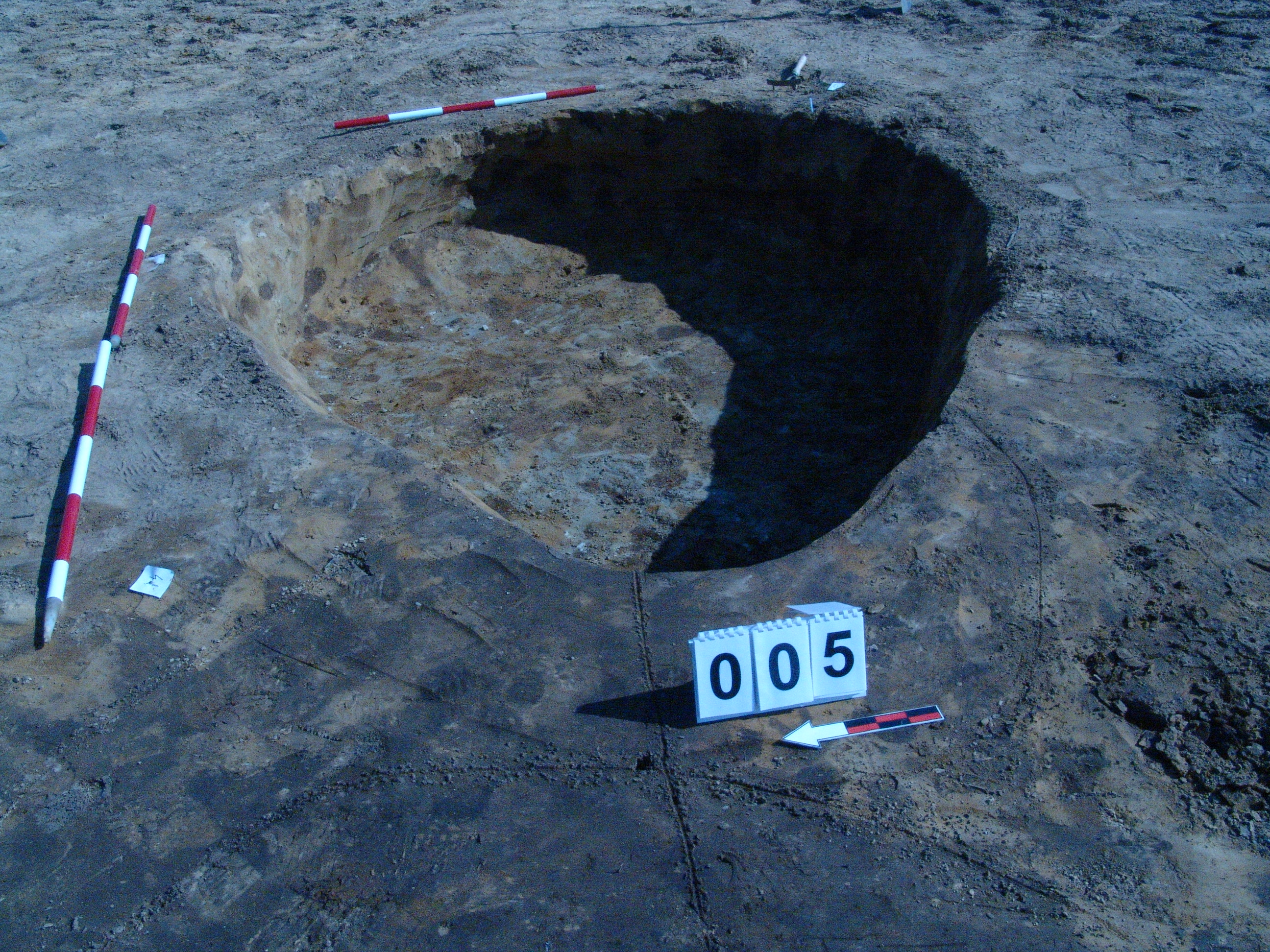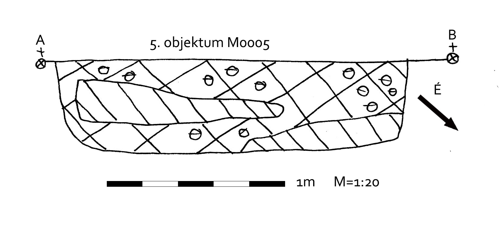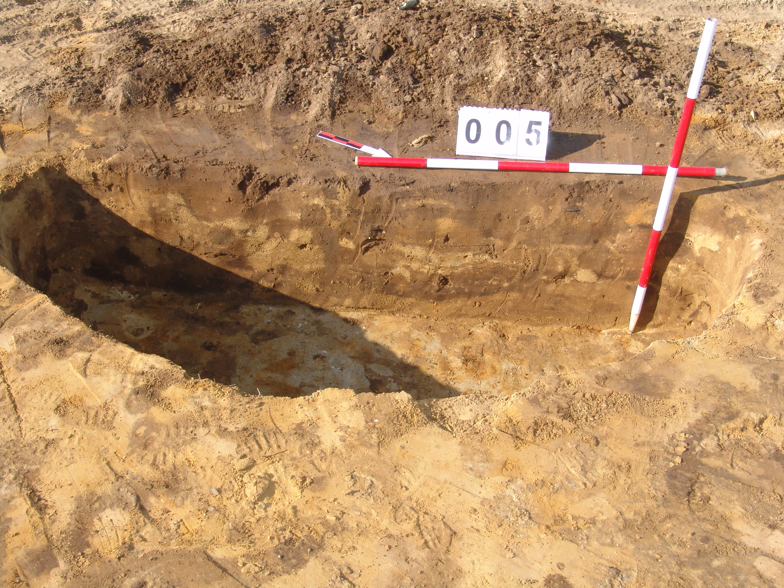 Az MNM NÖK 81639/1. számú kutatóárkában körülbelül 1/3 részben kibontott gödör. A Ny-i oldal 2/3 -a maradt meg. NÖK száma 81639/1. - Str. 5. Jól rajzolódó ovális alaprajzú, egynemű barnásszürke betöltésű, függőleges falú gödör. Fent 215 X 245, alul 240 X 197 centiméter. Mélysége: 47-55 centiméter.