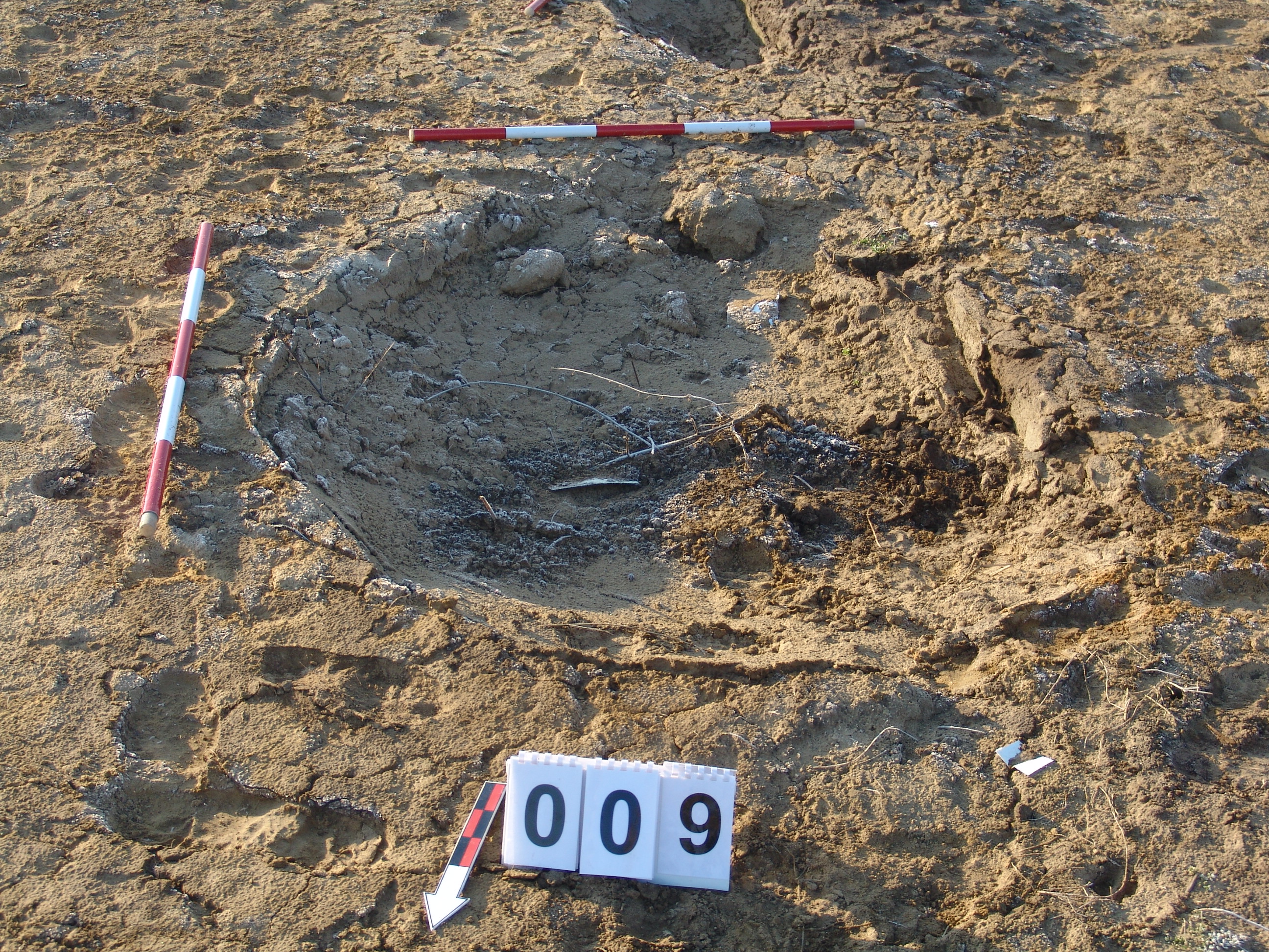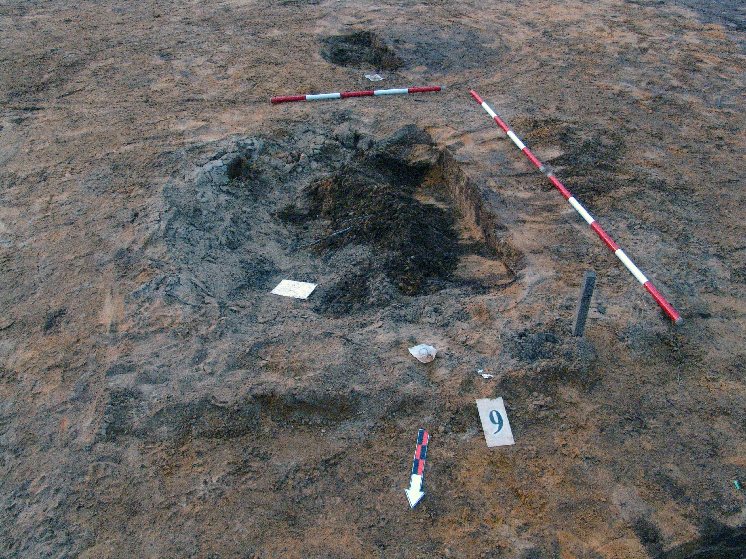 Az MNM NÖK által elkezdett gödör a 81639/1. számú árokban. Keleti 2/3-t bontottuk ki. A 8. számú objektumtól D-re. A 3457. karó a szélébe esik. A NÖK által valószínűleg teljesen feltárt gödör. Csak egészen pici széle maradt a Ny-i részen. Stratigráfiai 8 . szám! Nem takarítottam ki újra.