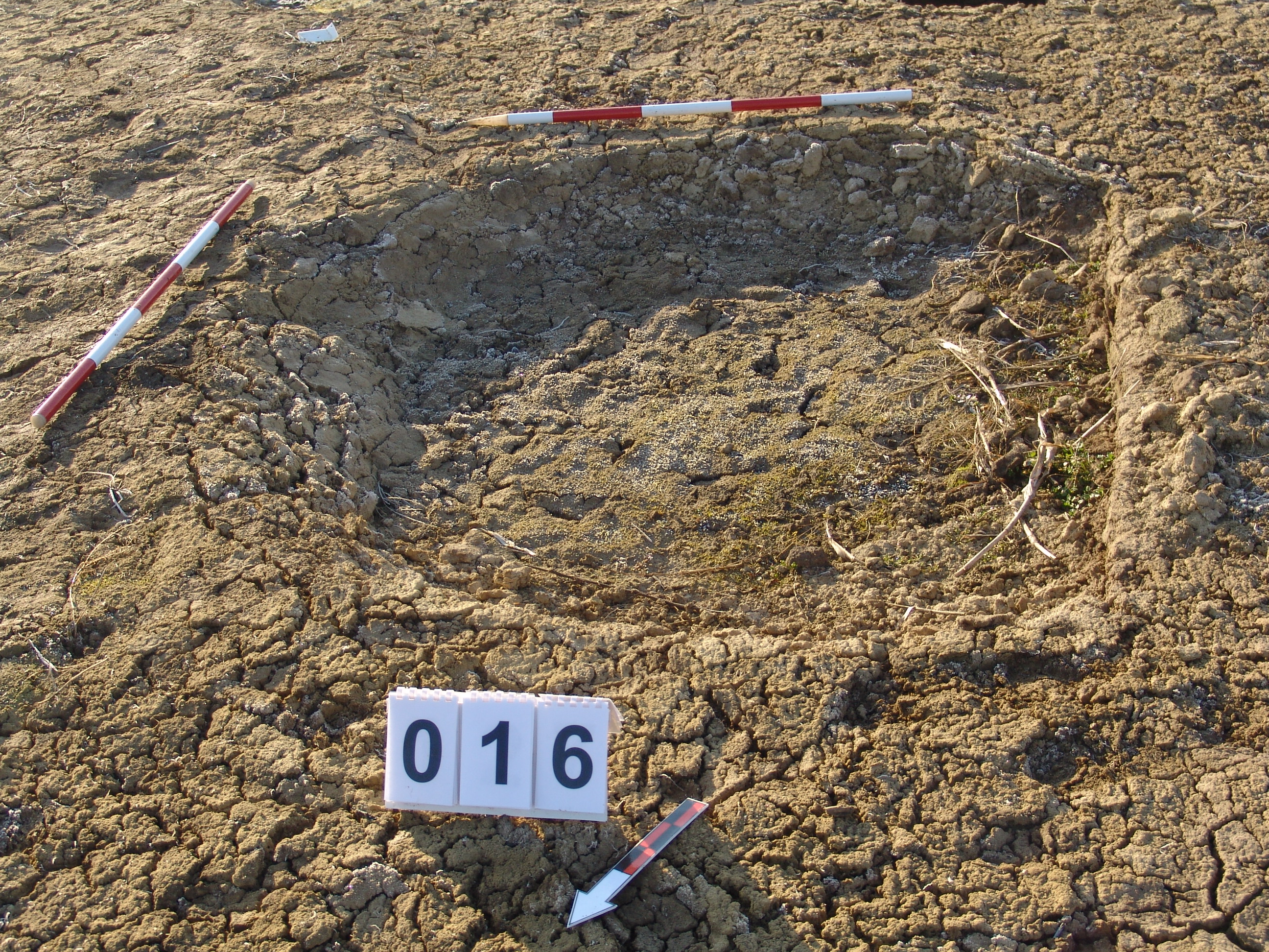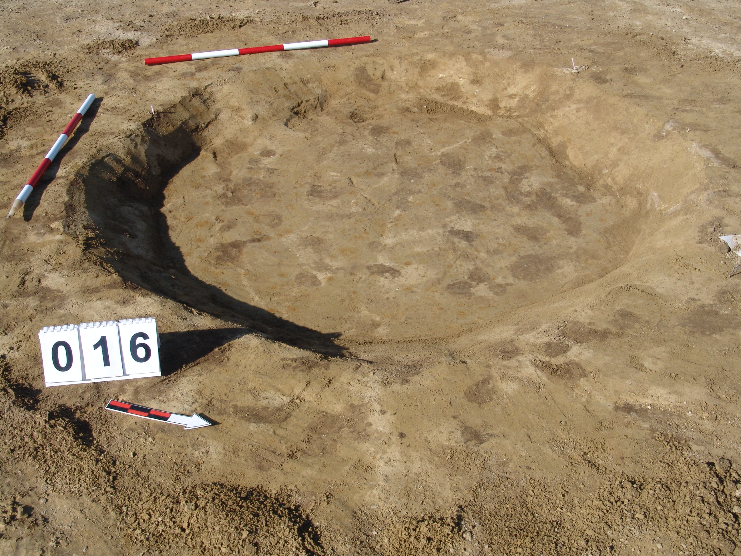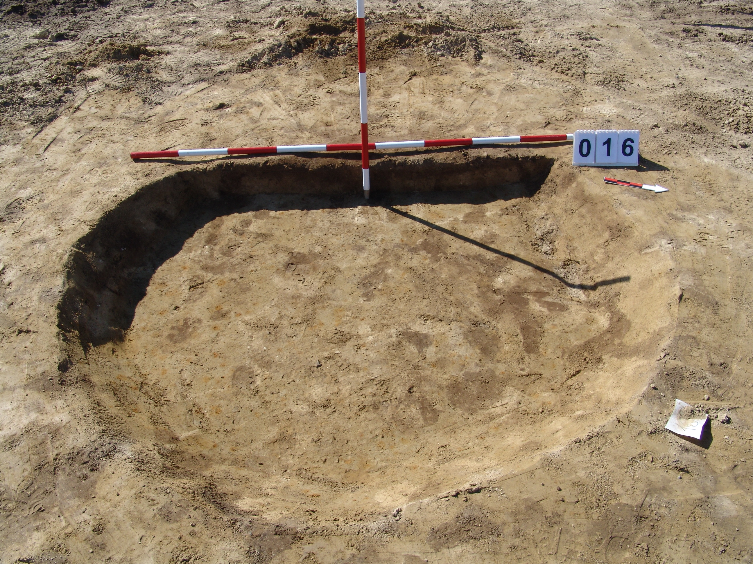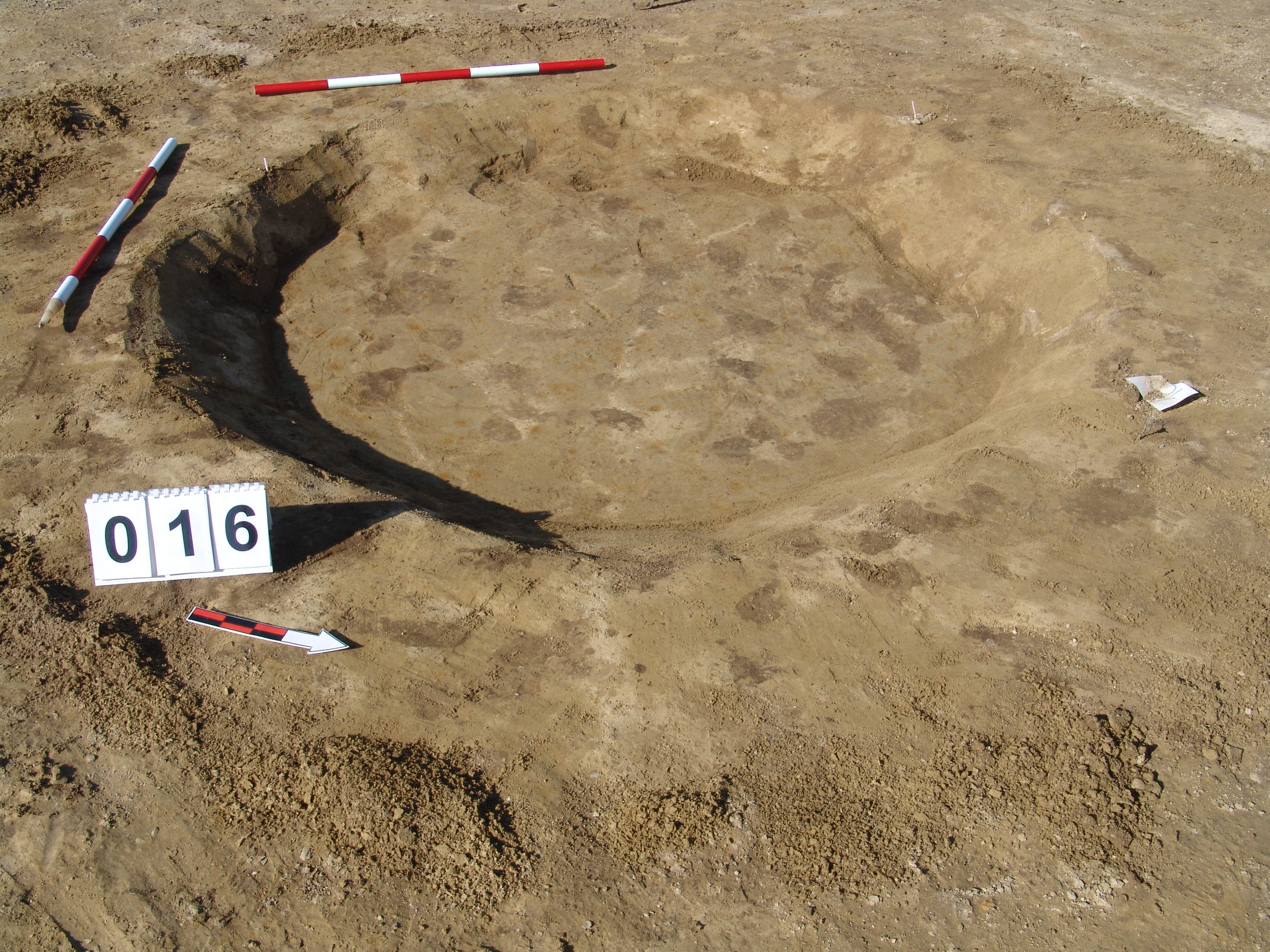 A 15 számú gödörtől D-re a MNM NÖK által teljesen kibontott gödör. Kör alaprajzú, meredek falú, egyenes aljú gödör nagy része volt kibontva a takarítás alapján. Nyugati részén kis ív bent maradt. Sárga szemcsés sötétbarna betöltésű. Átmérője fent É-D 205, Ny- K 195 centiméter, lent É-D 160, Ny-K 145 centiméter. Mélysége: 18-20 centiméter.