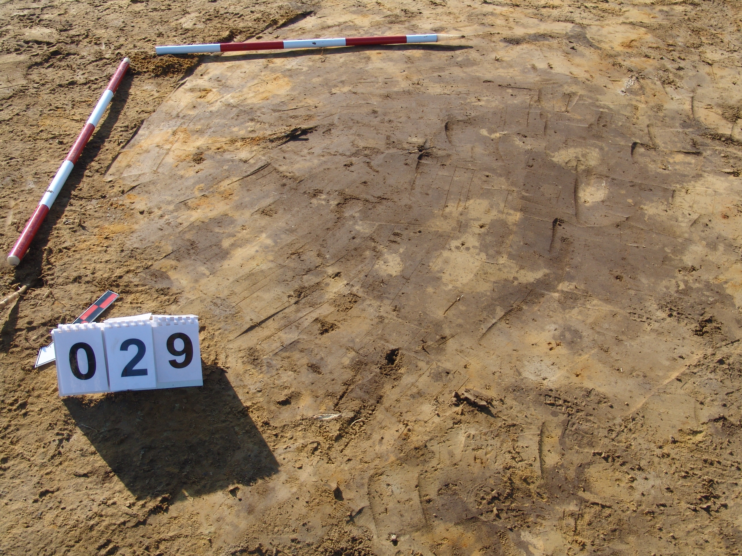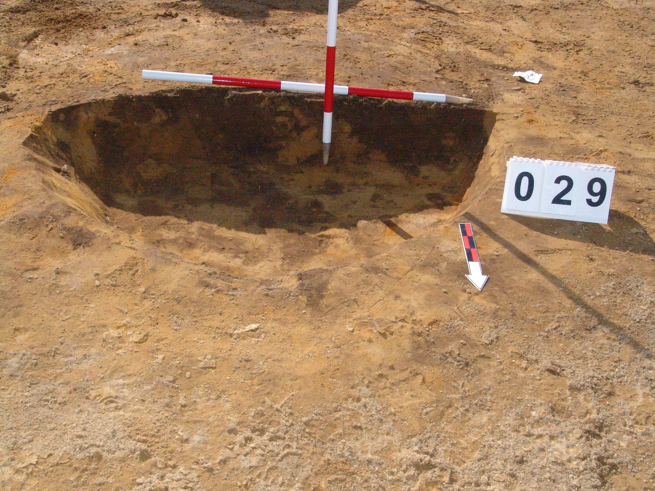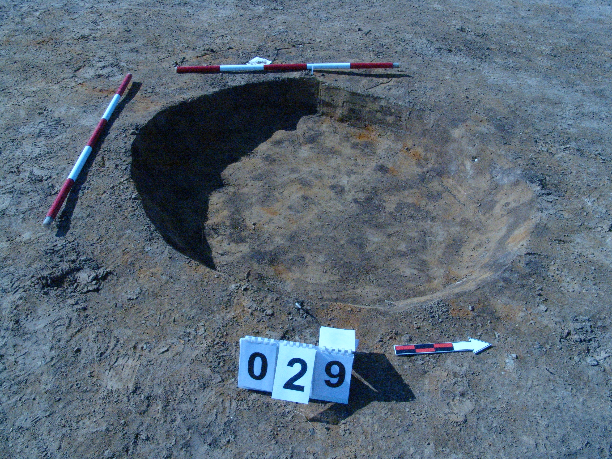 Jól látszó, kerek folttal jelentkező sekély gödör. Oldalát kissé túlbontottuk. Betöltése: egynemű, barnásszürke. A további bontásnál kiderült, hogy nincs túlbontva. Fala helyenként kicsit meredek, alja egyenes. Átmérője fent 130 X 140, lent 110 X 120 centiméter.