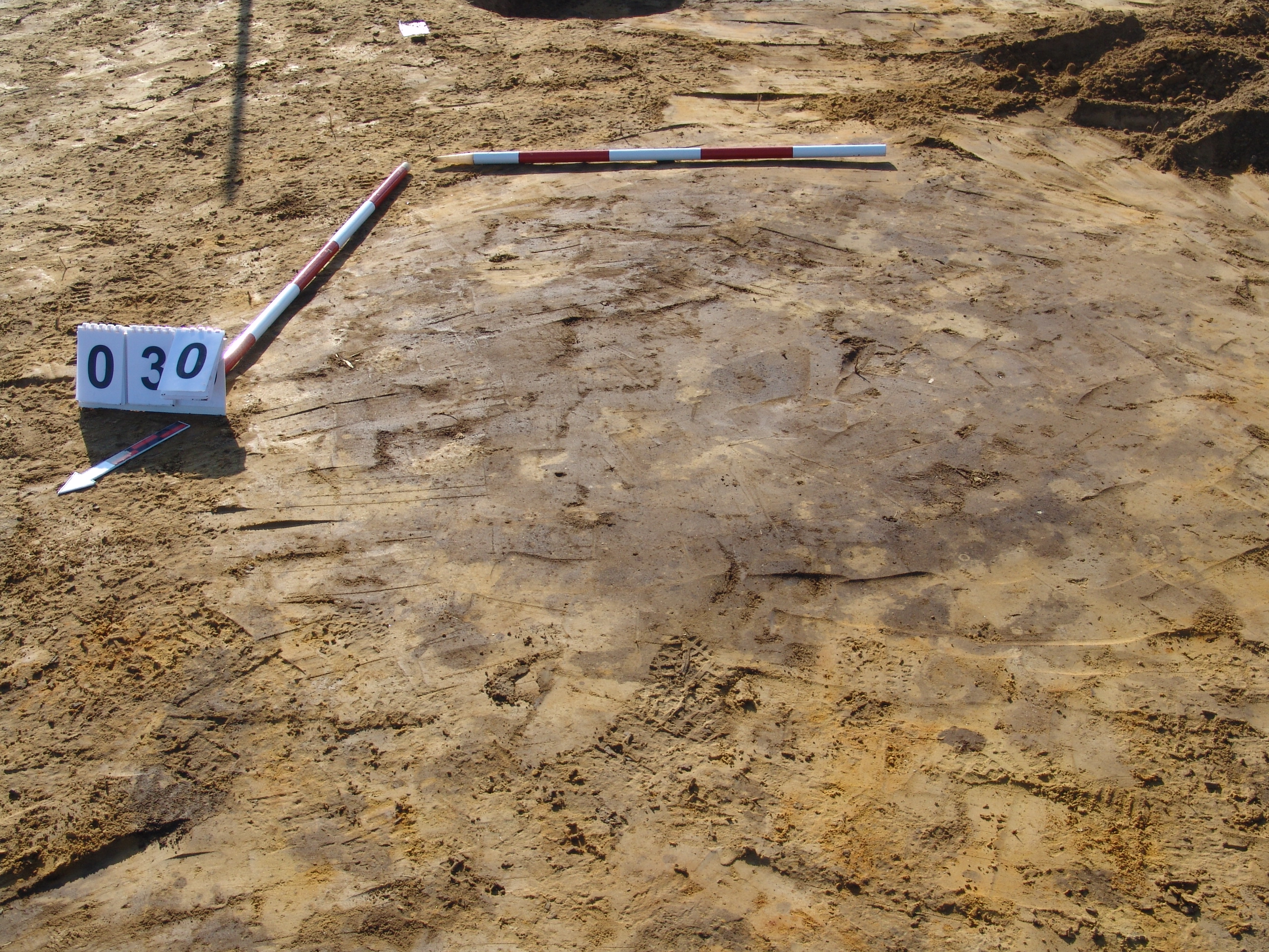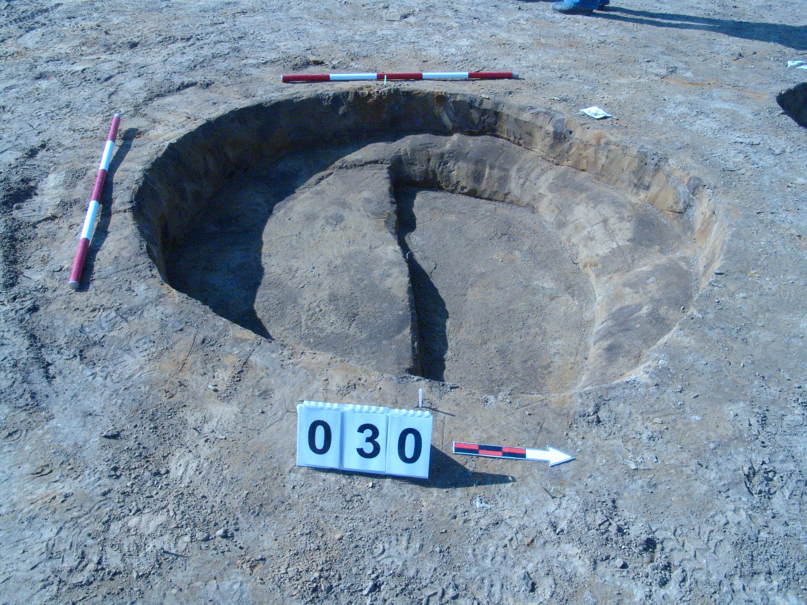 Szabályos kerek folttal jelentkező objektum a 29 számú objektumtól D-re. Északi felét kezdtük bontani, ahol középen az alját mélyebbre ásták a valóságosnál körülbelül 15-20 centiméterrel. A padkát meghagytuk, ahol látszik az eredeti alja. Betöltése: barnásszürke. (Nem készült metszetfotó!)