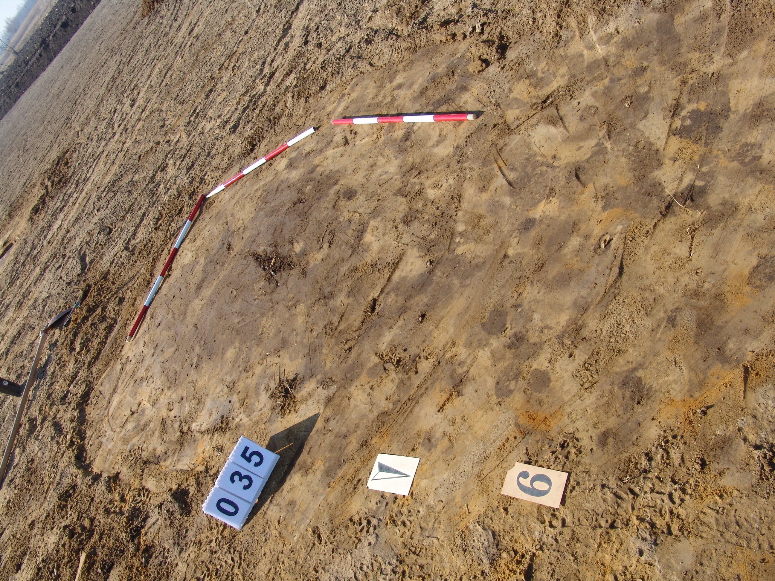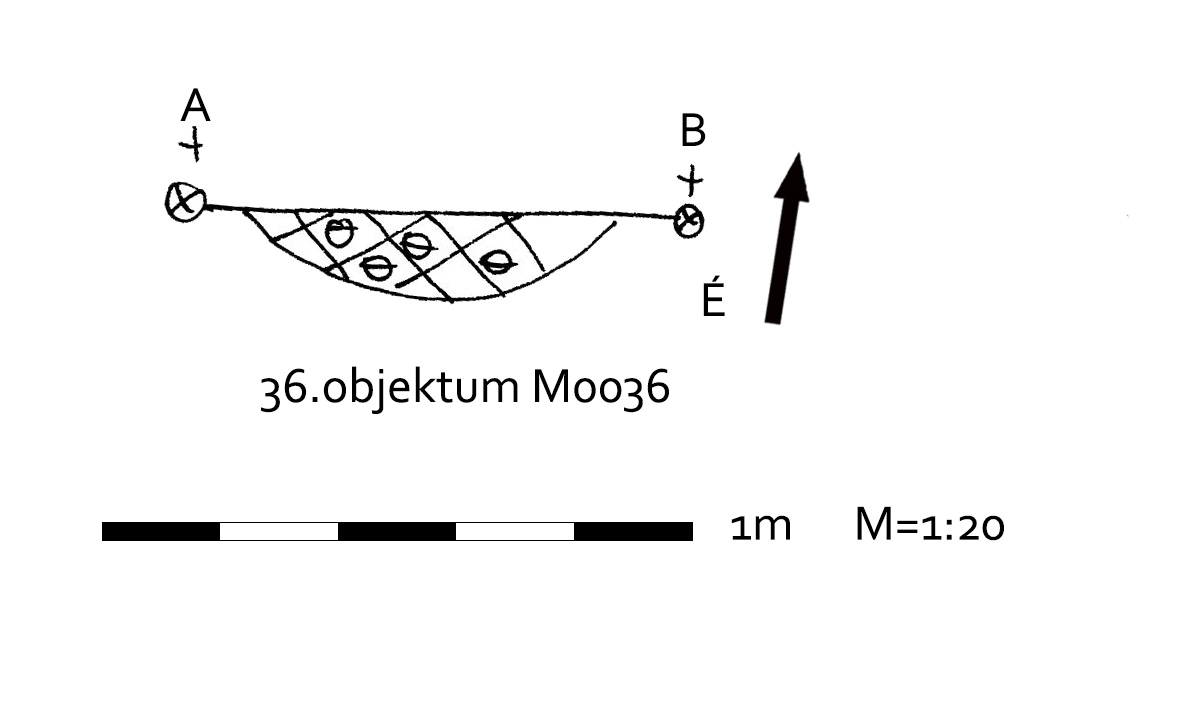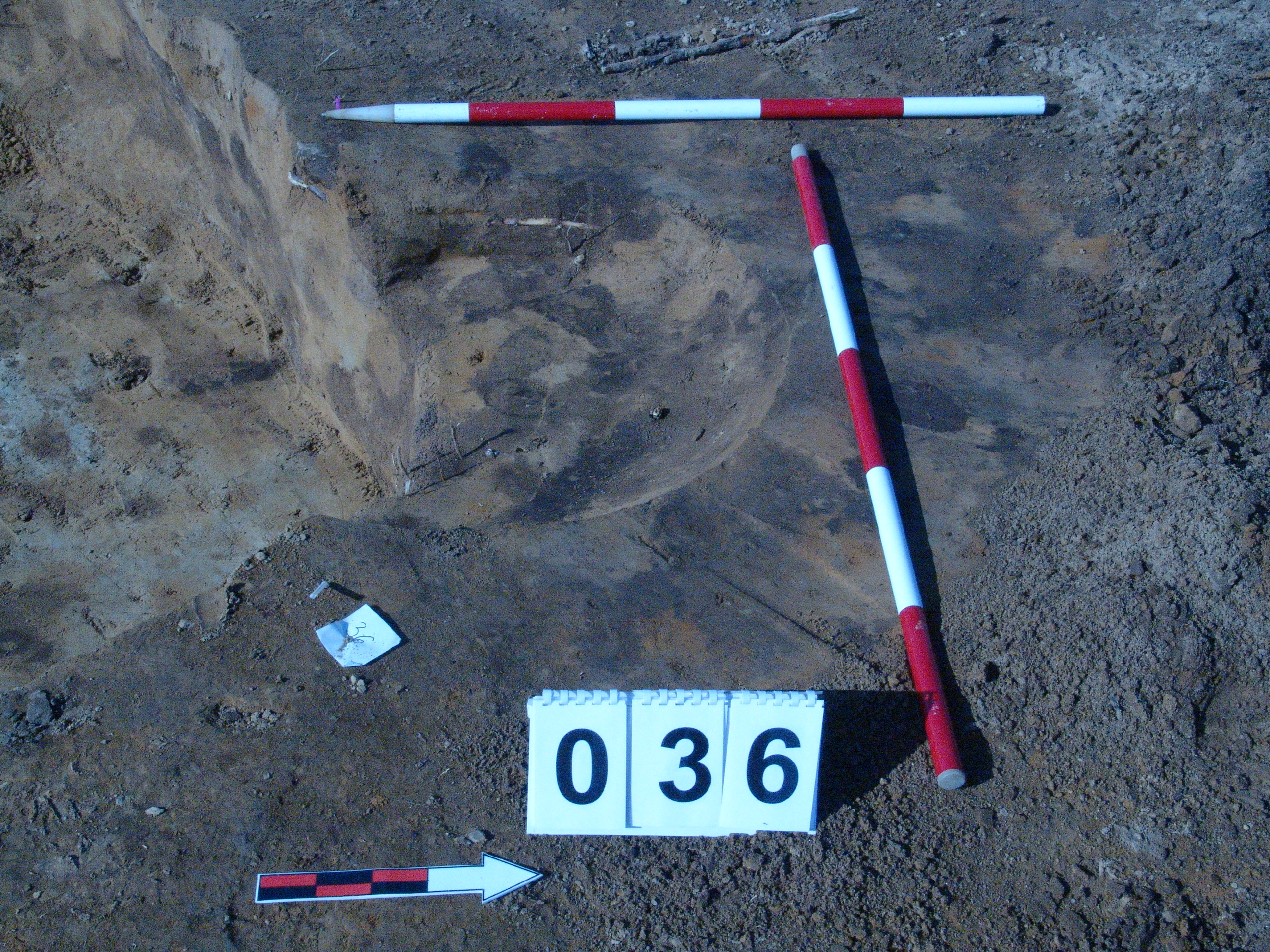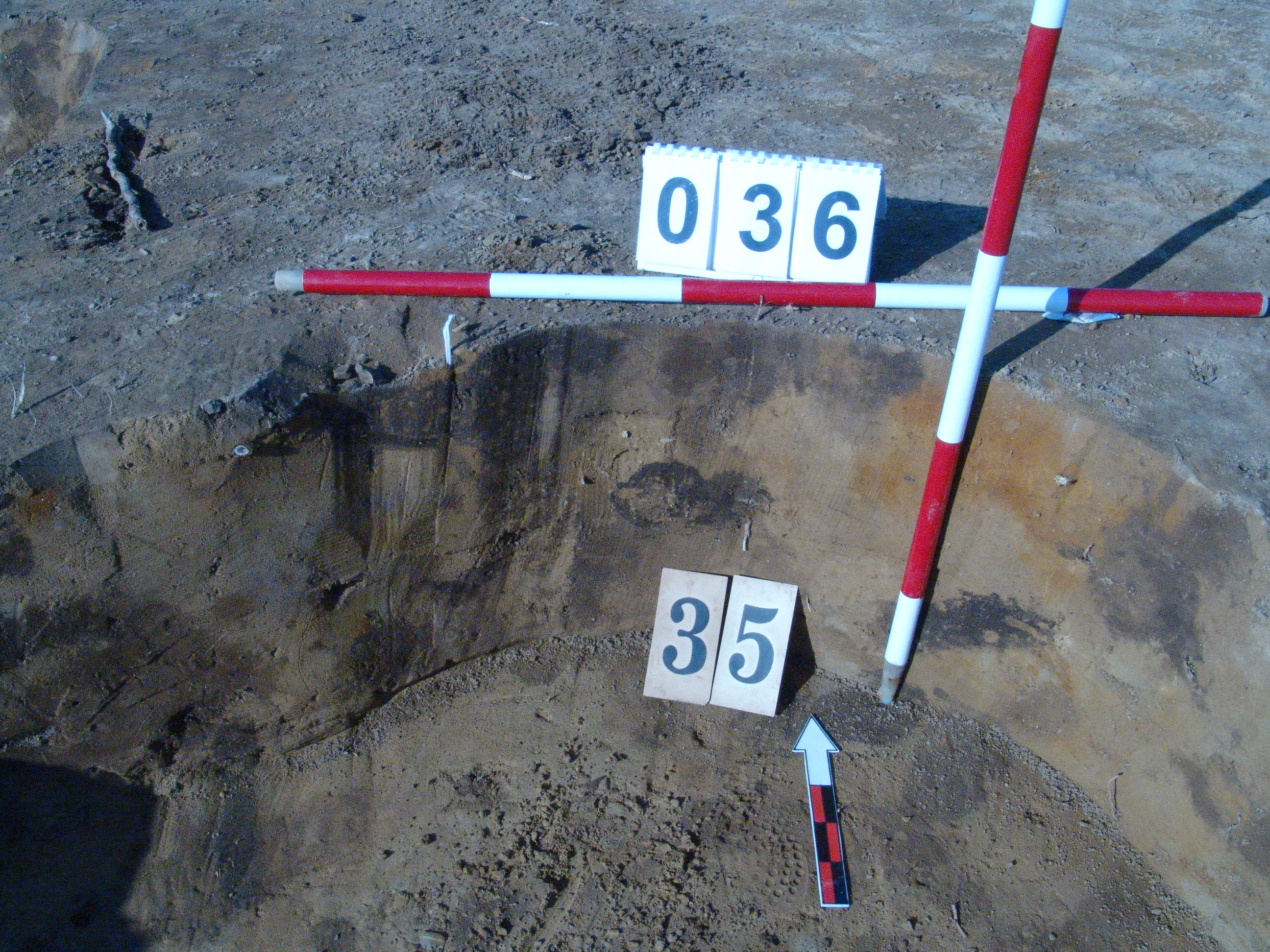 A 35 számú objektum É-i szélén bizonytalan kisebb kerek elszíneződés jelentkezett. Bontás során kiderült, hogy a nádgyökerek okozta elszíneződés. Aztán a további bontásnál szépen jelentkezett a 35 számú objektum É-i falában az íves metszet. Betöltése: barnásszürke, egynemű. Fala ívelt, alja is. Átmérője fent 63, lent 50 centiméter. Mélysége: 14 centiméter.