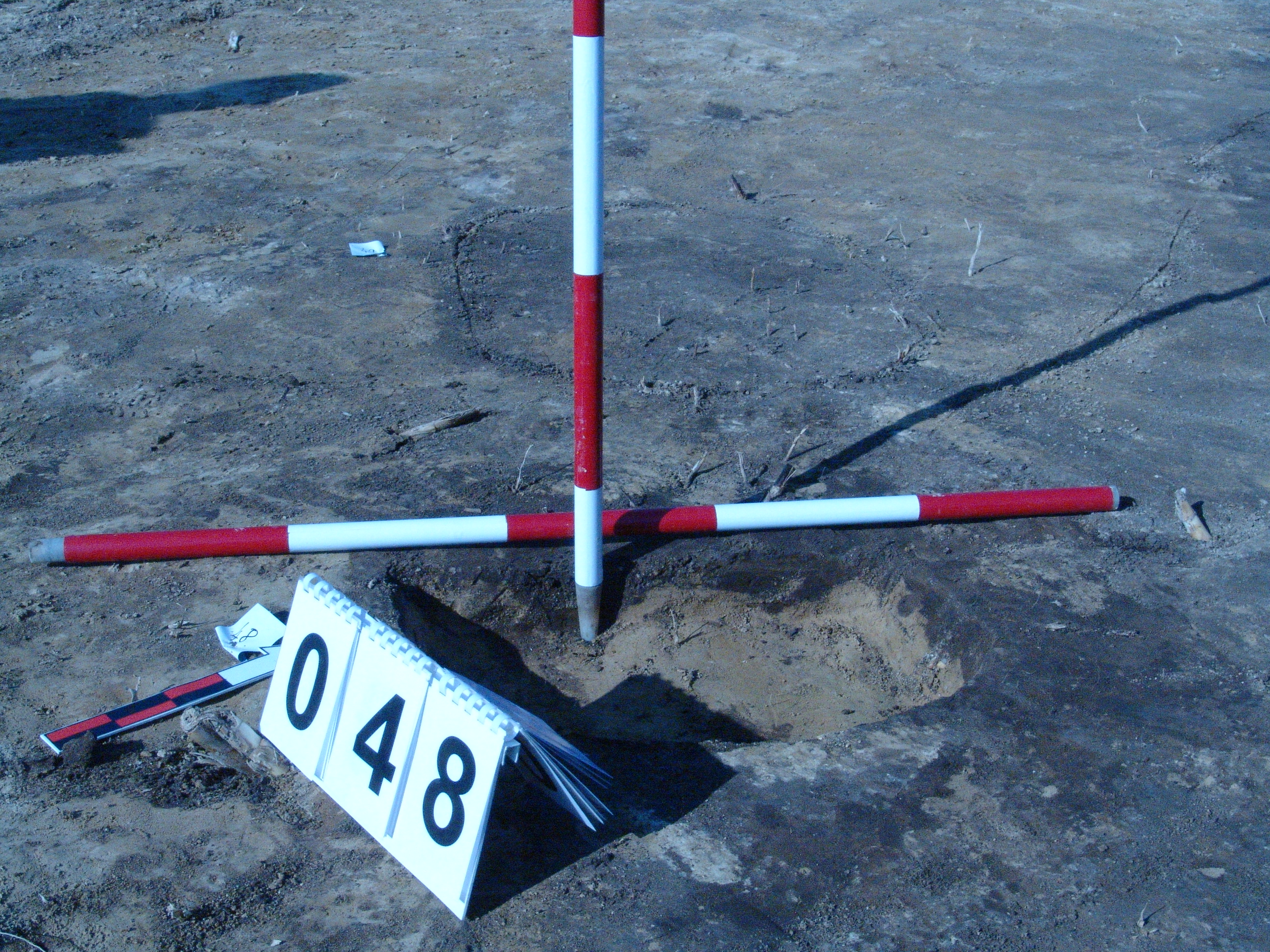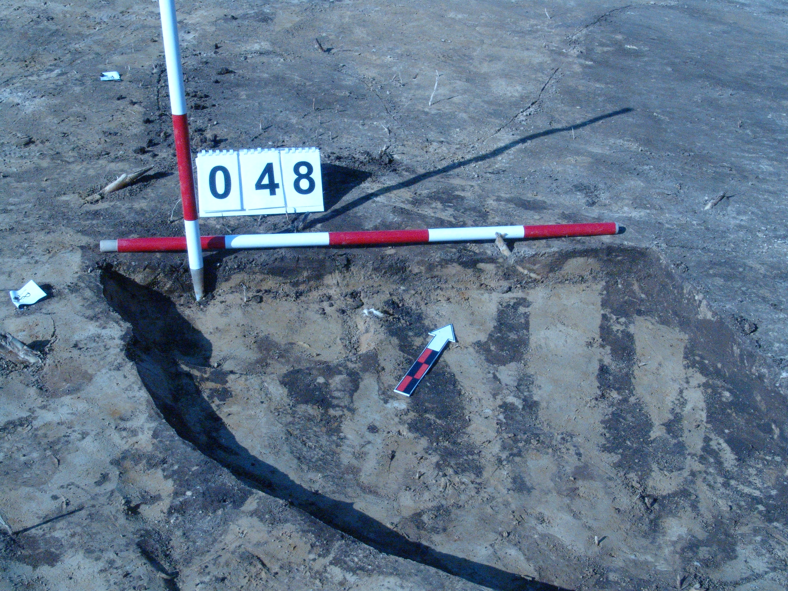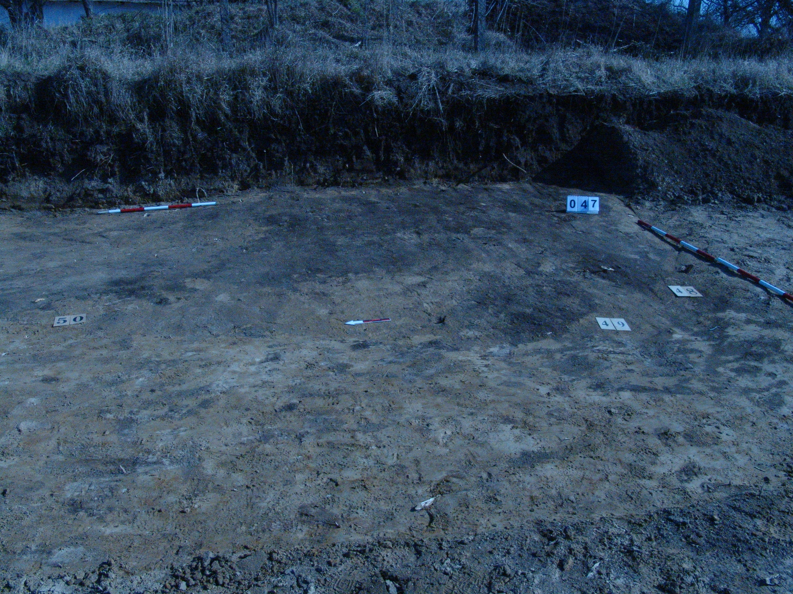 A 47 számú objektum DNy-i sarkán jól rajzolódó kerek folttal jelentkezett. Betöltése sötét barnásfekete, sekély. Jellege alapján nem régészeti jelenség.