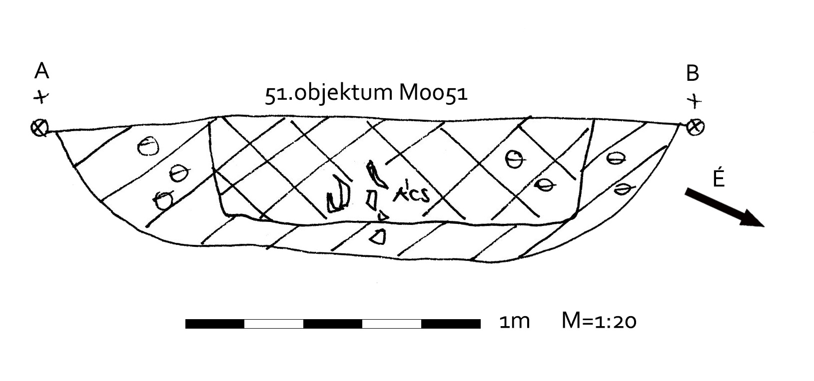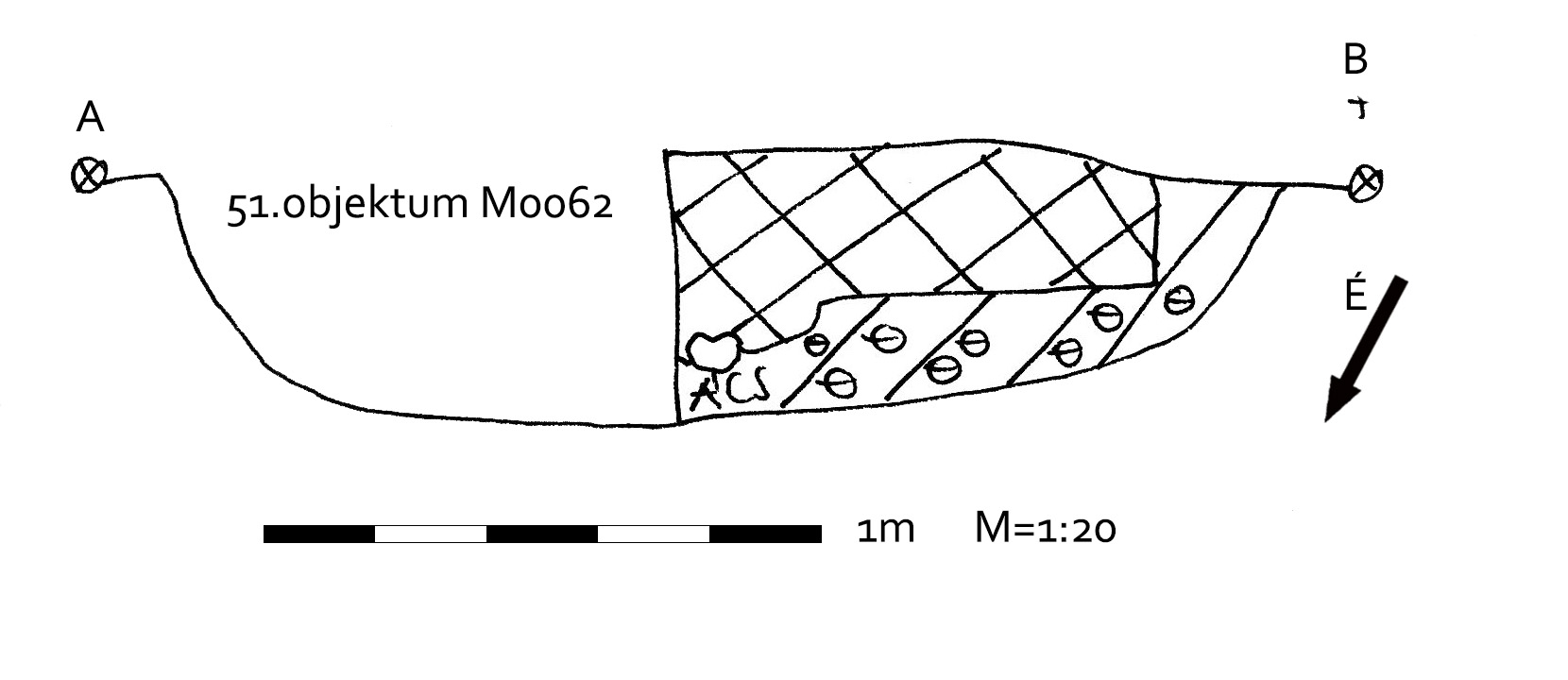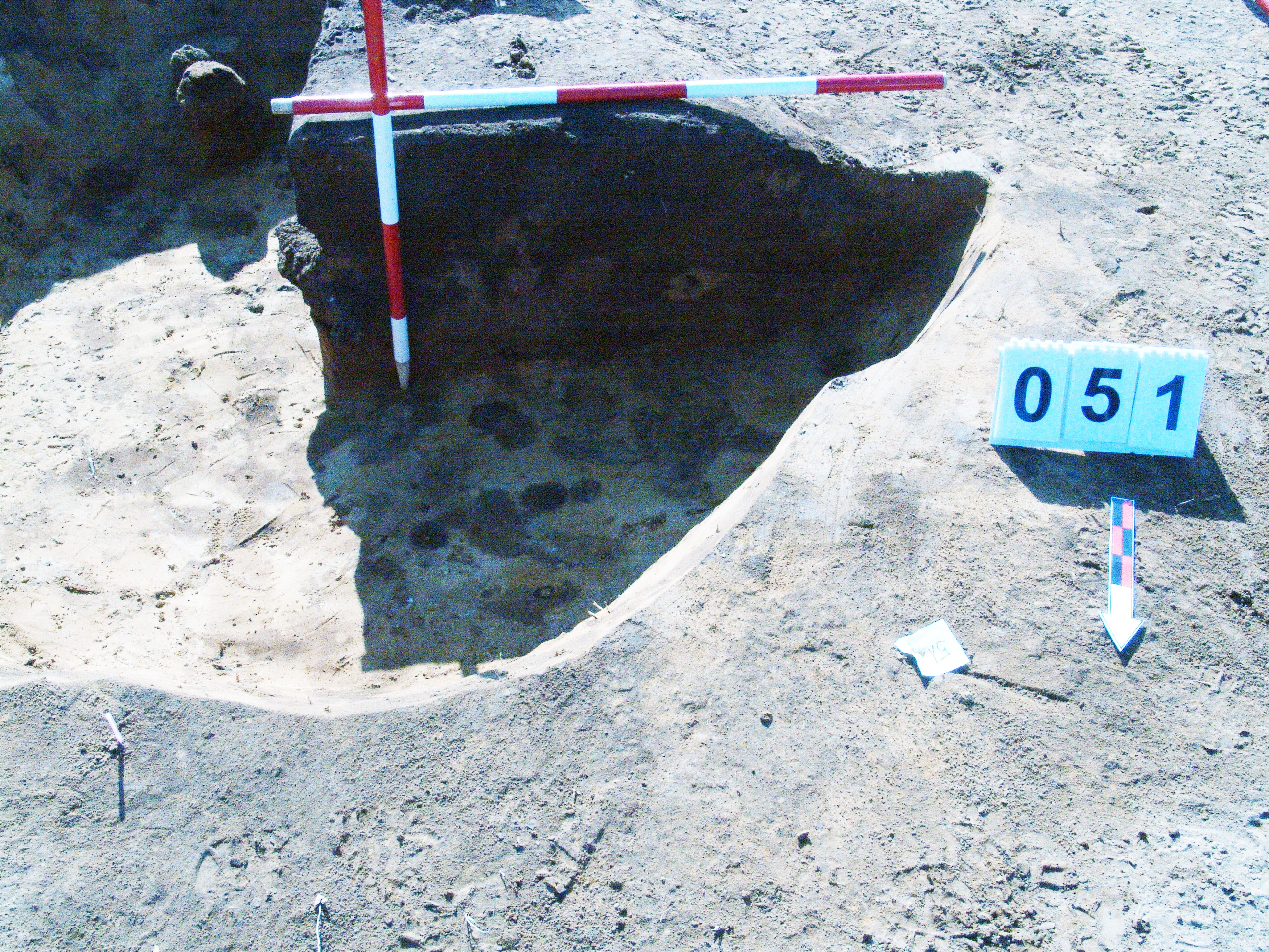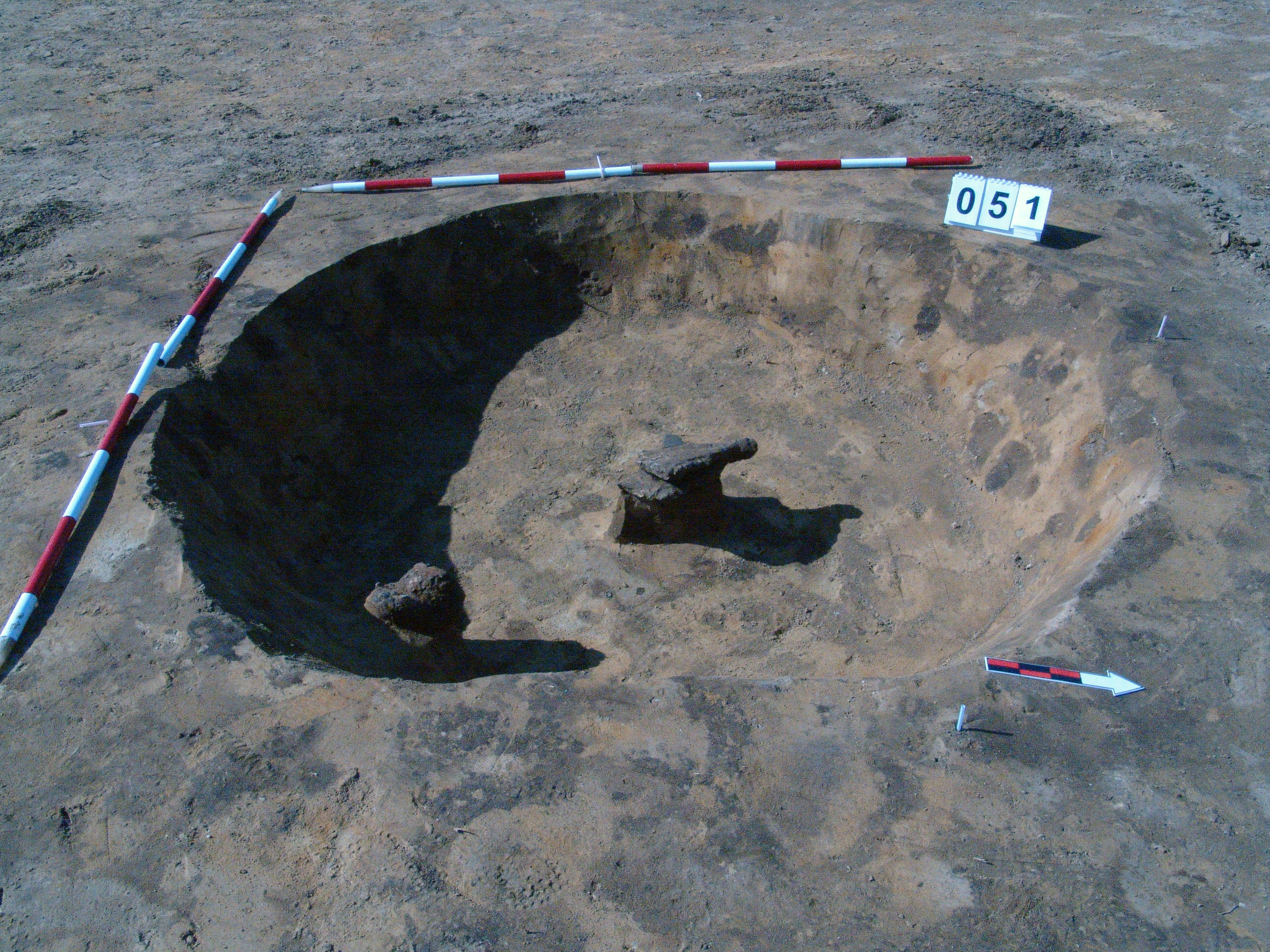 Jól látszó, kerek folttal jelentkező gödör. A gépi humuszólaskor kicsit "púposan" meghagyott rész. Fala meredek, alja enyhén íves. Középen mintha lenne egy sötétebb, egynemű, barnásszürke beásás. Ebben állatcsont. Körben körülötte sárga maszatos világosabb, sárga állatjáratos sötétbarna. Ezek után negyedeltük a gödröt. Ugyanaz látszik a Ny-i oldalon. Átmérője fent 190 X 200, lent 155 centiméter. Mélysége 55 centiméter.