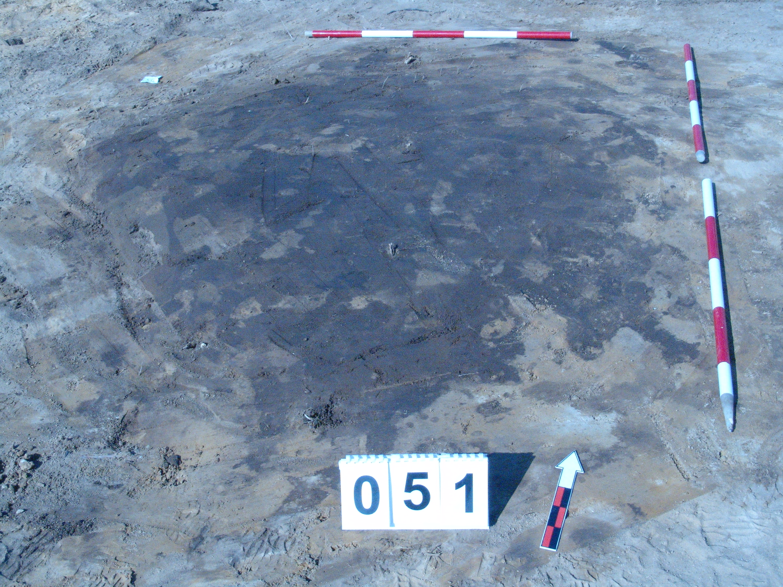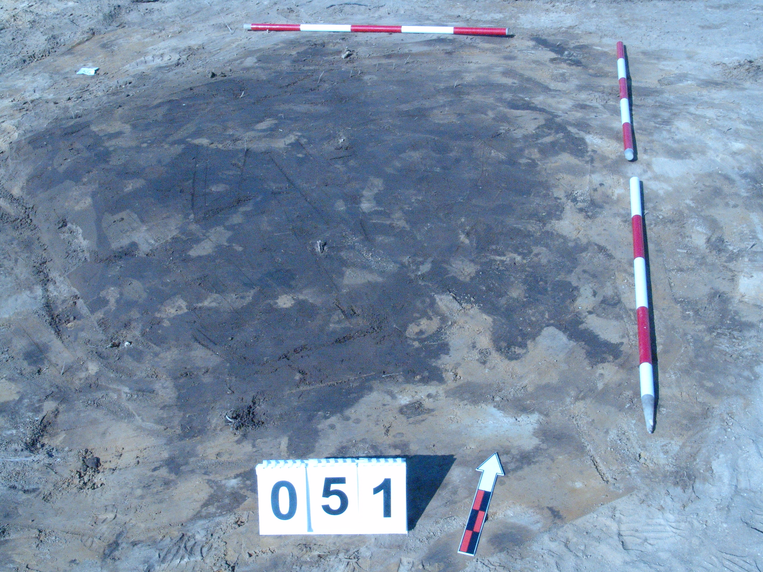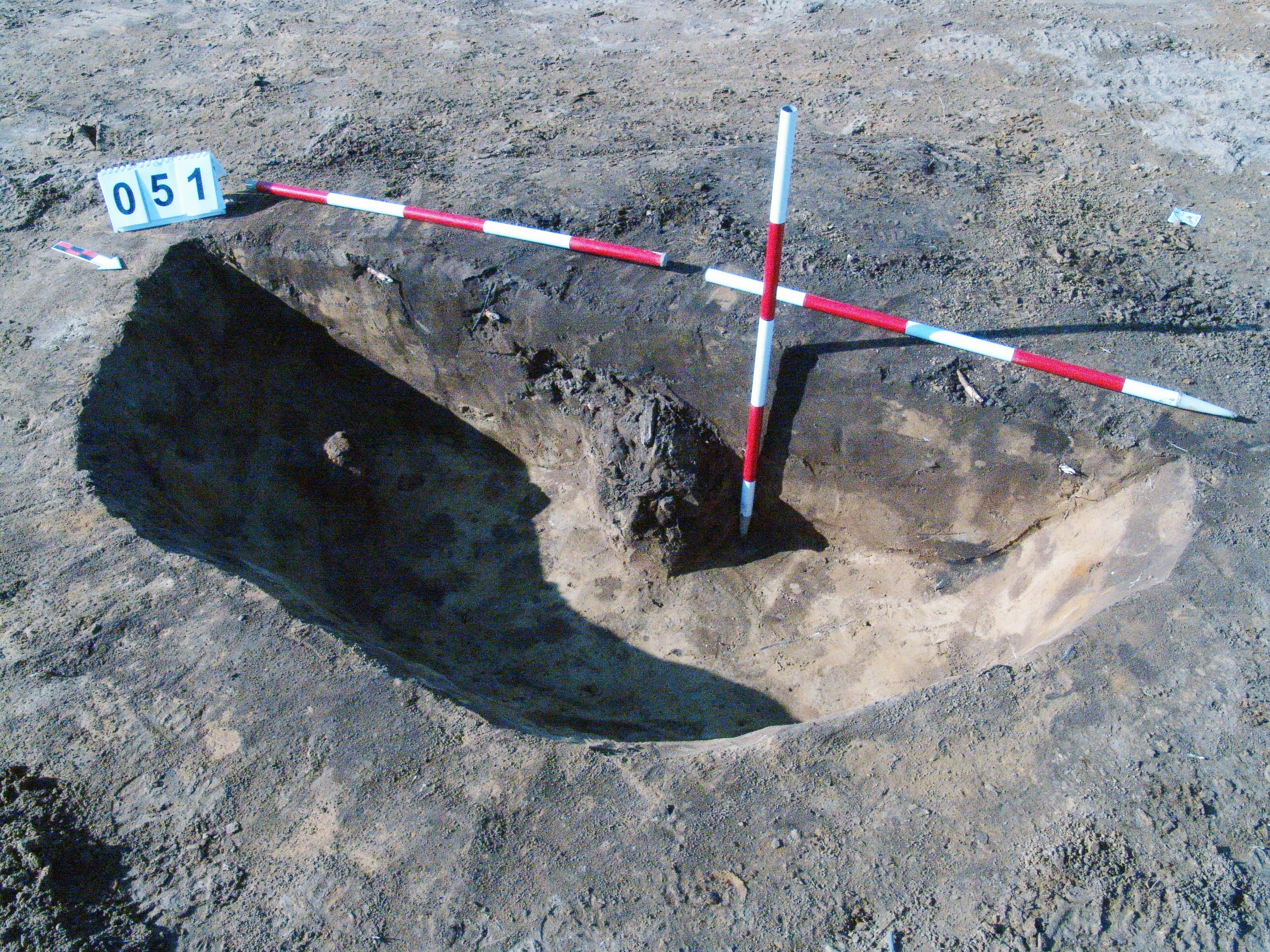 Jól látszó, kerek folttal jelentkező gödör. A gépi humuszólaskor kicsit "púposan" meghagyott rész. Fala meredek, alja enyhén íves. Középen mintha lenne egy sötétebb, egynemű, barnásszürke beásás. Ebben állatcsont. Körben körülötte sárga maszatos világosabb, sárga állatjáratos sötétbarna. Ezek után negyedeltük a gödröt. Ugyanaz látszik a Ny-i oldalon. Átmérője fent 190 X 200, lent 155 centiméter. Mélysége 55 centiméter.