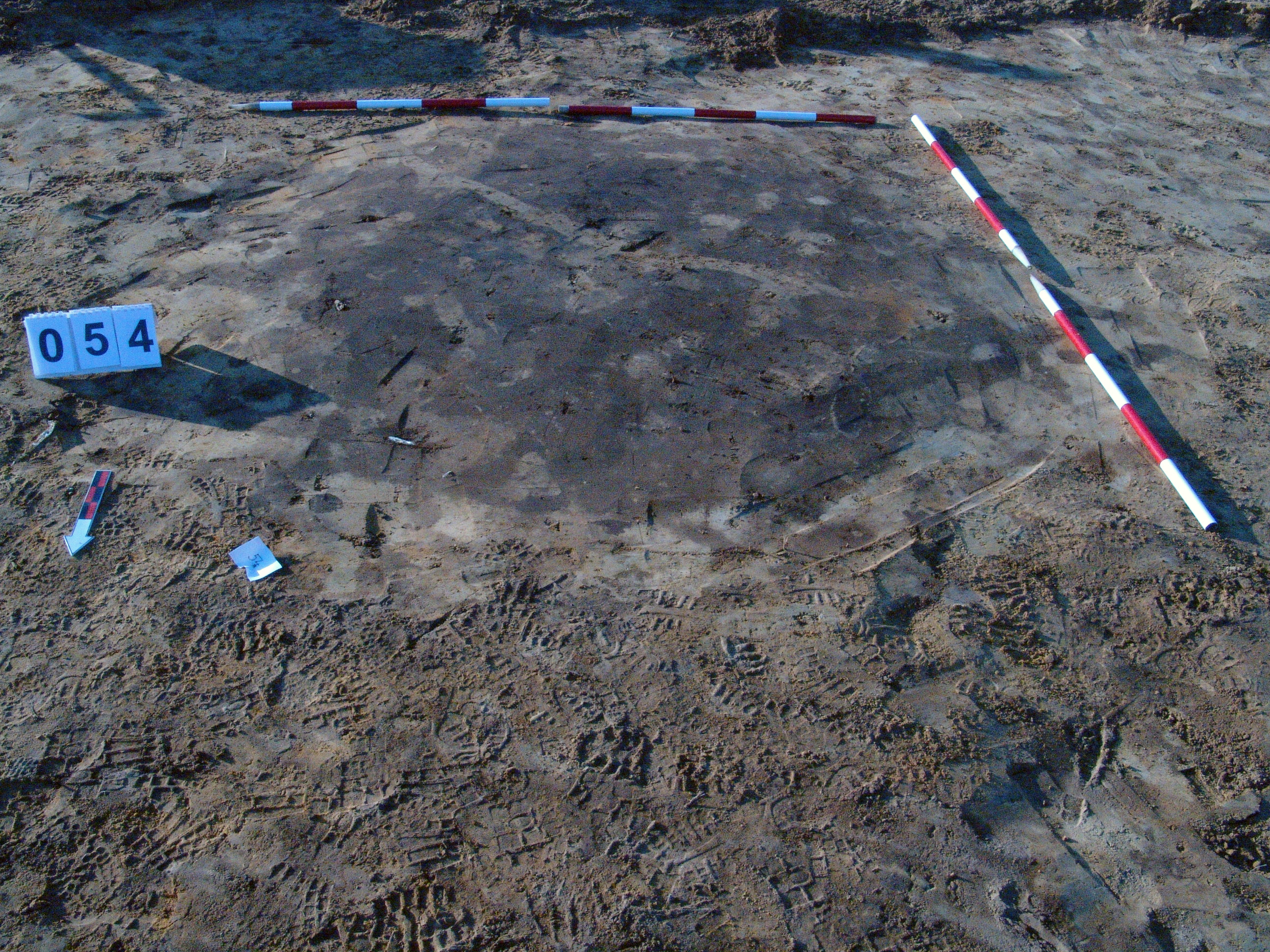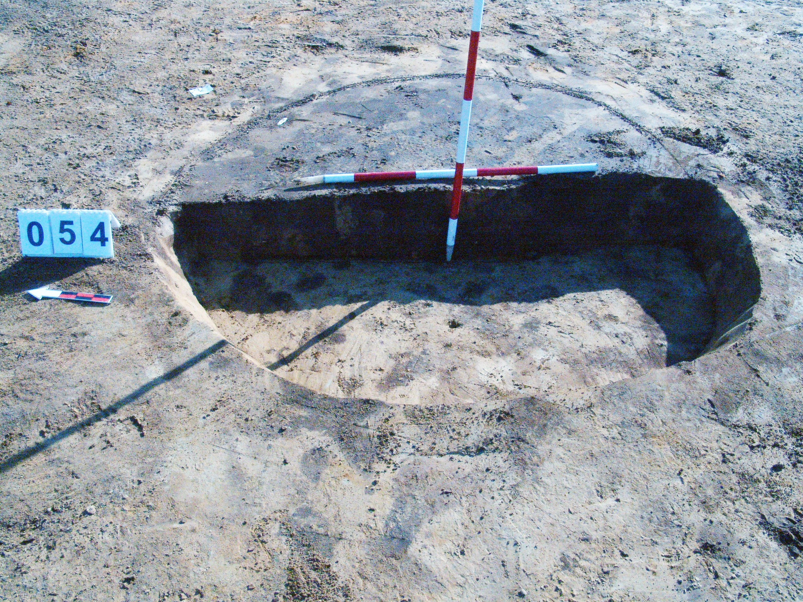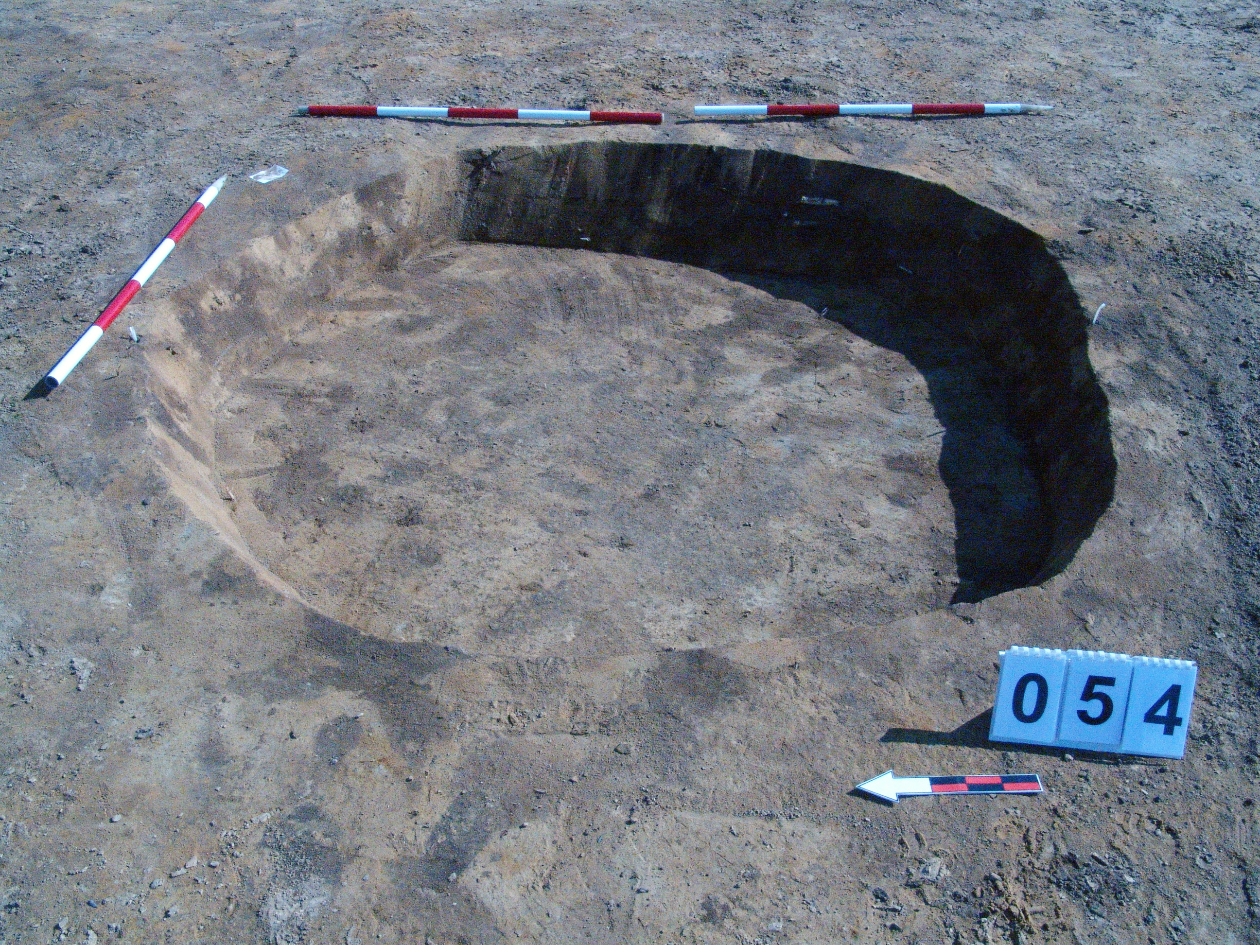 Az 53 számú objektumtól D-re jól látszó, sötét kerek folttal jelentkező gödör. Csaknem függőleges falú, egyenes aljú gödör. Betöltése egynemű sötét barnásszürke. Átmérője fent D - É 195, Ny - K 187, lent D - É 173, Ny - K 161 centiméter. Mélysége 20-28 centiméter.
