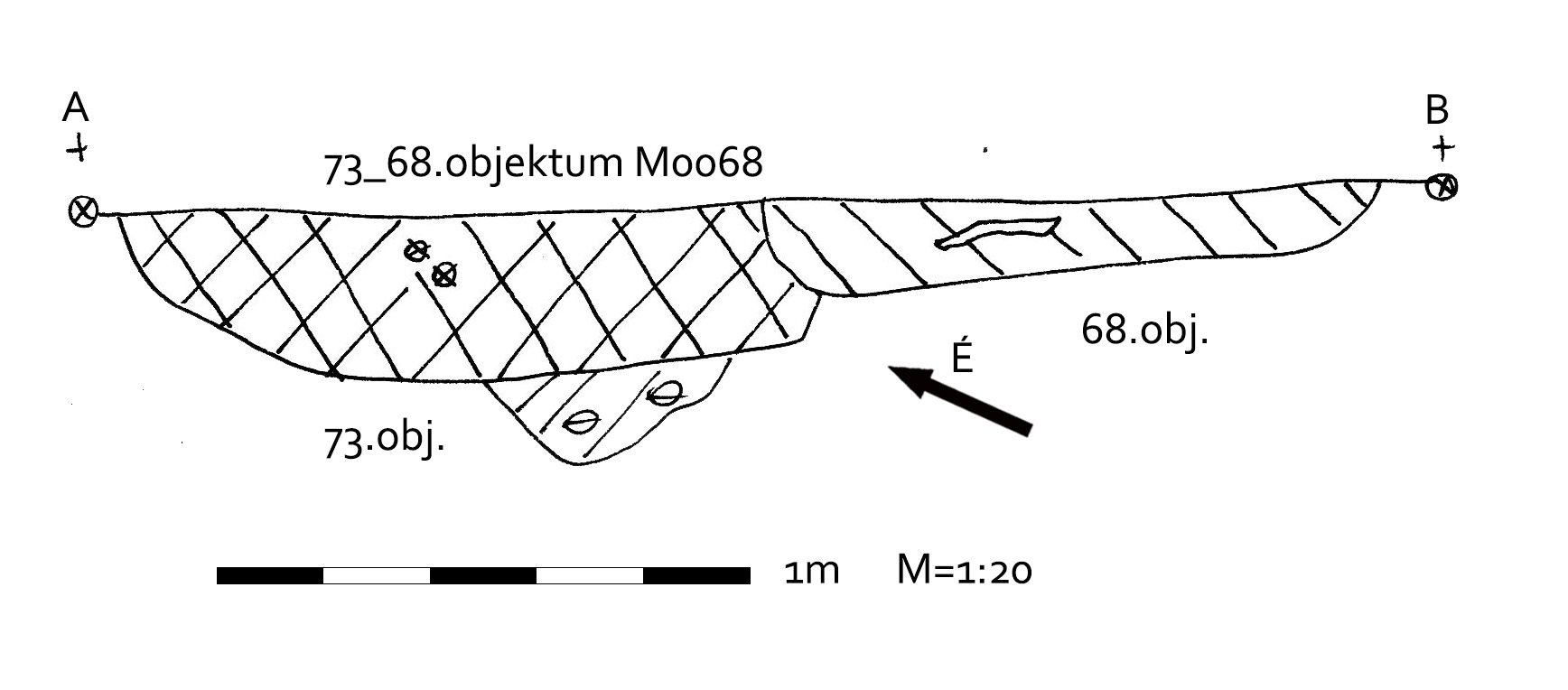 Bontás közben a 68 számú objektum É-i része alatt jelentkező, kör alaprajzú, meredek falú, egyenes aljú gödör. Egy állatjáratba az alján utána ástak. Átmérője fent Ny- K 210 centiméter, É -D 115 centiméter, Ny - K 175 centiméter. Mélysége: 32-40 centiméter.