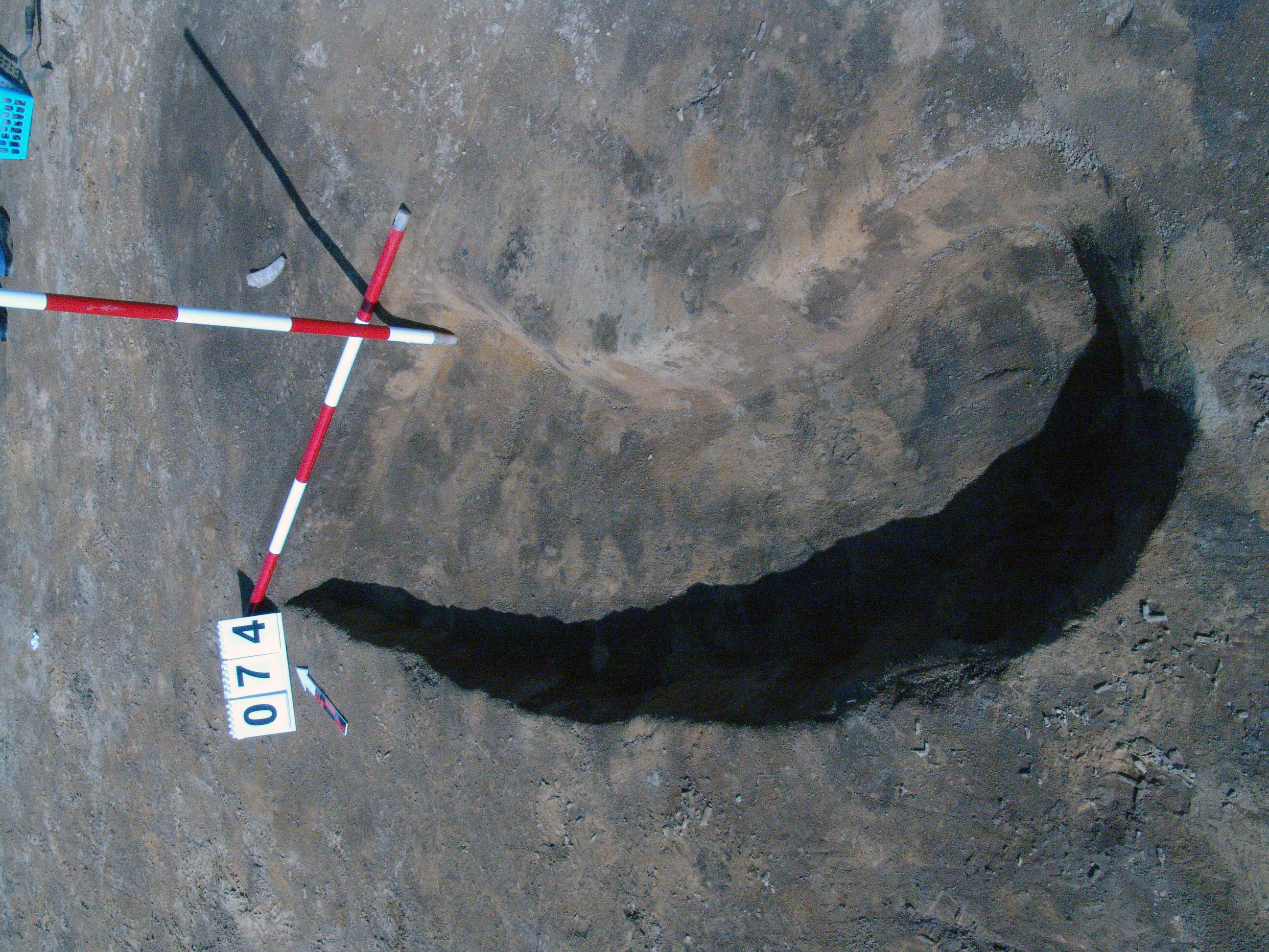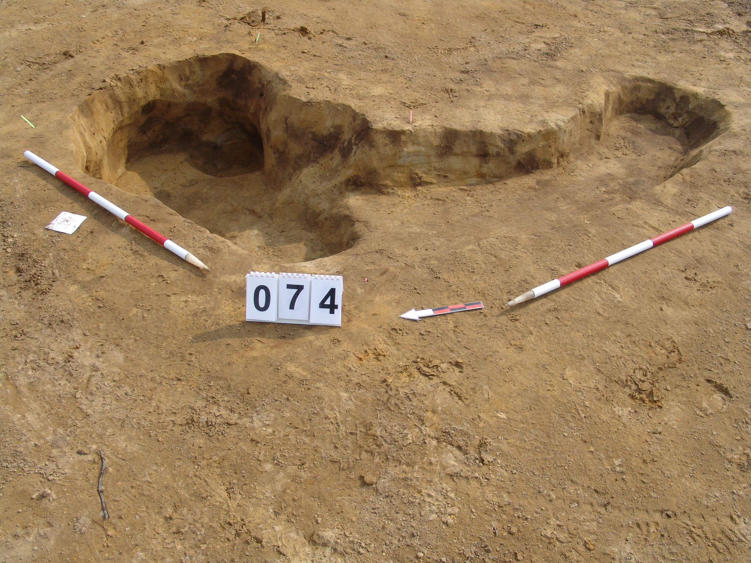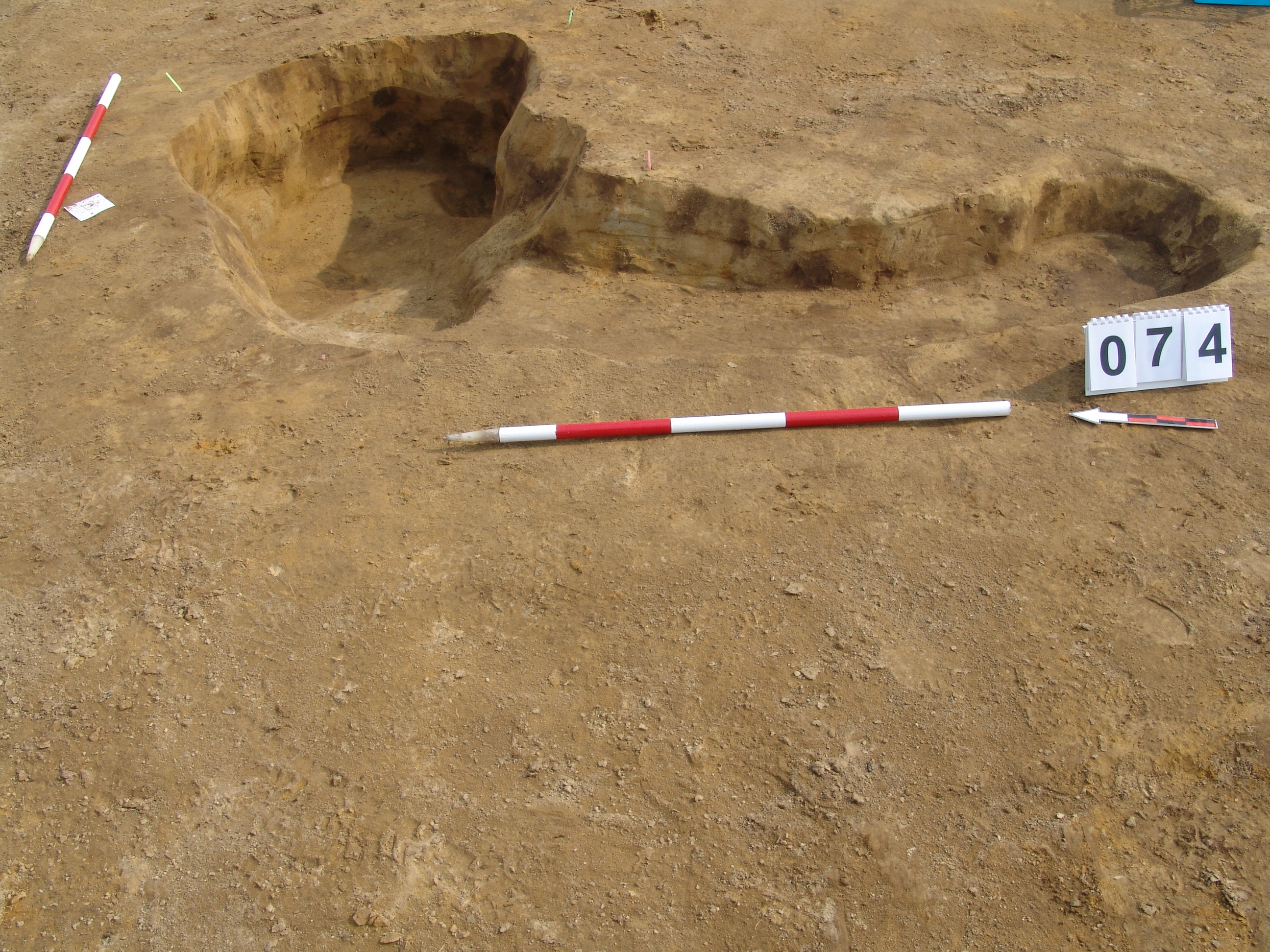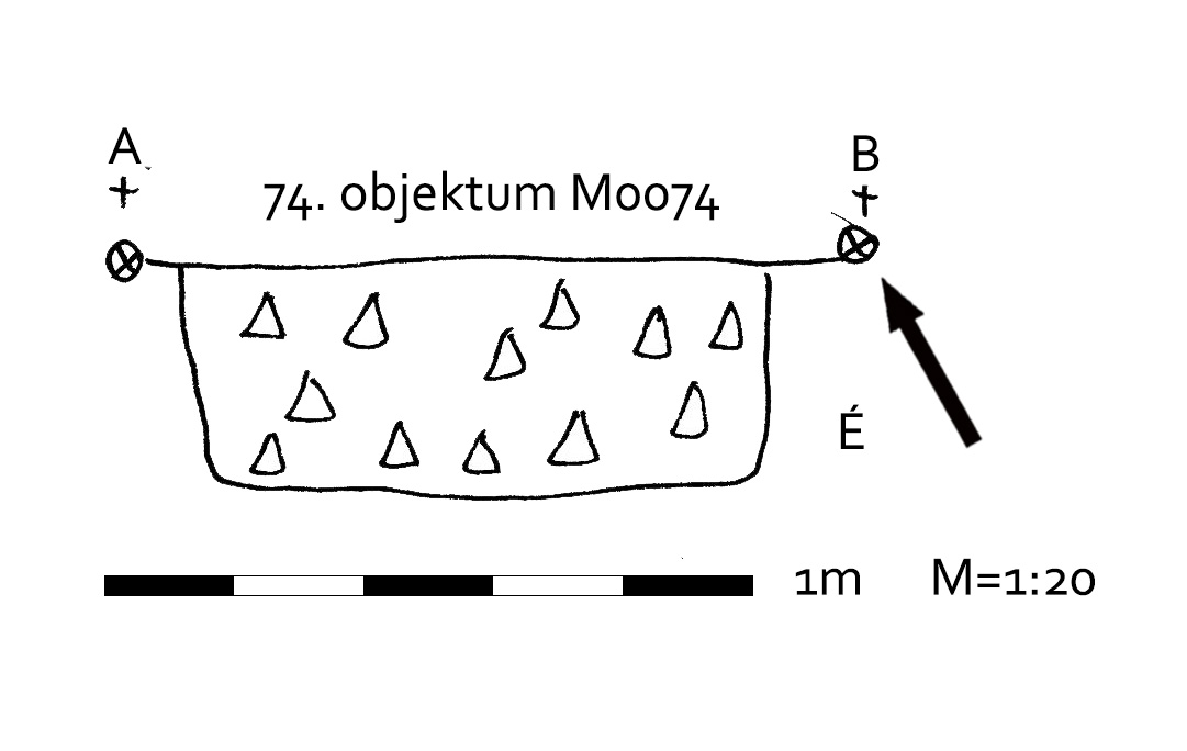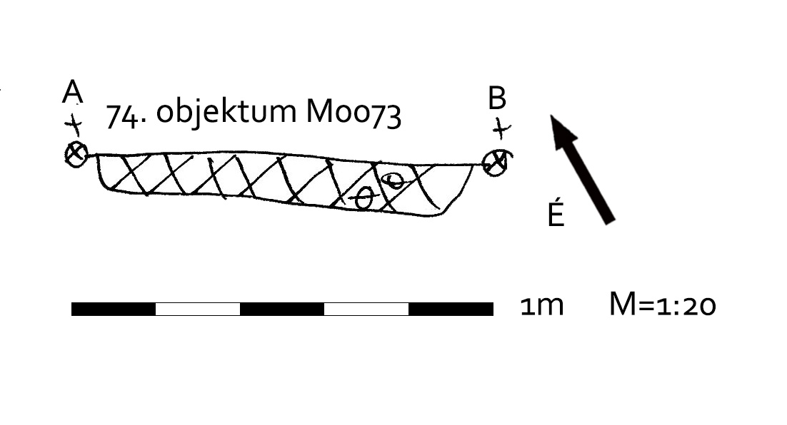 Félköríves barna elszíneződés jelentkezett a 68 számú objektumtól D-re. A metszet alapján talán tényleg objektum. Betöltése egynemű barnásszürke. Meredek falú, egyenes aljú árok. Továbbo bontásnál az árok mélyült és szélesedett. Itta betöltése kevert sárga - szürke. Keletre körülbelül 95 centiméter átmérőjű gödörré bővül. Itt a mélysége 45 centiméter. Fala egyenetlen, függőleges. Az íves rész 226 centiméter. Funkciója kérdéses.