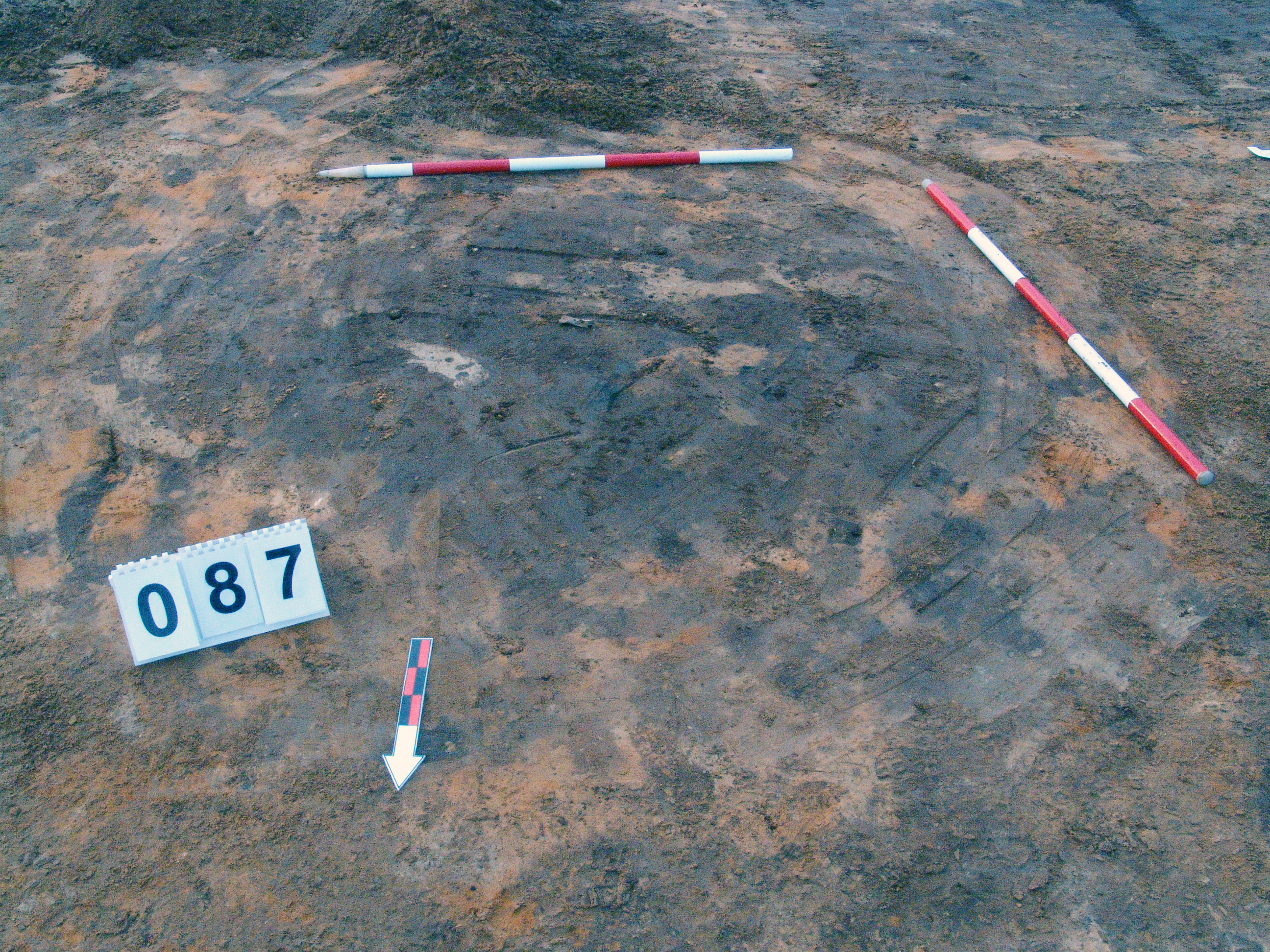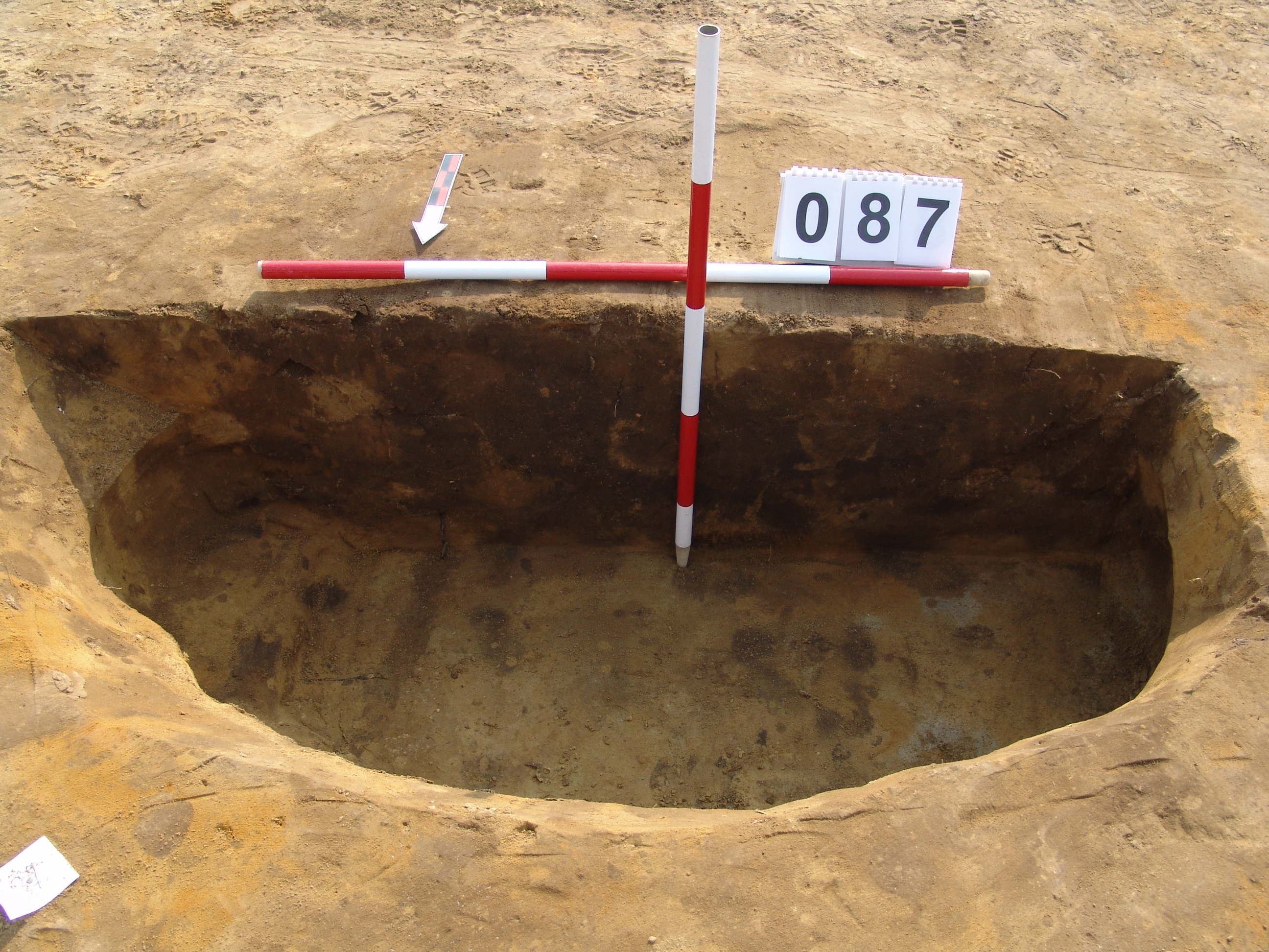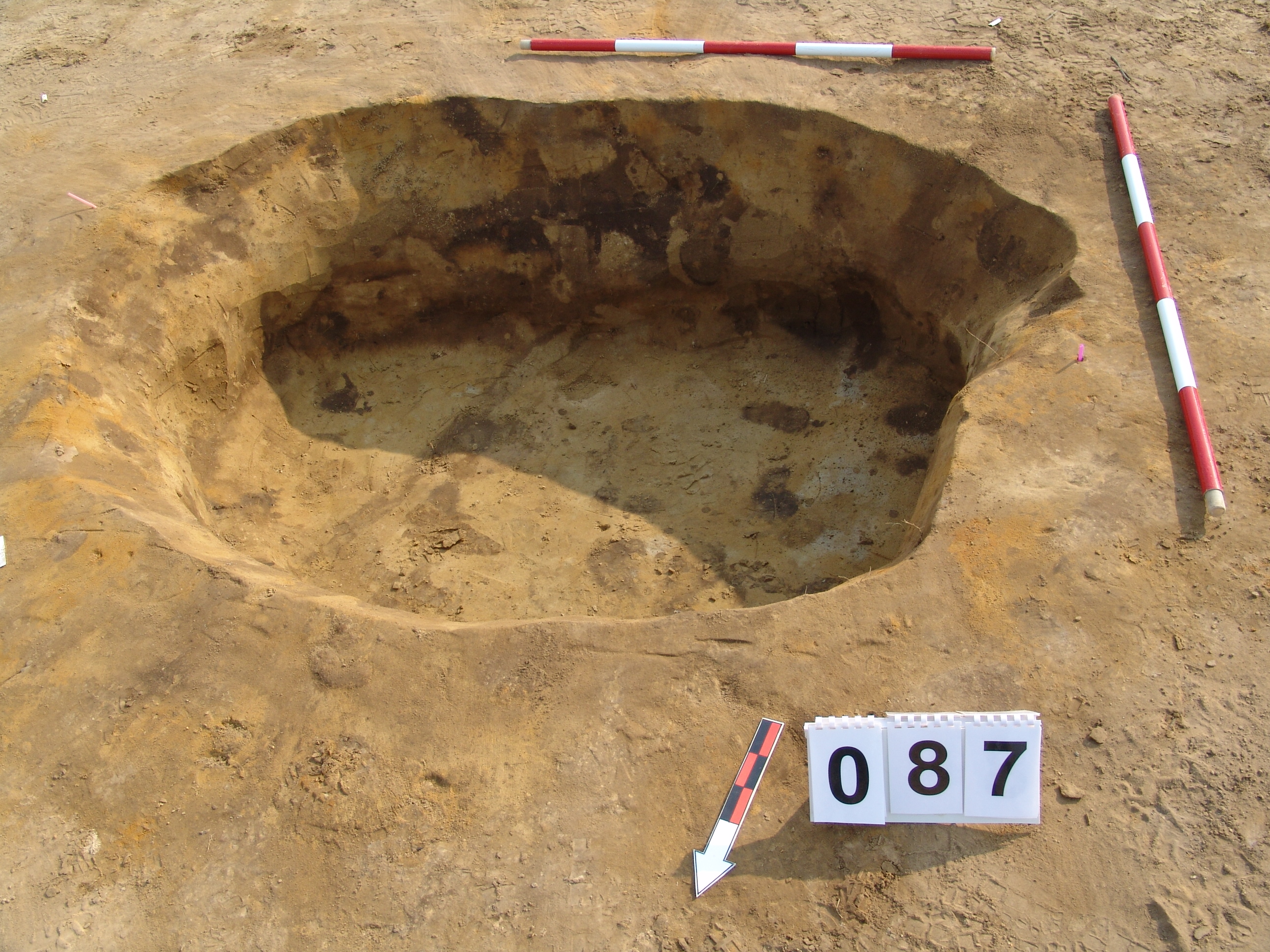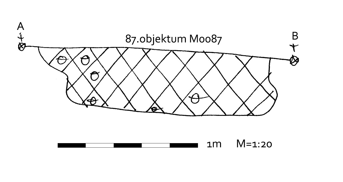 A 8 és 84 számú objektum közötti részen jól látszó, kerek folttal jelentkező gödör. Metszet: nyugati felében dongásan kiszélesedő, keleti részén meredek oldalfalak (itt túlbontott), egyenes alj. Betöltése: sárgával kevert szürkésbarna humusz. Bontás után ovális formájúvá vált.