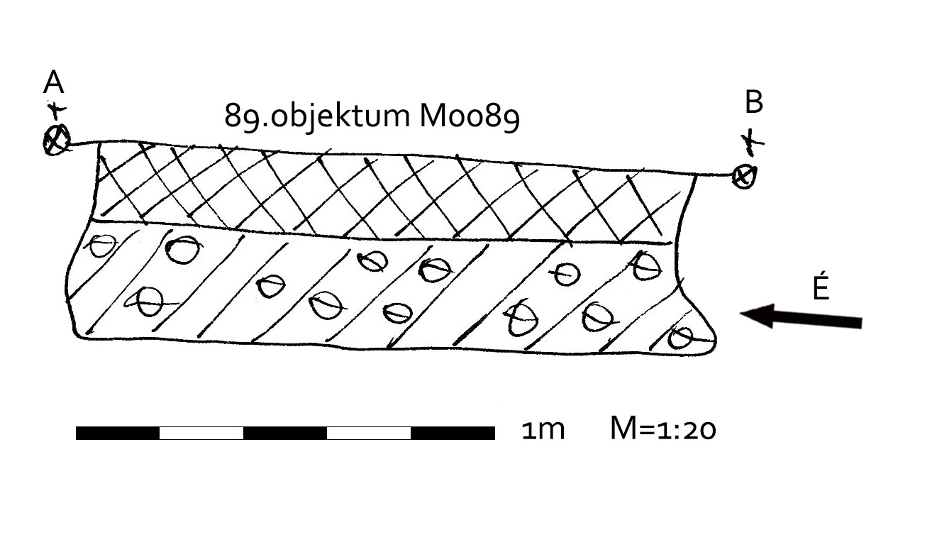 A 88 számú objektumtól K-re kicsit elúszó szélű, sötét, jól látszó folttal jelentkező gödör. Réteges betöltésű, felül sötét barnásszürke, alatta világosabb sárga szemcsés barna betöltésű gödör. Átmérője fent D-É 130, Ny-K 145 centiméter, lent d-É 140, Ny-K 140 centiméter. Mélysége:41-50 centiméter.