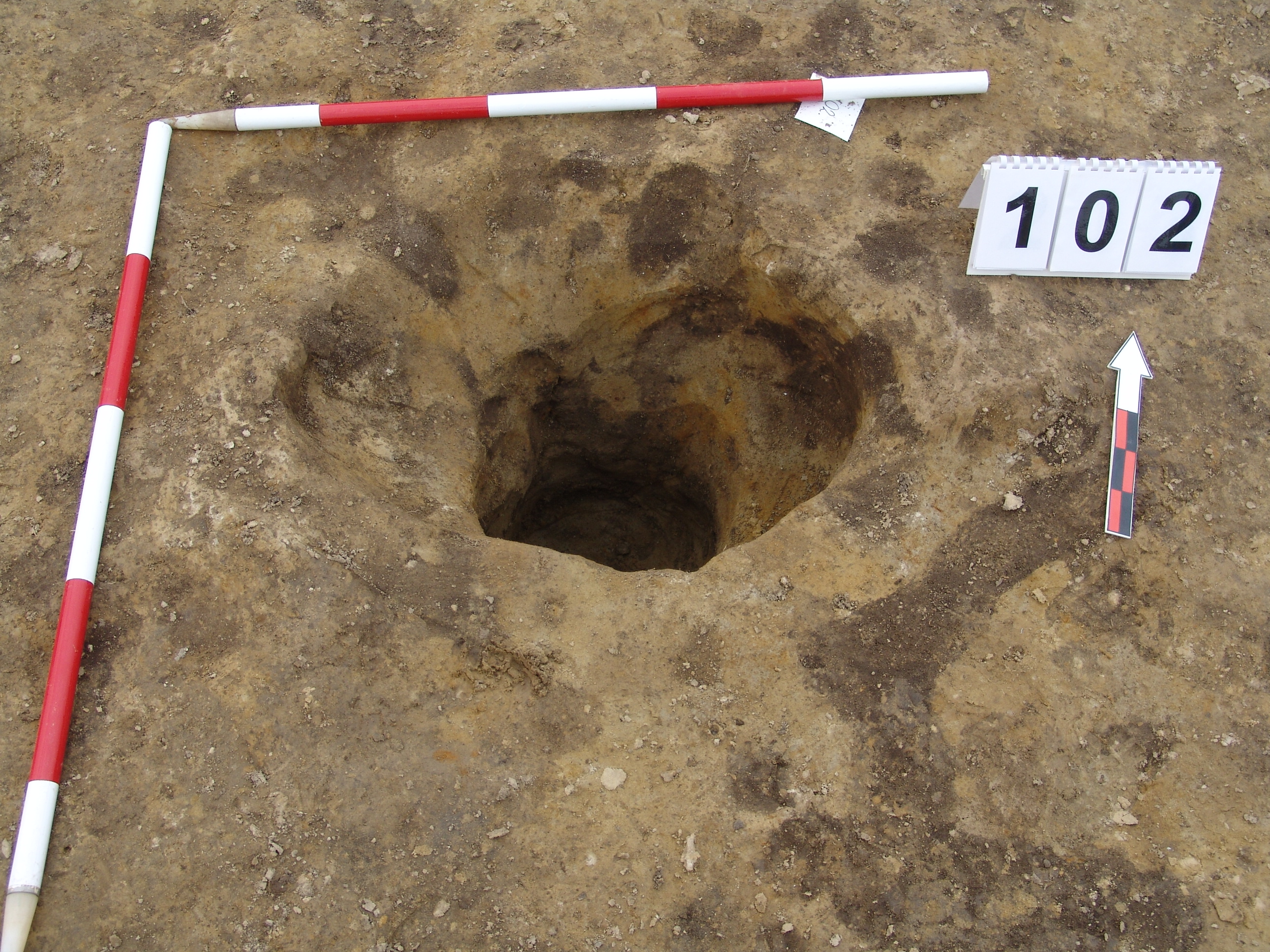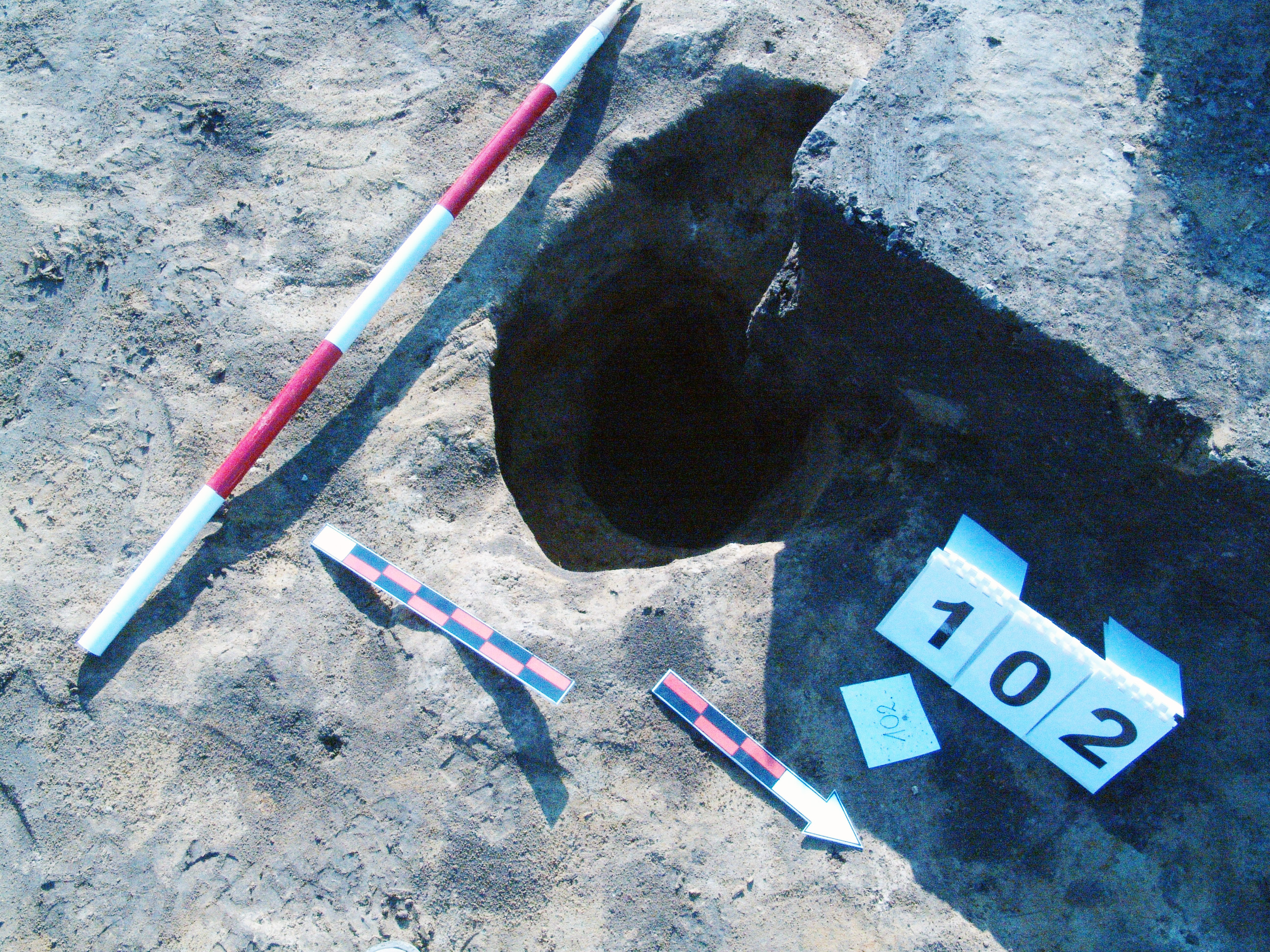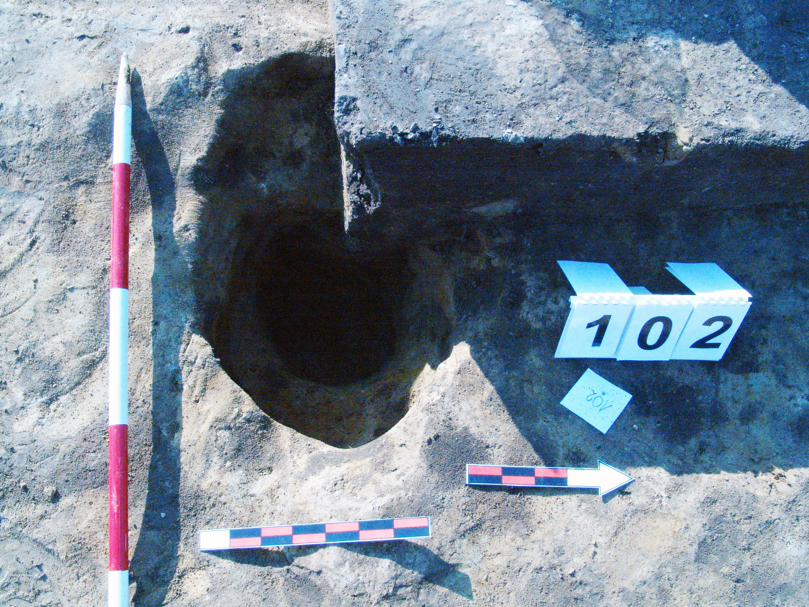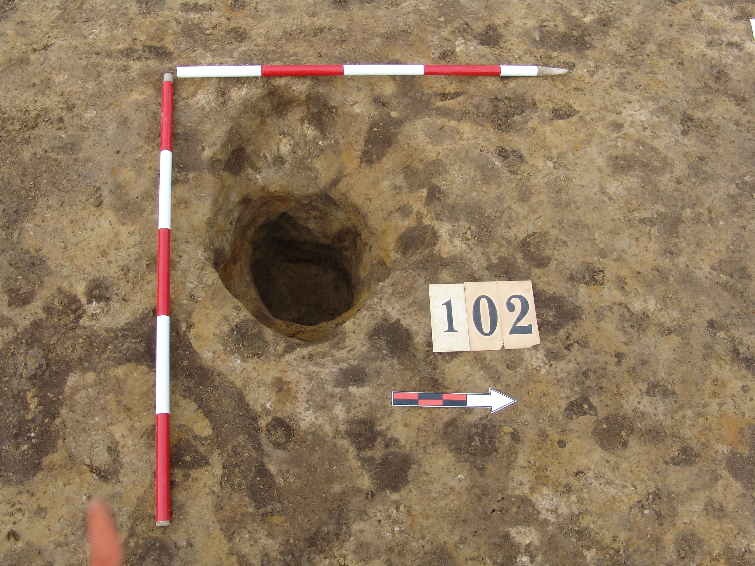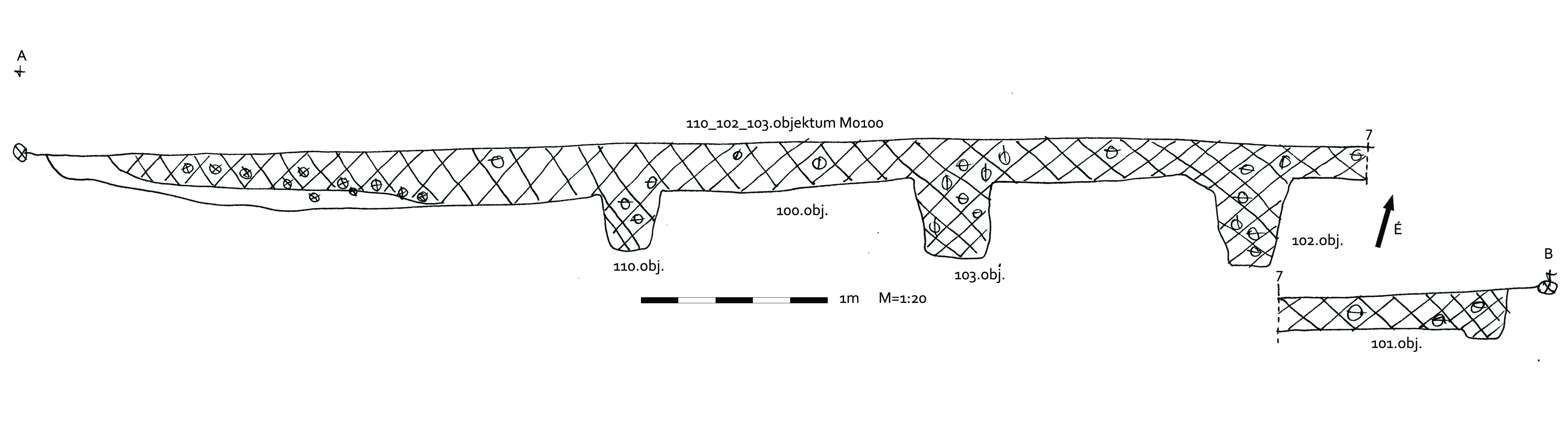 A 100 számú ház Ny-K -i középtengelyében K-ről a második cölöplyuk. Átmérője fent Ny-K 65, É-D 48 centiméter. Mélysége 55-59 centiméter mély a padlótól. K-i oldalán 25 centiméter mélyen összeszűkül. Innen átmérője 30 X 35 centiméter. Betöltése ugyanolyan, mint a 100 számú objektumé sötét barnásszürke.
