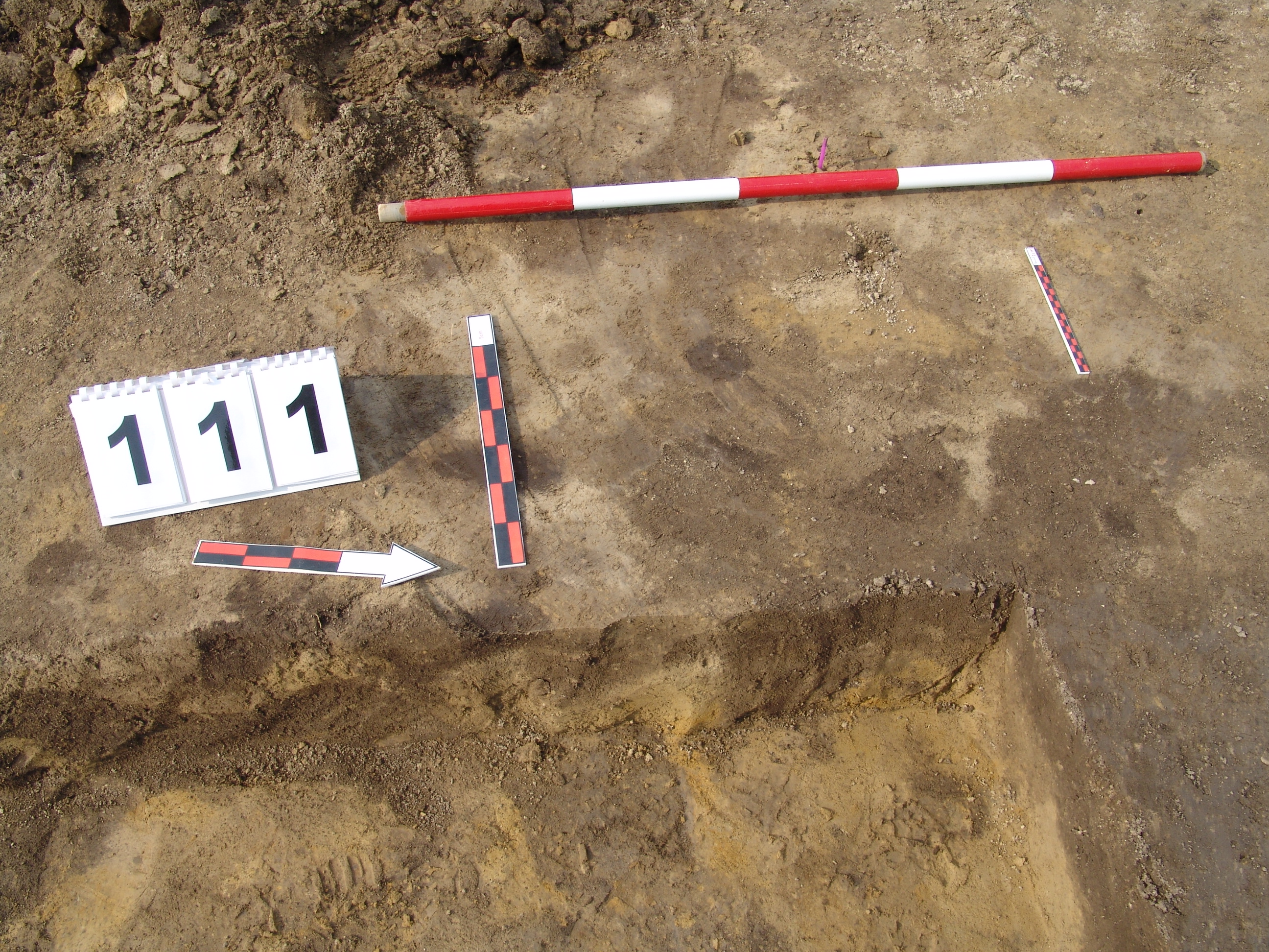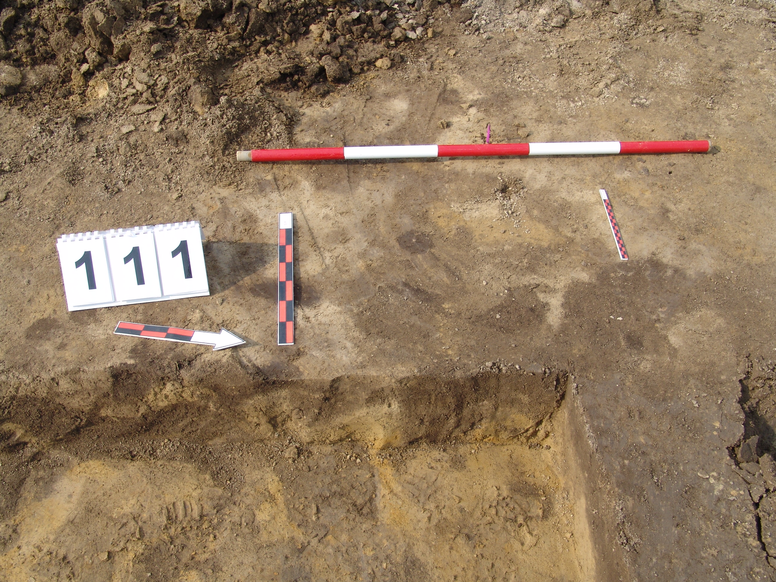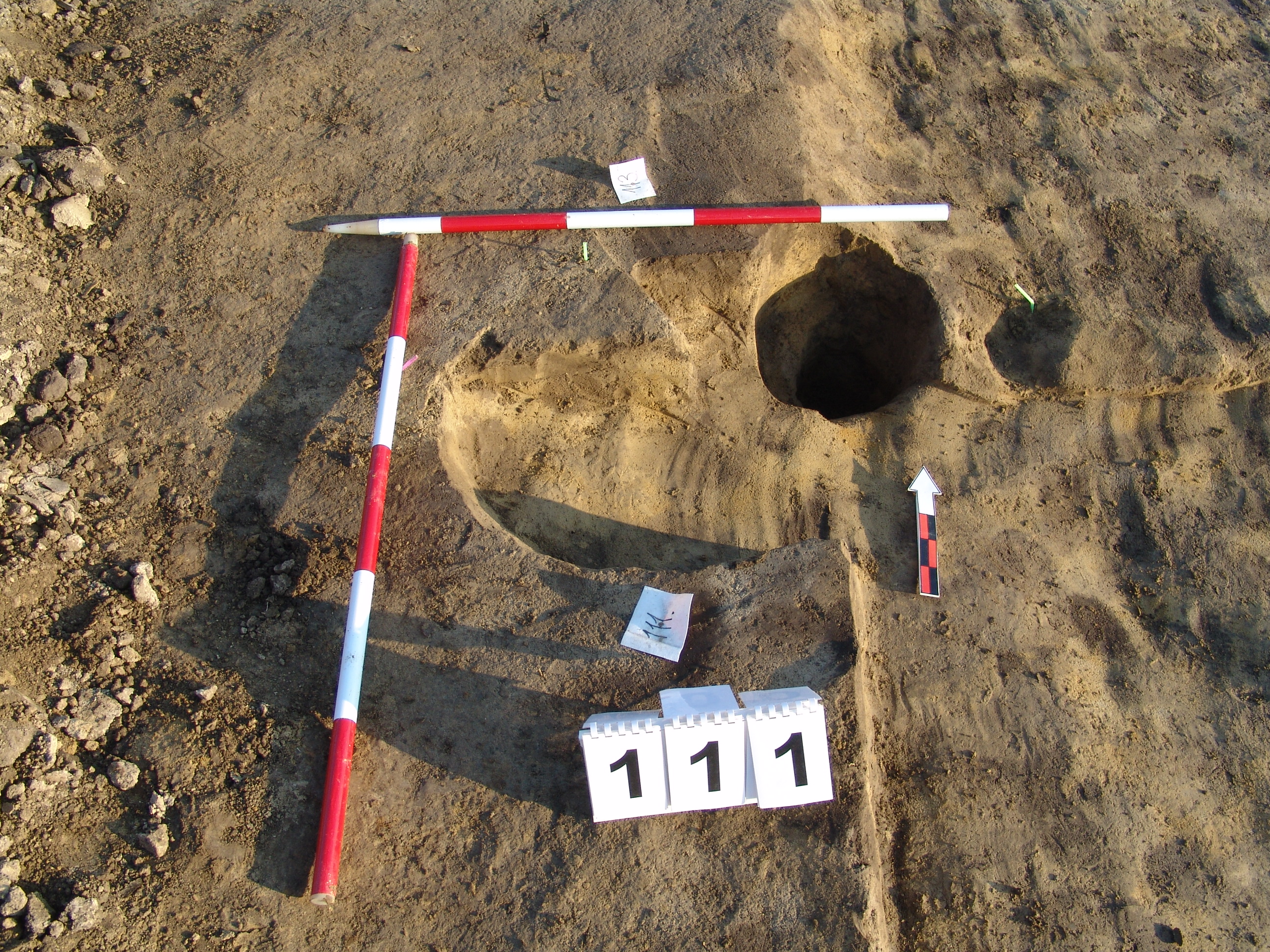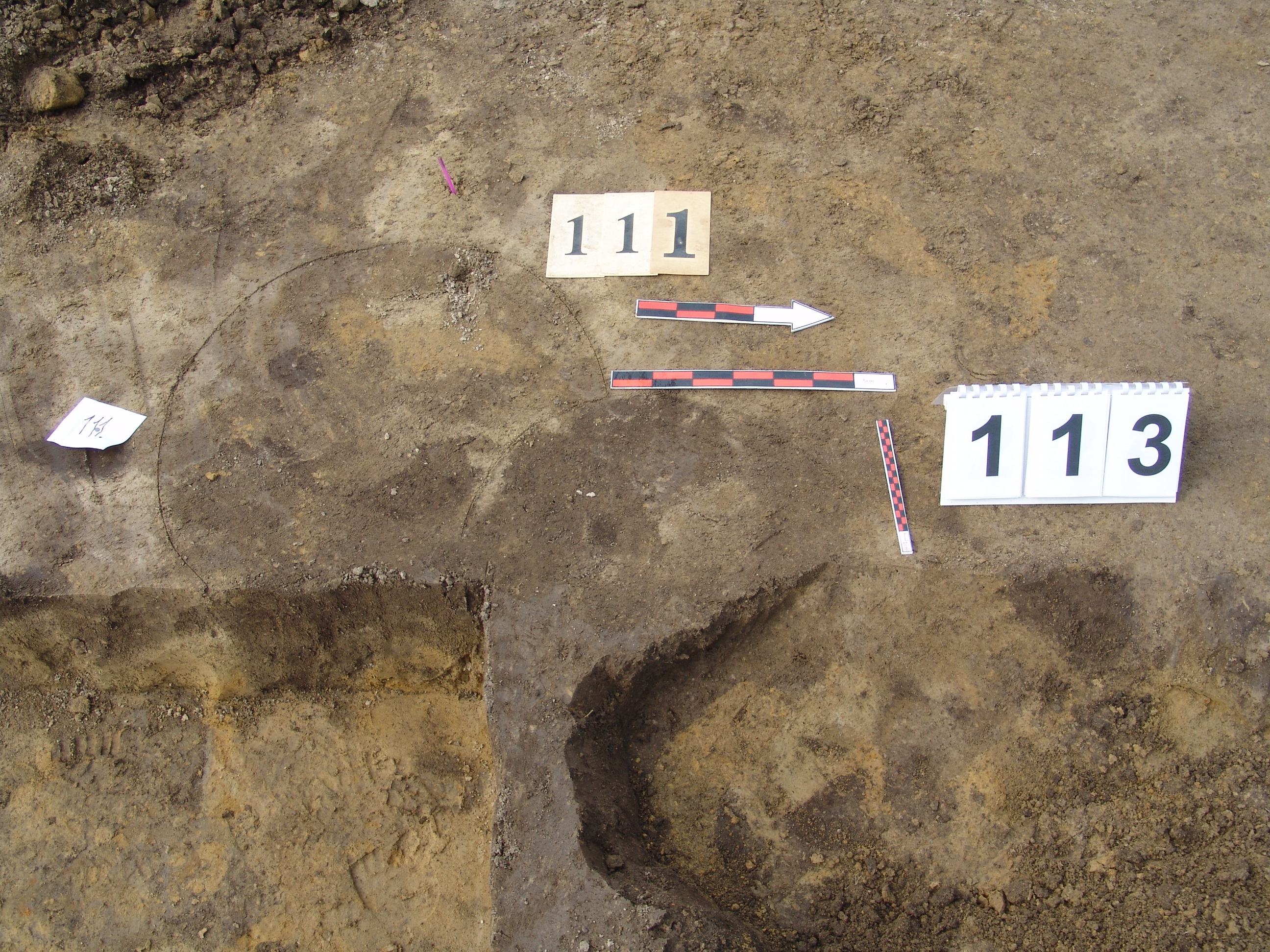 A 100 számú ház Ny-i rövidebb oldalánál, az építmény külső felén jól elváló sötét barna folttal jelentkezik. A 100 számú objektum Ny-i falából "kiugrik", közvetlenül a 113. számú cölöplyuk mellett van. Alja lejt a 113 számú objektum irányába. Fala kissé meredek. Betöltése világosabb sárga és szürke. Valószínűleg a 113 cölöp felállításakor keletkezett. Átmérője fent É-D 52, Ny-K 50 centiméter. Mélysége 13 centiméter. Ez az egyik lehetőség, de valószínűbb, hogy nem régészeti jelenség.