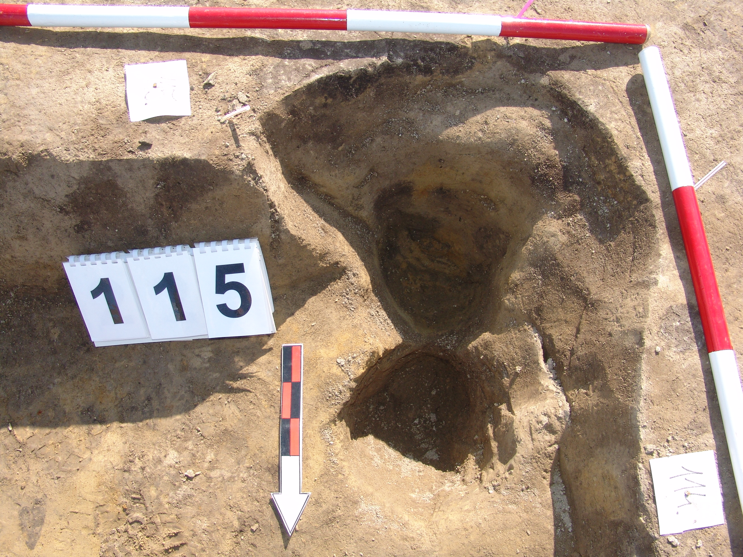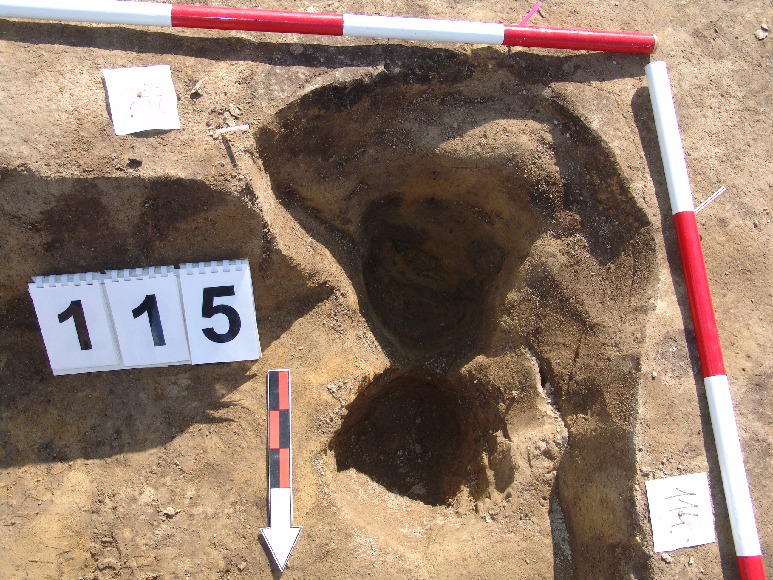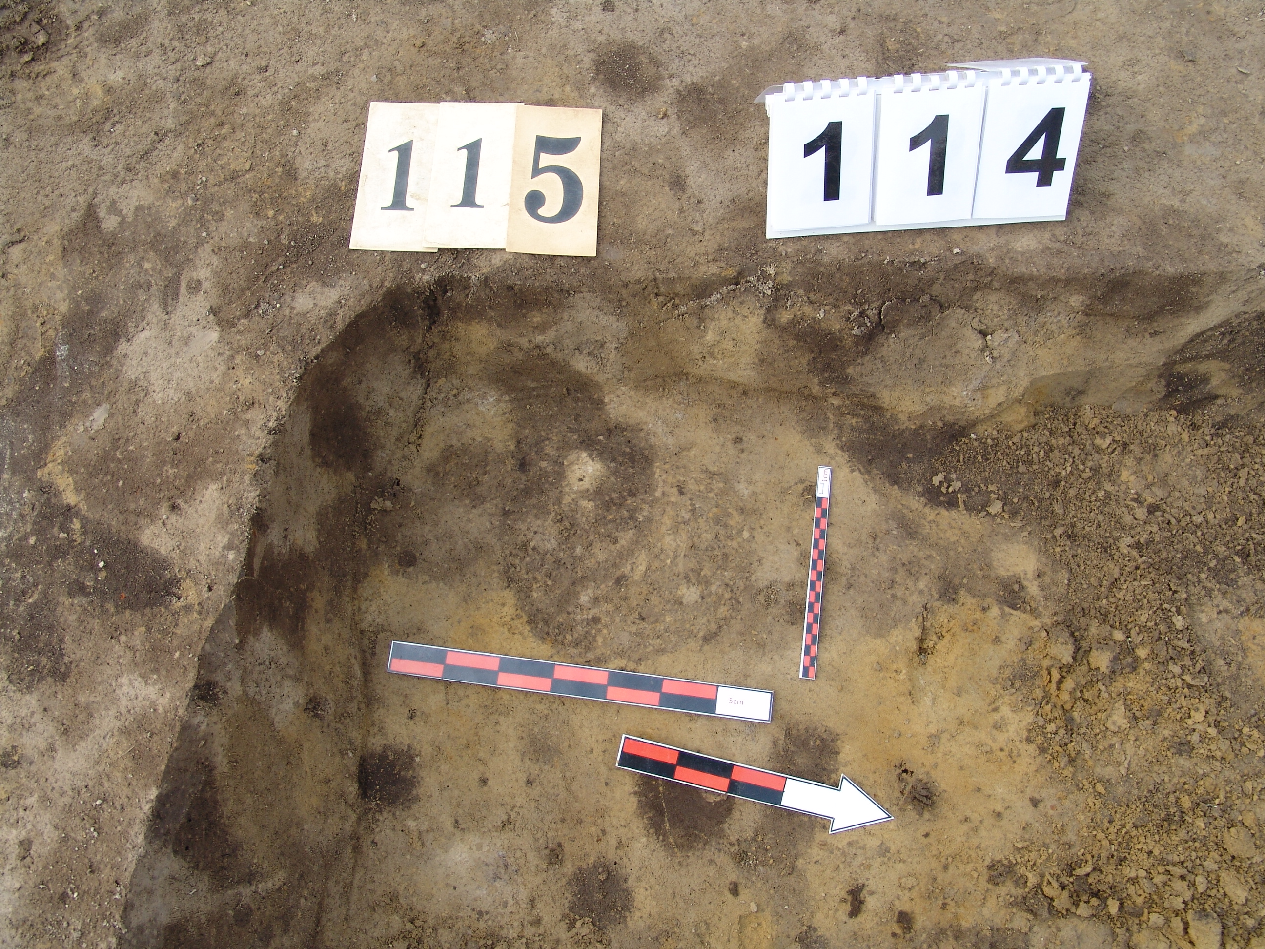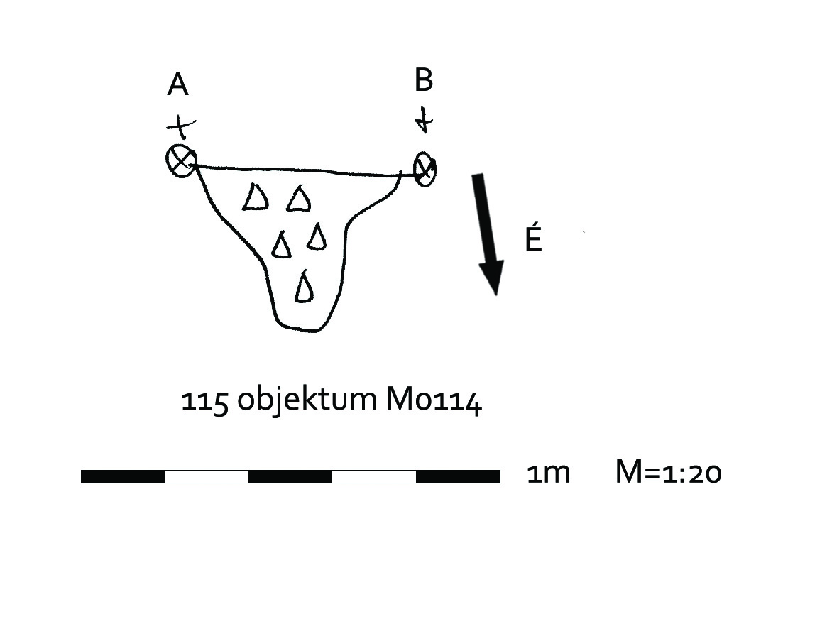 A 100 ház DNy-i sarkában kerek, sárgával kevert, kissé bizonytalan folttal jelentkezik, vágja a 114 cölöplyukat, lehet, hogy megújításról van szó. Az újranyesésnél még mindig jól látszott a folt. Elképzelhető, hogy a 114 objektum megújítása vagy behelyezéskor keletkezett. Betöltése sárga szemcsés szürkésbarna, erősen állatjáratos. Átmérője a jelentkezési szinten 40, a ház padlószintjén 21 centiméter. Mélysége 40 cm a ház jelentkezésétől, a padlószinttől 22 centiméter. Alul átmérője 16 centiméter.