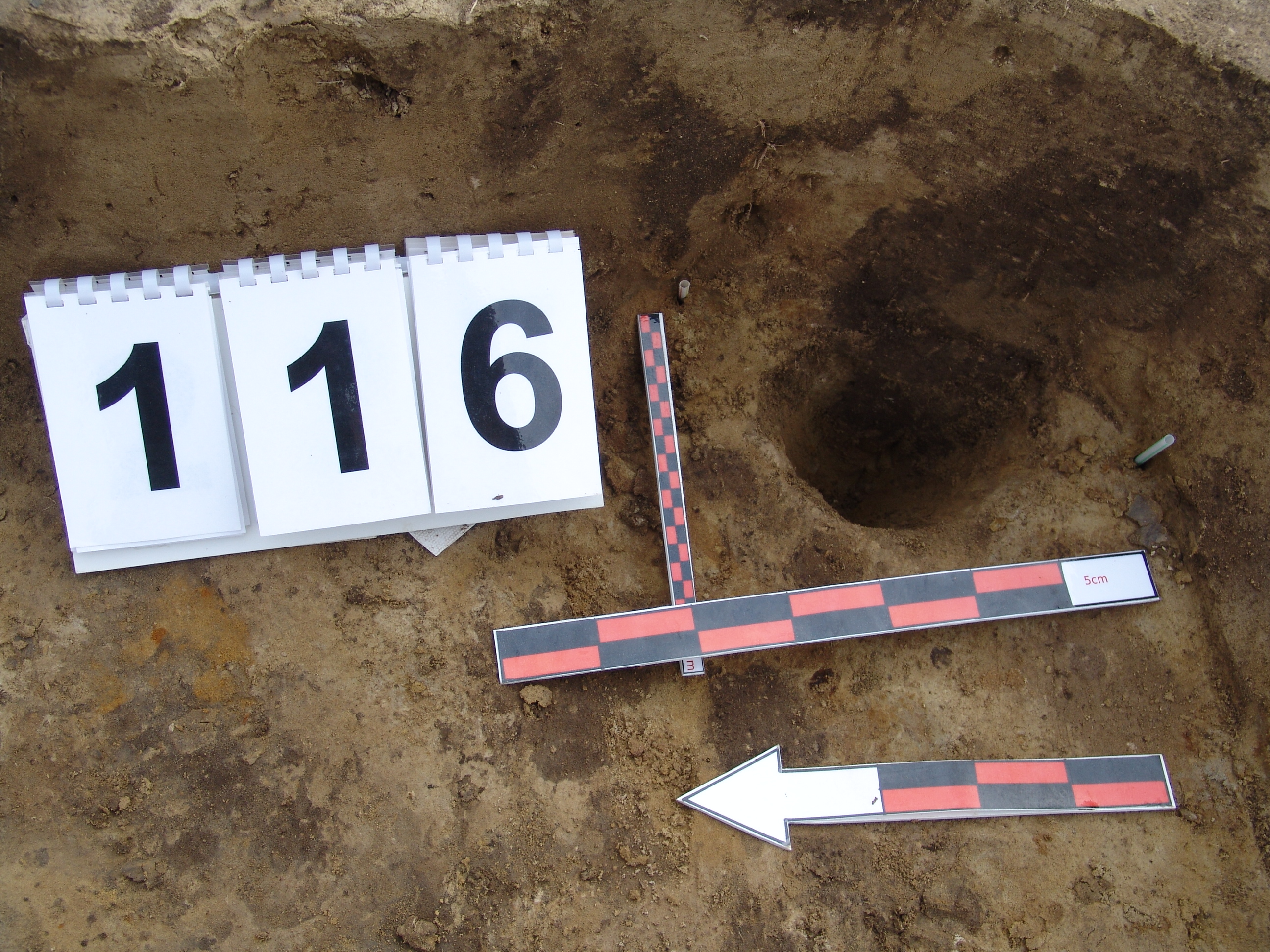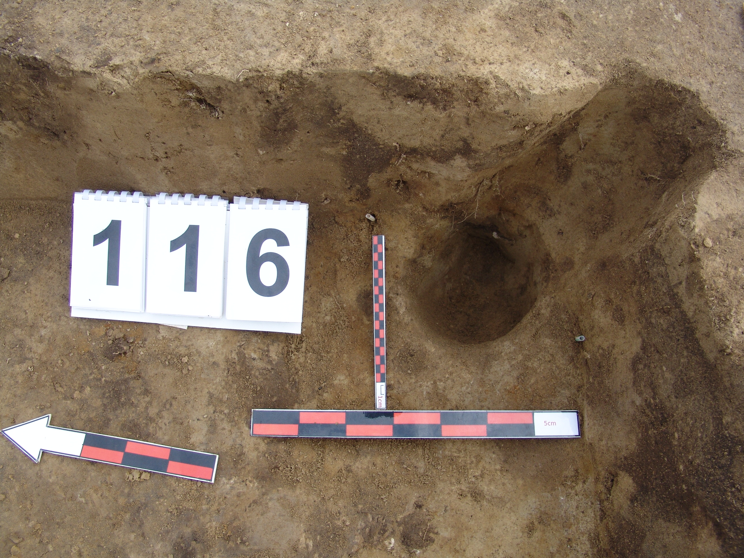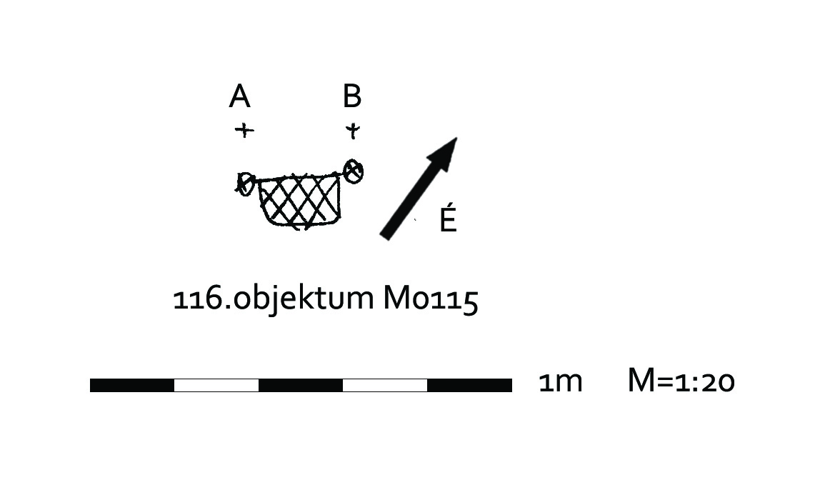 A 100 objektum DK-i sarkában jelentkező kissé elúszó folttal jelentkező "kiugrik" a ház falánál DK-re. A ház jelentkezési szintjén átmérője 15 X 26 cm. Betöltése: egynemű, sárga-szürke szemcsés szürkés. Átmérője a padlószinten 15 X 17 cm, alján 12 cm. Mélysége a ház jelentkezési szintjétől 36, a padlótól 22 centiméter.