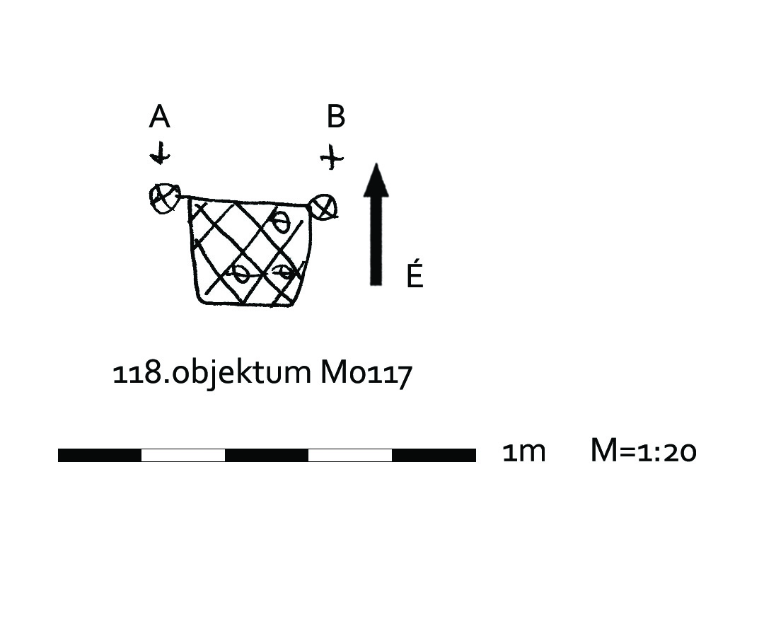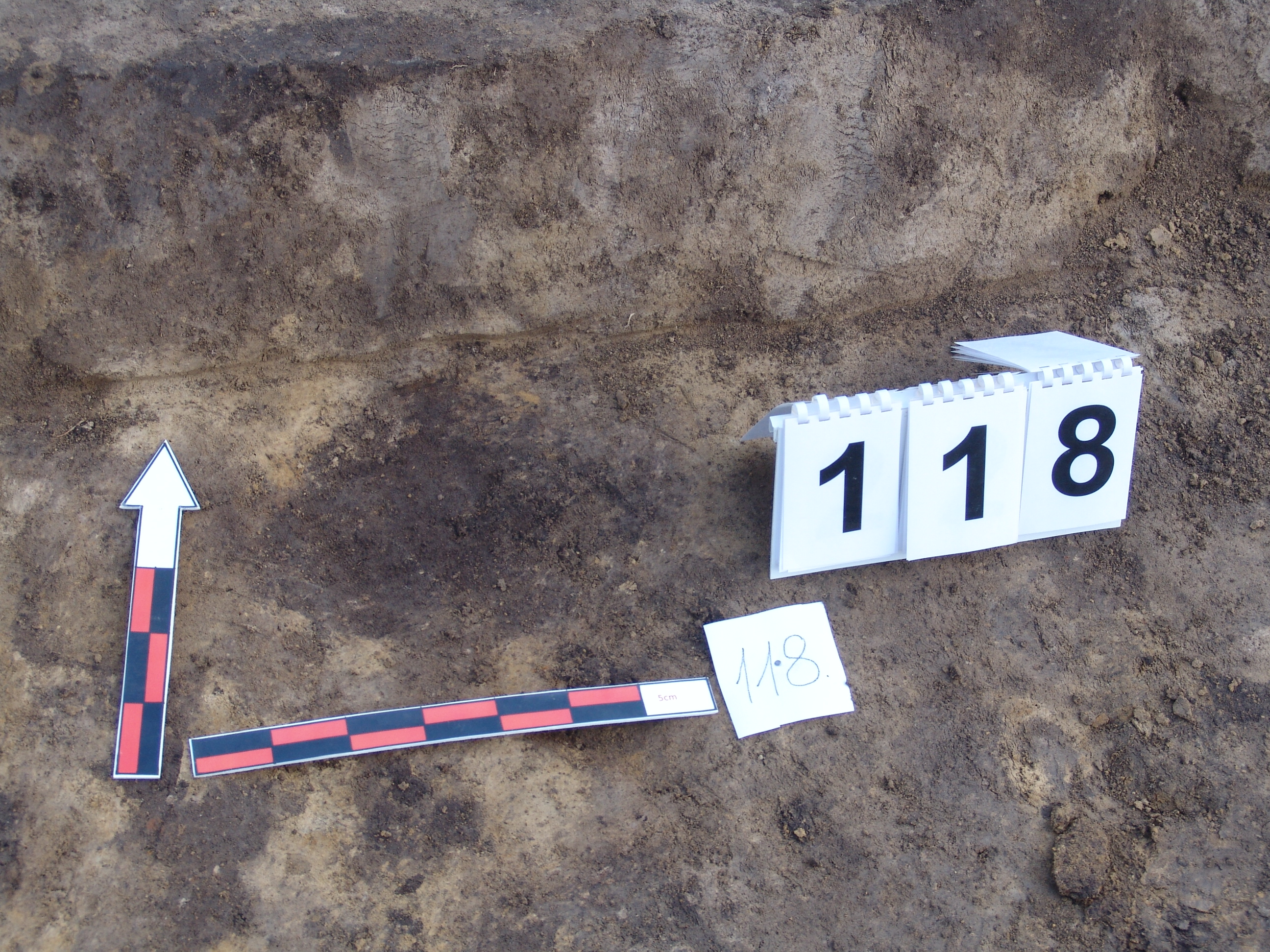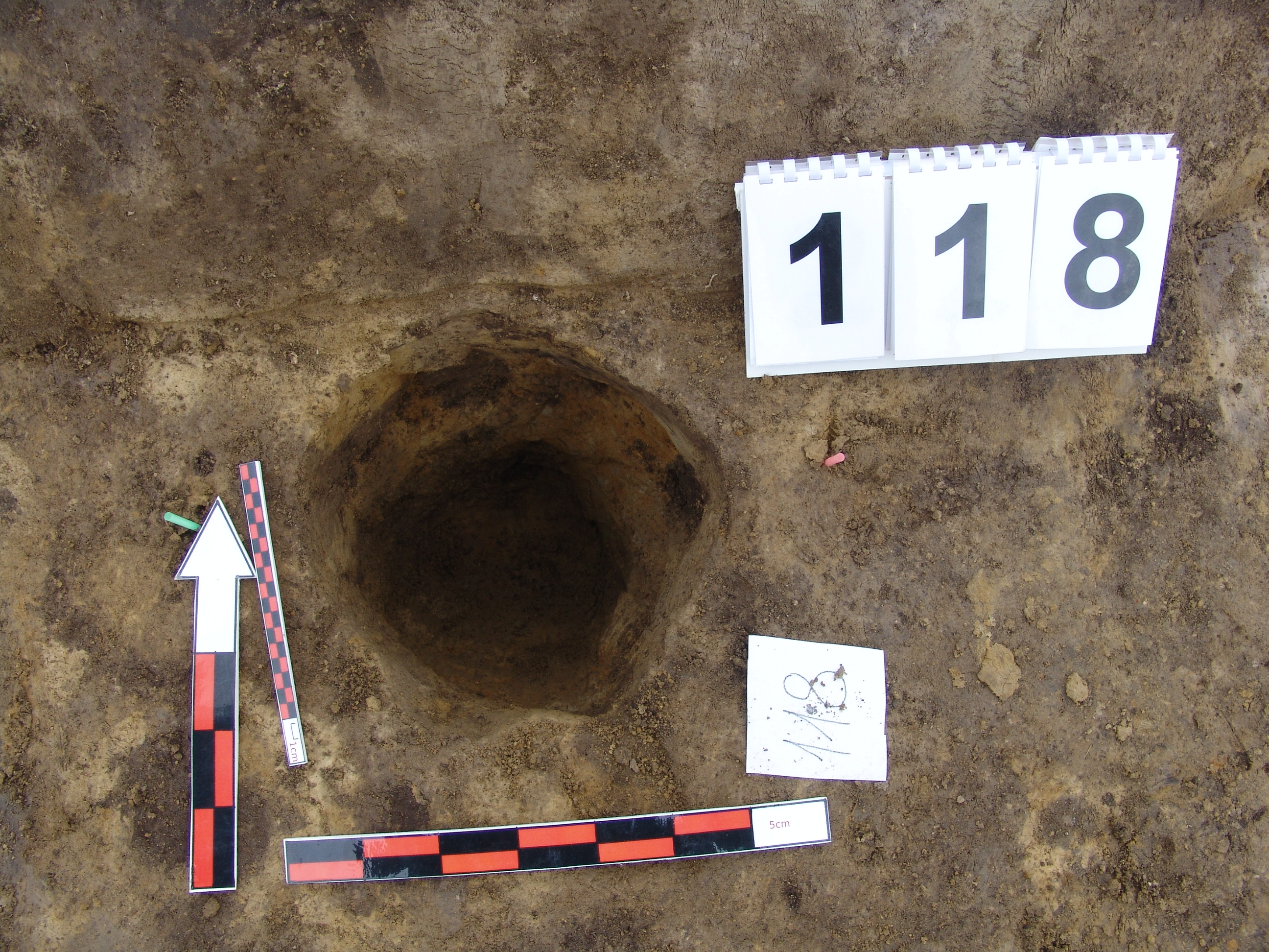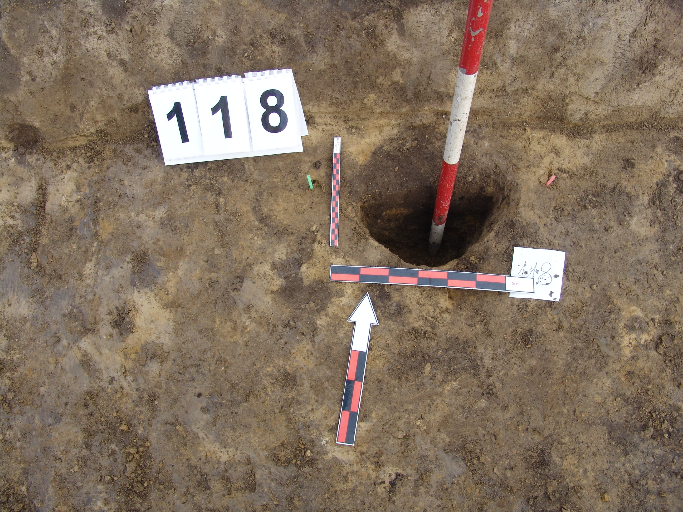 A 109 és 110 cölöplyuk irányában a 100 objektum É-i fala mellett Ny-ról a 2. cölöplyuk. Szabályos kerek folttal jelentkezett. A 109 és 110 objektum vonalában É-ra a 100 ház északi fala mellett jól látszó kerek folttal jelentkező cölöplyuk. Betöltése sárga szemcsés sötét barnásszürke. átmérője a padlószinten 26 X 28 cm. Mélysége 36 cm a padlószinttől. Átmérője az alján 21 cm. Mélysége a ház jelentkezési szintjétől 63 cm.