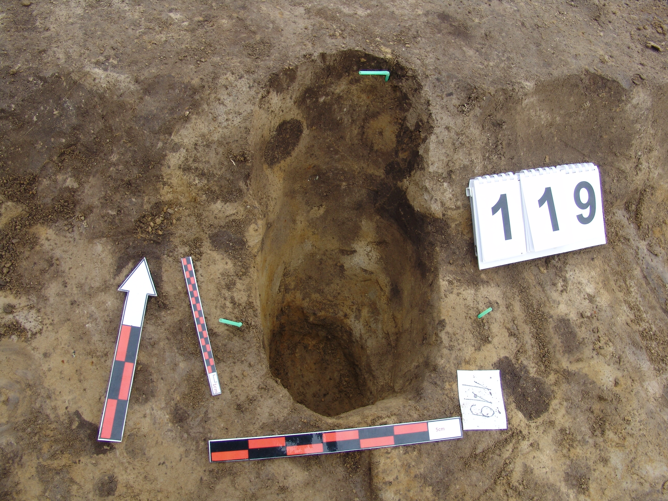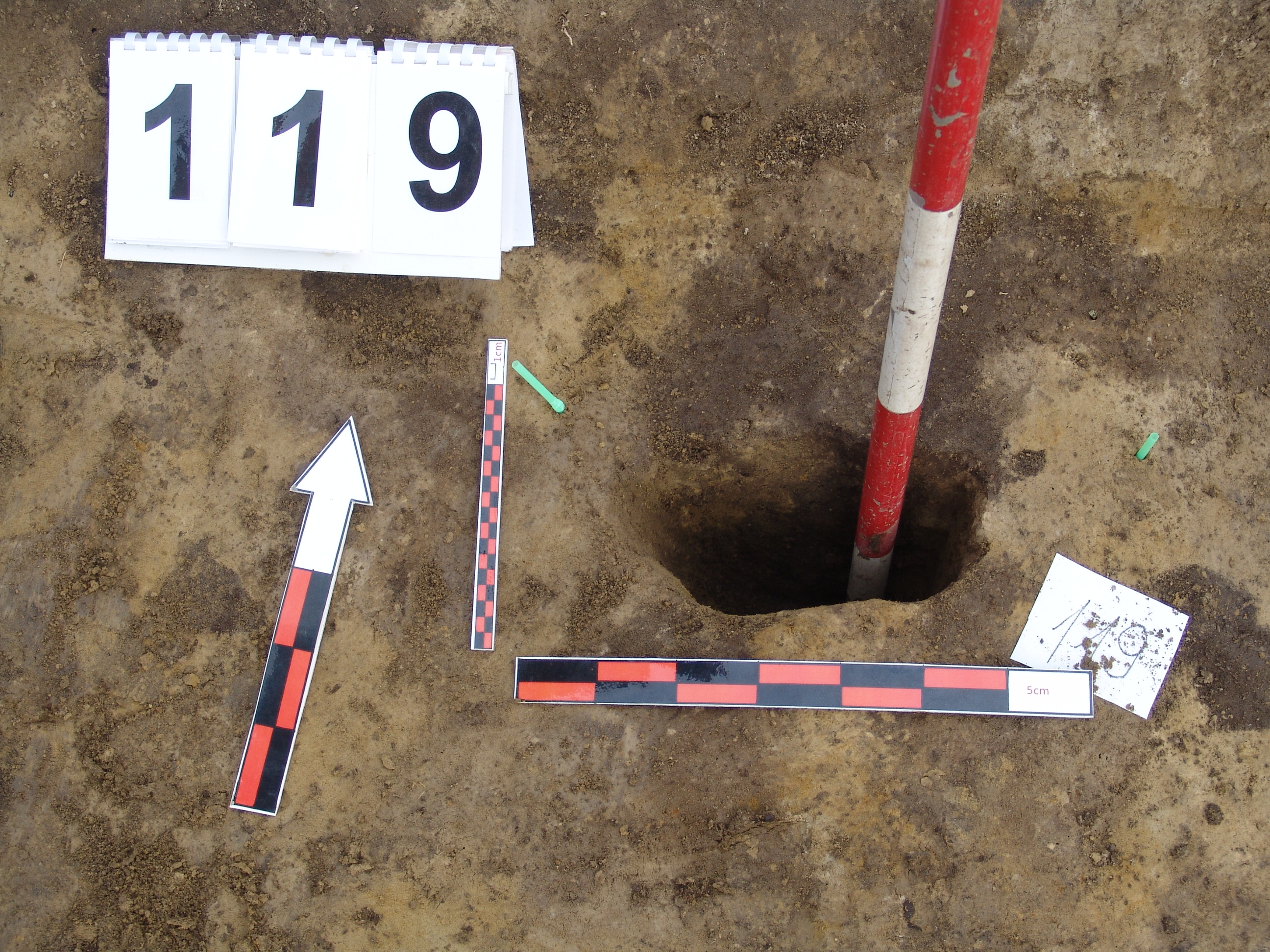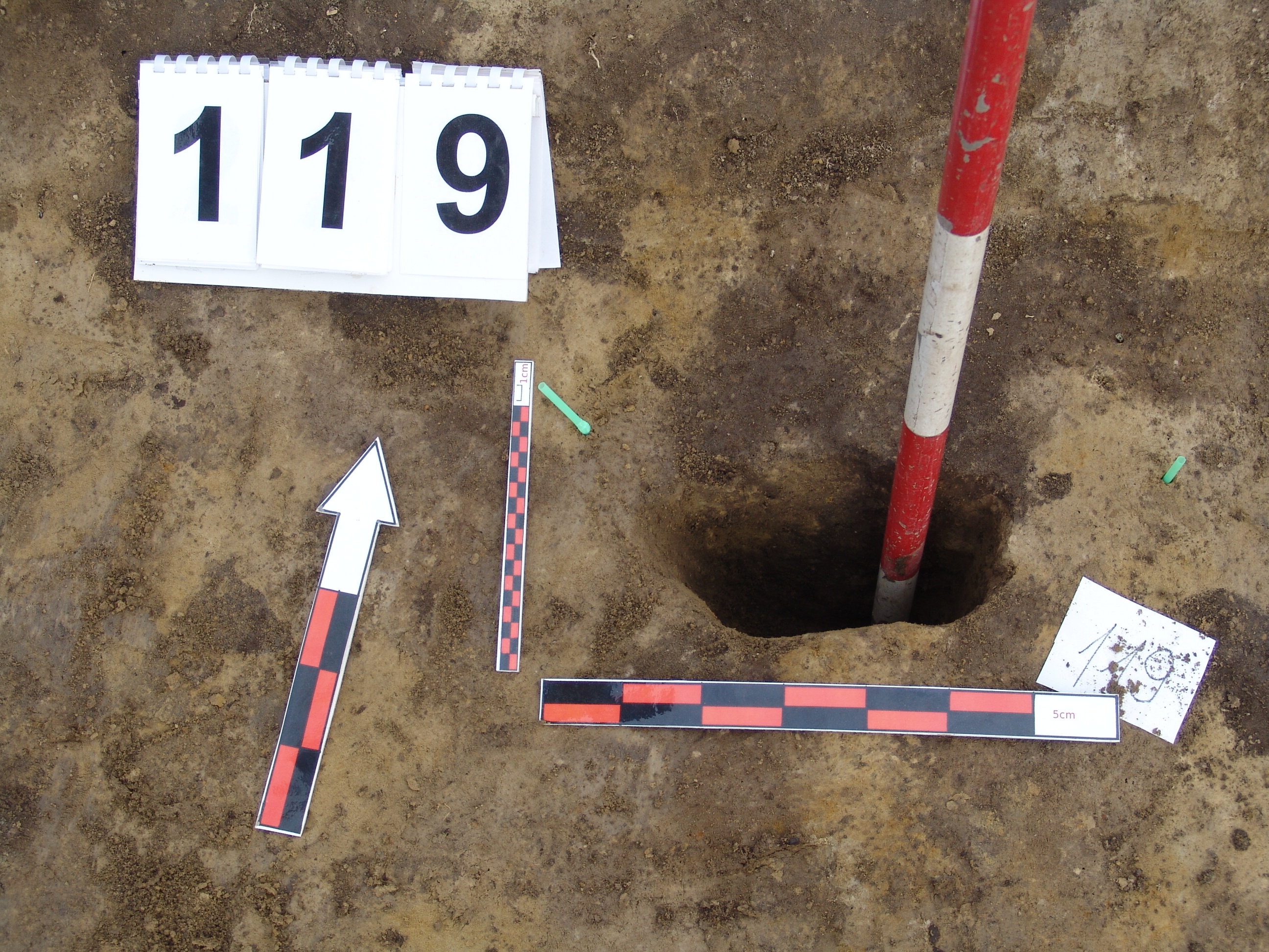 A 108 és a 103 cölöplyuk vonalában, azoktól É-ra, a 100 ház É-i fala mellett Ny-ról a 3. cölöplyuk. Kerek, jól látszó folttal jelentkezett. A padlószinten az átmérője 23 cm. Betöltése sárga szemcsés barnásszürke. Mélysége a padlószinttől 25 cm, a ház jelentkezési szintjétől 57 cm. É-ról igen meredeken indult egészen a ház falába ívelődve. Látszik, hogy innen állíthatták fel. Átmérője az alján 19 cm.