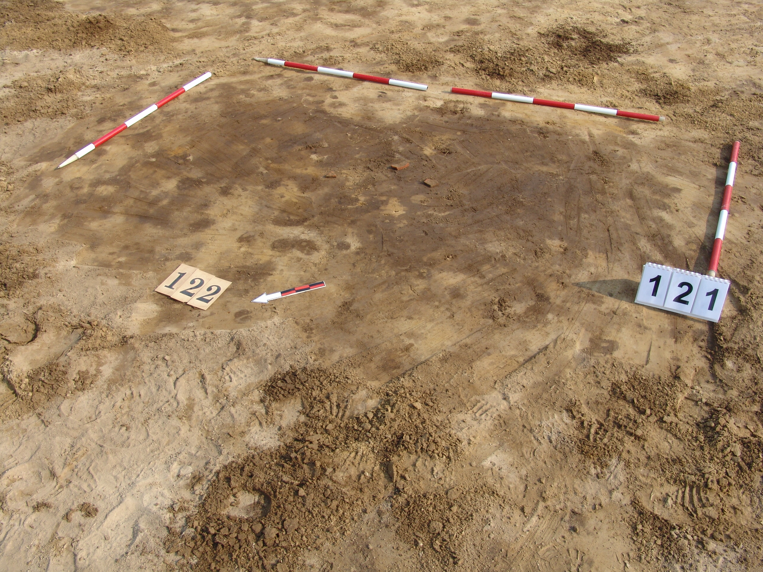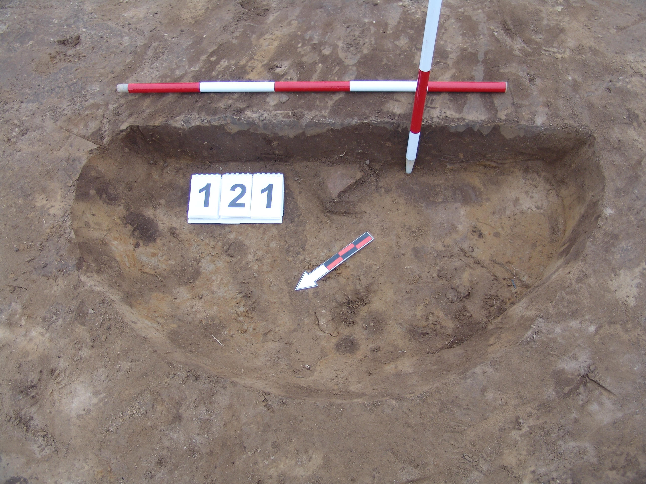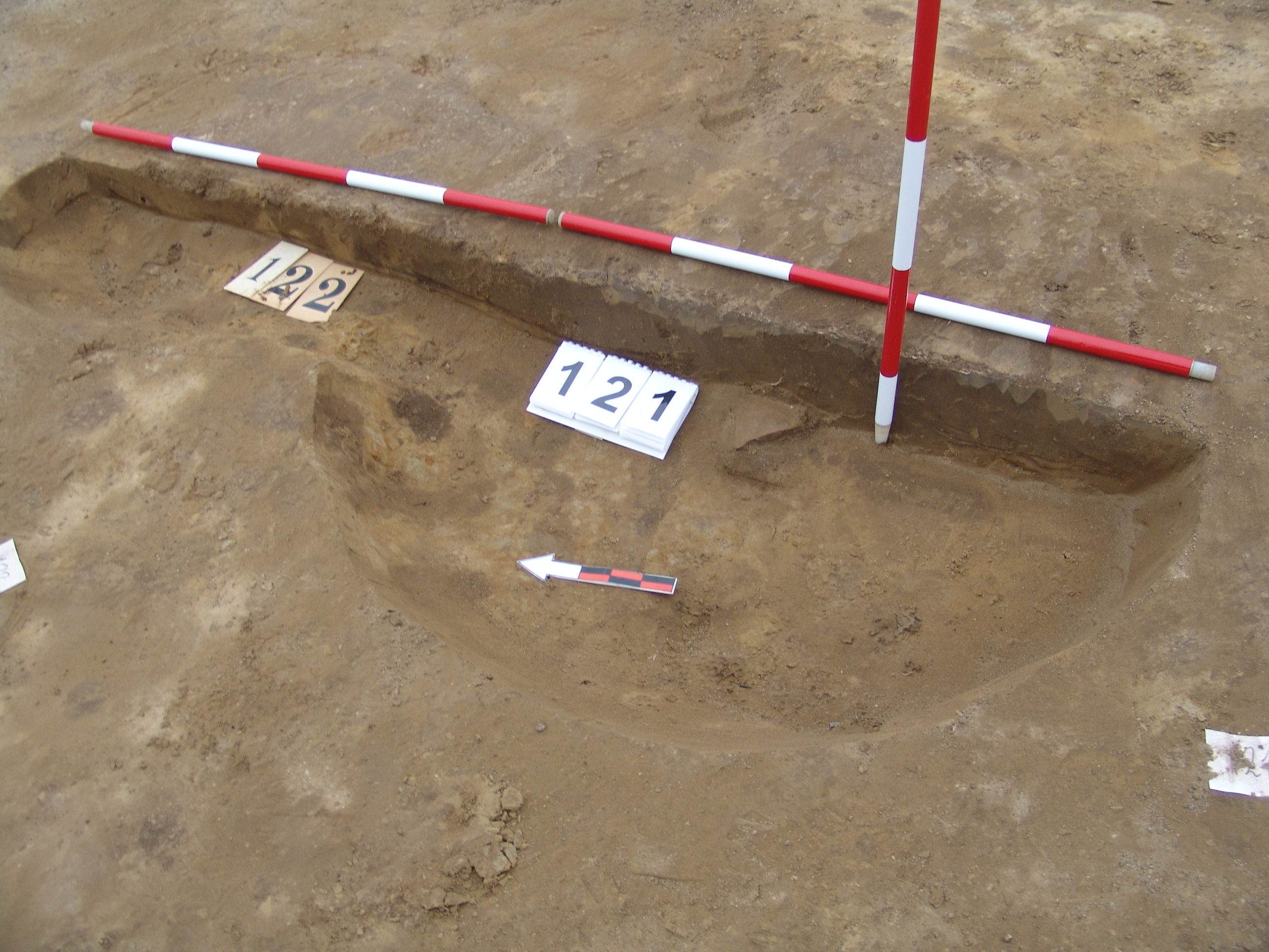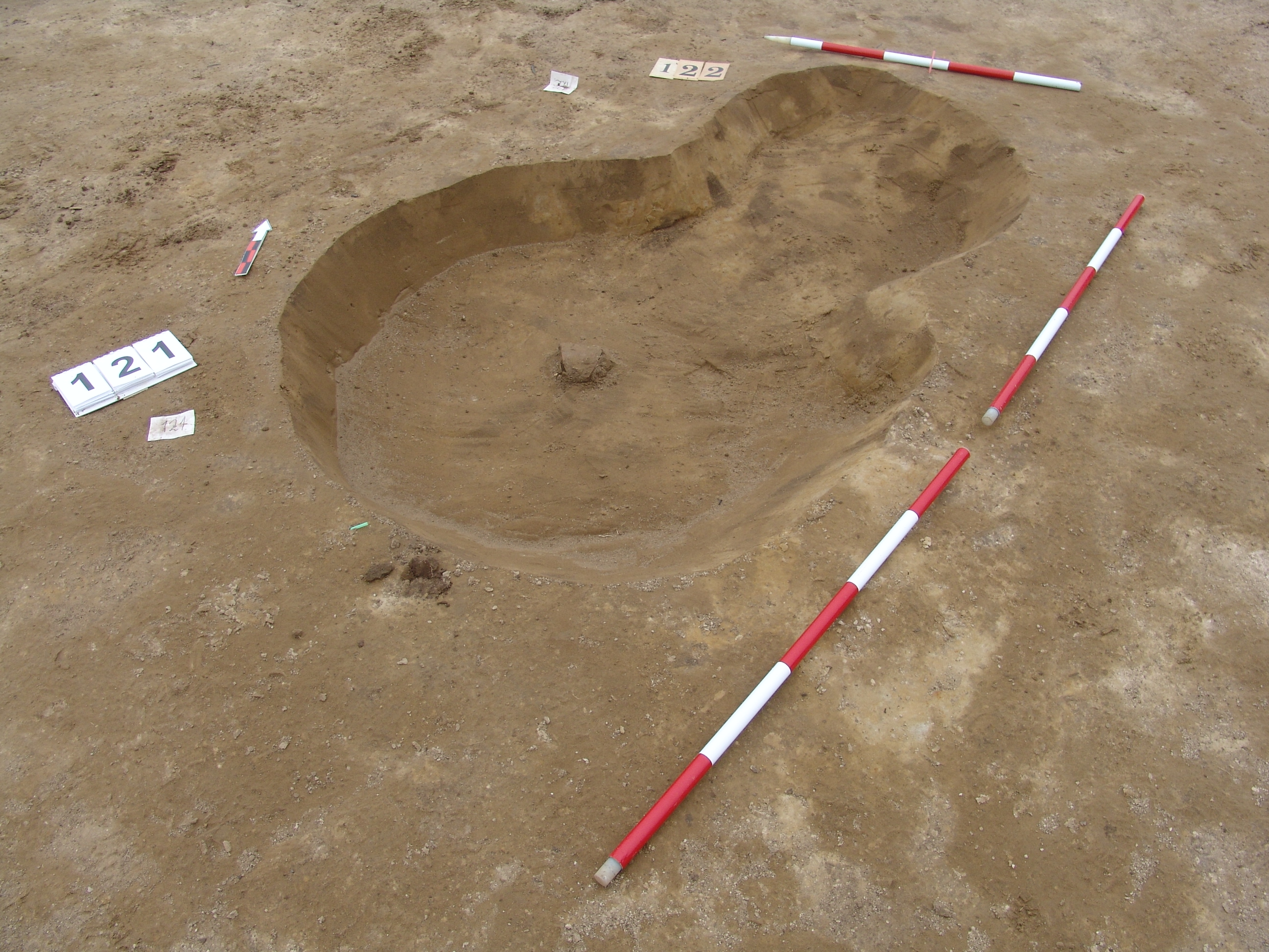 A 123 objektumtól Ny-ra, a 122 objektumra ráásva sárga szemcsével kevert viszonylag homogén sötétbarna, kerek folttal jelentkezik. Meredek falú, kör alaprajzú, vízszintes aljú gödör. Betöltése egynemű sötétbarna. Vágja az ÉK-i oldala a 122 objektumot. Átmérője fent É-D 138, Ny-K 138 cm, lent 106 cm. Az alján pár téglaszínű korongolt cserép.