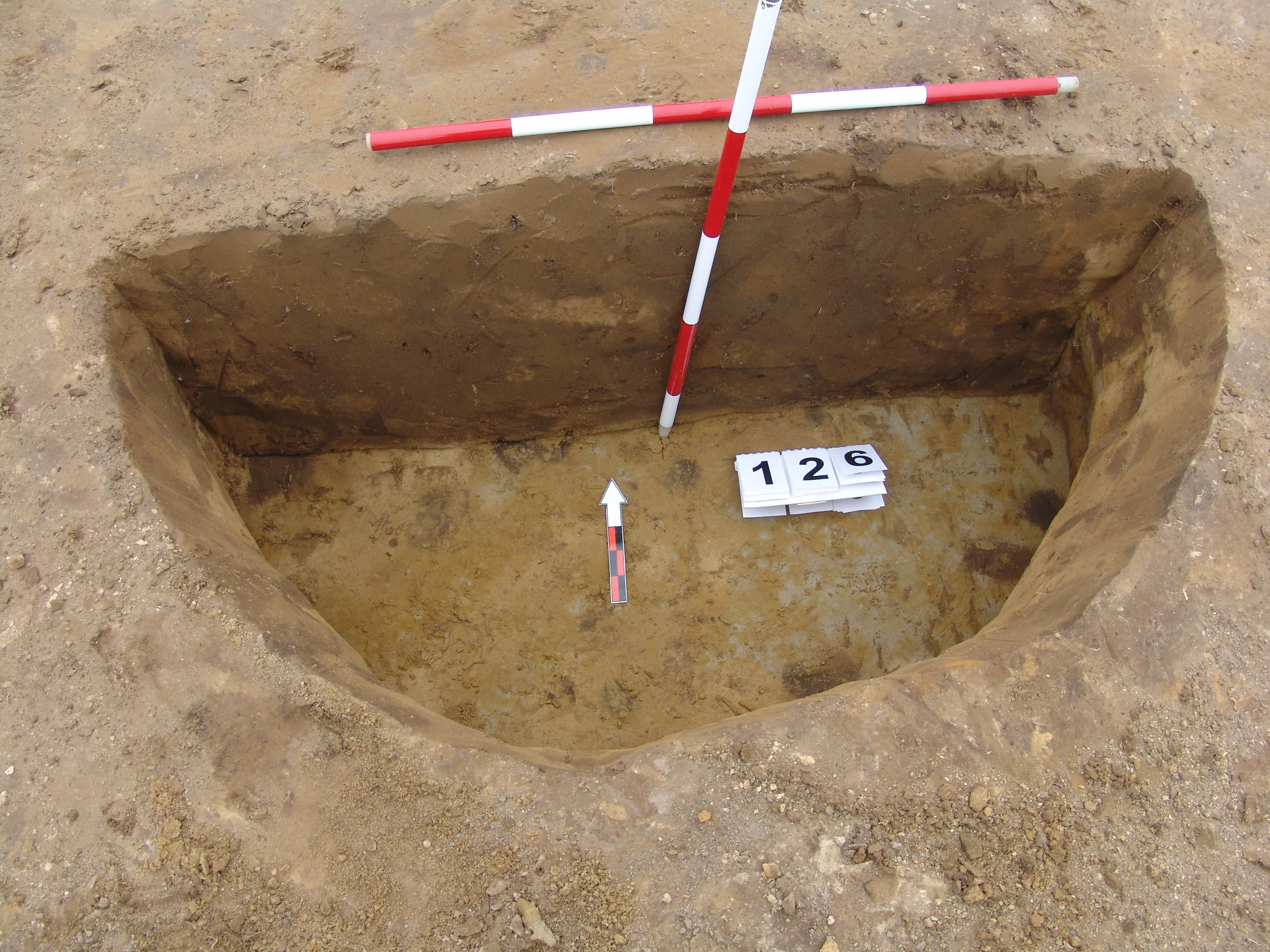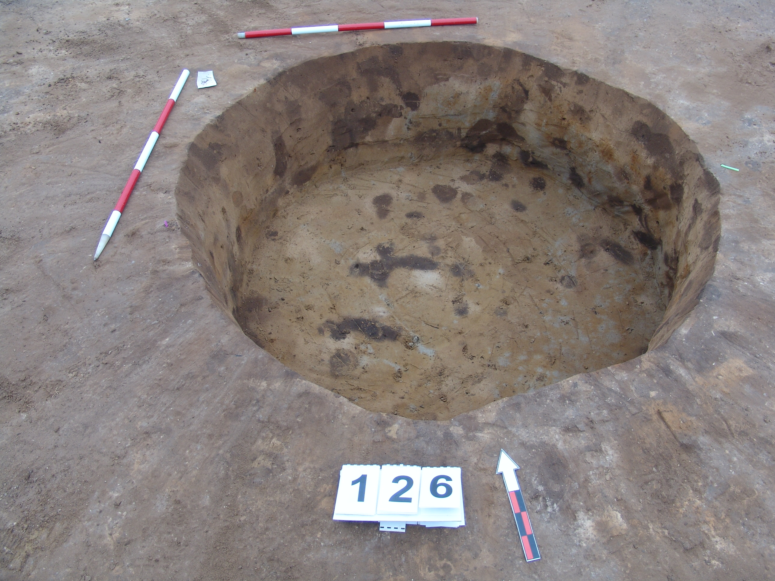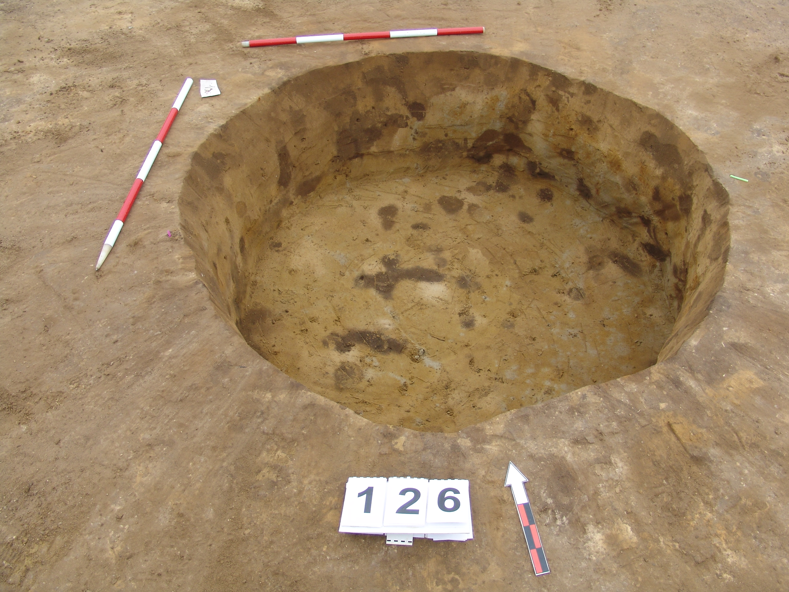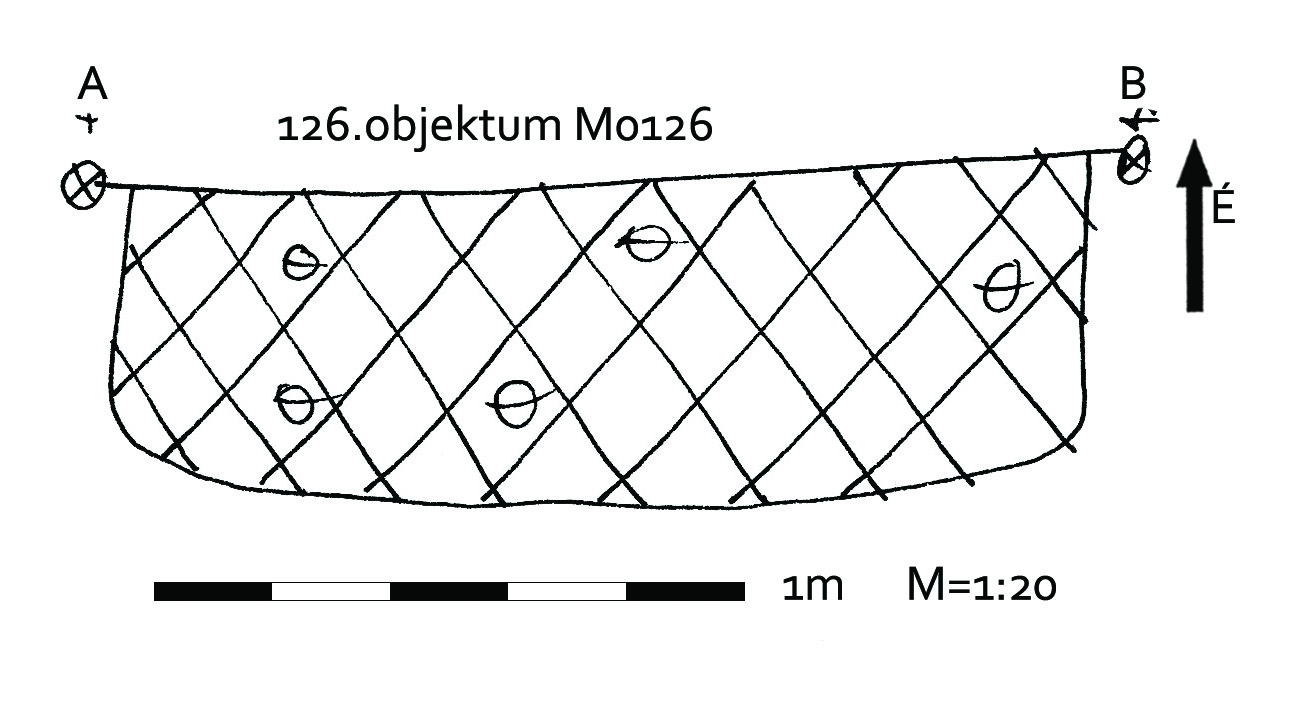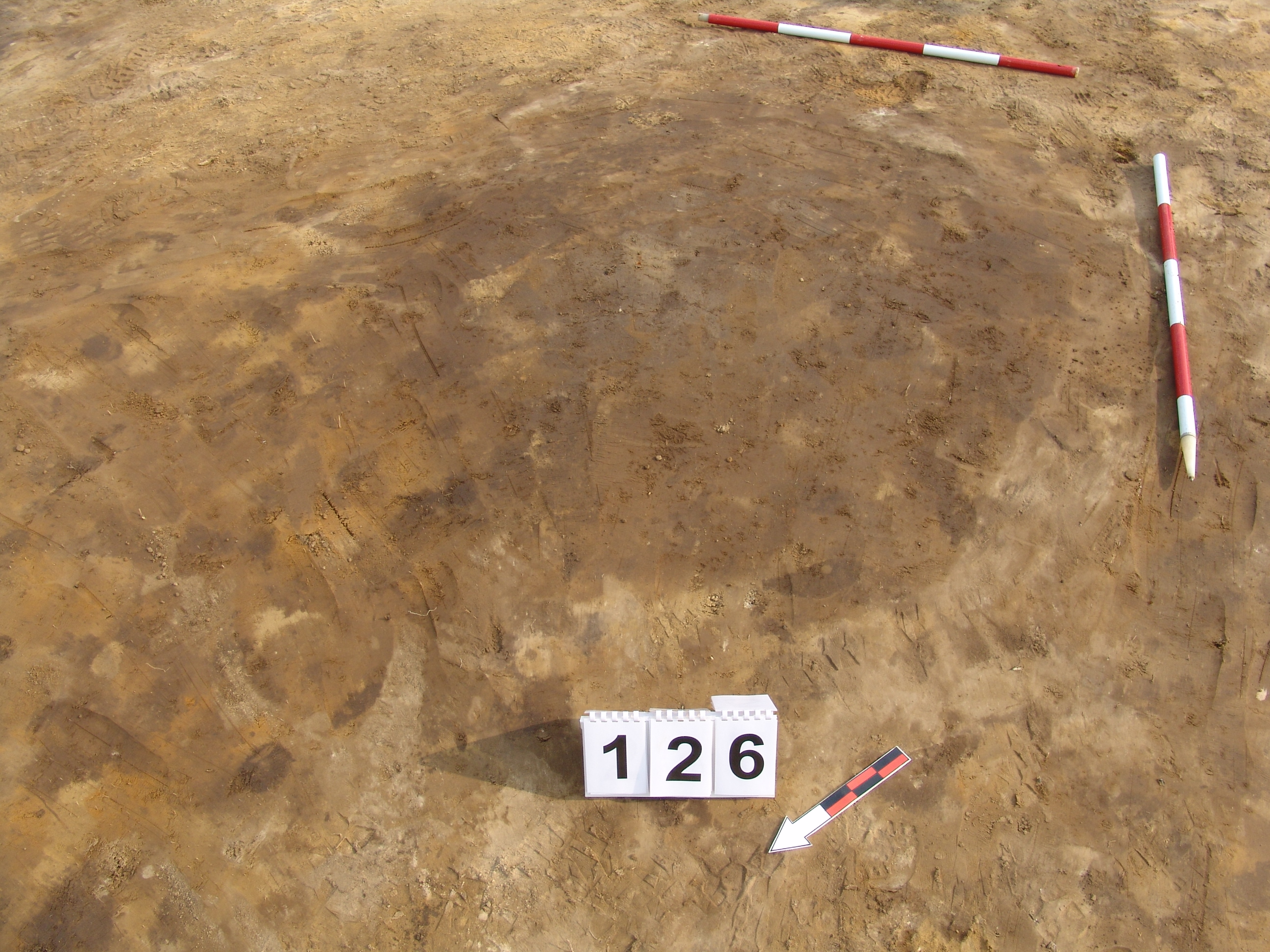 A 127 és 125 objektumok között jól elváló kerek folttal jelentkezik. Kör alaprajzú, méhkas alakú, egyenes aljú gödör. Betöltése egynemű sötét, barnásszürke. Átmérője fent Ny-K 175, D-É 176 cm, lent É-D 166, Ny-K 175 cm. Mélysége: 54 cm.